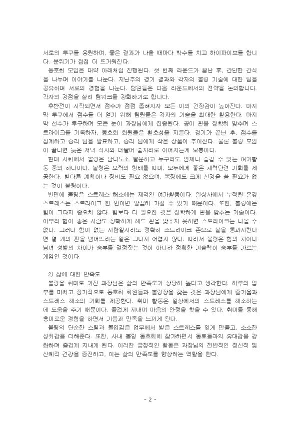 Ãë¹Ì´Â °³ÀÎÀÇ Áñ°Å¿òÀ» À§ÇÑ È°µ¿À» ¸»ÇÑ´Ù. Ãë¹ÌȰµ¿Àº °³ÀÎ ¶Ç´Â Áý´Ü¿¡ ÀÇÇØ µ¿±â°¡ ÁÖ¾îÁø Áñ°Å¿î Ȱµ¿À̸ç, Ȱ·ÂÀ» ȸº¹½ÃÄÑ ÀÏÀ» ÁغñÇϴ Ȱµ¿ÀÌ´Ù. ¶ÇÇÑ Ãë¹Ì¸¦ Áñ±â´Ù º¸¸é °°Àº ÃëÇâÀ» °¡Áø »ç¶÷À» ¸¸³ª°í Àΰ£°ü°è°¡ Çü¼ºµÈ´Ù. Çö´ëÀÎÀº Ãë¹ÌȰµ¿À» ÅëÇØ Àΰ£°ü°è¸¦ ¸ÎÀ½À¸·Î½á ÀÚ½ÅÀÇ À§Ä¡ ¹× »çȸ»ýȰÀ» À¯ÁöÇÑ´Ù. ÀÌ °úÁ¤À» ÅëÇØ »çȸ»ýȰÀ» ÀÍÈûÀ¸·Î½á ¹Ù¶÷Á÷ÇÑ ÀÚ½ÅÀÇ ¿ªÇÒÀ» ´ÙÇÒ ¼ö ÀÖµµ·Ï ÇÑ´Ù. Ãë¹Ì´Â ´Ü¼øÈ÷ ÀÏÇÏÁö ¾Ê´Â ½Ã°£/³²´Â ½Ã°£ÀÇ ¼Ò±ØÀûÀÎ Àǹ̿¡¼ ¹þ¾î³ª âÁ¶ÀûÀÎ »îÀ» À¯ÁöÇϰí ÀھƽÇÇöÀ» À§ÇÑ ±âȸ·Î Ȱ¿ëÇÒ ¼ö ÀÖ´Â ¸Å¿ì °¡Ä¡ ÀÖ´Â ÀÇ¹Ì·Î ÇØ¼®µÇ¾îÁö°í ÀÖ´Ù. Ãë¹Ì¿¡ °üÇÑ °ü½ÉÀÌ ¾îÁ¦¿Í ¿À´Ã¿¡ ½ÃÀÛµÈ °ÍÀº ¾Æ´ÏÁö¸¸, ¿À´Ã³¯°ú °°ÀÌ »ç¶÷µé¿¡°Ô Å« Àǹ̸¦ ºÎ¿©ÇØ ÁØ ÀûÀº ÀÏÂïÀÌ ¾ø¾ú´Ù. ¾÷¹«¸¦ ºñ·ÔÇØ °³ÀÎ »ýȰ¿¡¼µµ Ç×»ó ÇÒ ÀÏÀÌ ÀÖ´Ù°í ´À³¢¸ç ÂѱâµíÀÌ »ýȰÇÏ´Â Çö´ëÀο¡°Ô »ýȰÀ» À§ÇùÇÏ´Â °¡Àå Å« ÀûÀº ½ºÆ®·¹½ºÀÏ °ÍÀÌ´Ù. ¹«½¼ ÀÏÀ» Çϵç, ´©±¸¸¦ ¸¸³ªµç »ì´Ù º¸¸é Àڽŵµ ¸ð¸£´Â ½ºÆ®·¹½º°¡ ½×À̰í, À̸¦ ÇØ°áÇÏ·Á´Â ¹æ¹ýÀ» ã°Ô µÈ´Ù. »ç¶÷Àº ±âº»ÀûÀ¸·Î ¾îµò°¡¿¡ ¼Ò¼ÓµÇ°í ½Í¾î ÇÏ´Â ¼Ò¼Ó°¨ÀÇ ¿å±¸°¡ ÀÖ´Ù. µ¿È£È¸¿¡ °¡ÀÔÇÏ¸é °£Á¢ÀûÀ¸·Î ±×·± ¿å±¸µµ ÇØ°áµÈ´Ù. »çȸ¿¡¼ ¸Î¾îÁø ¸ðÀÓÀº ´ë°³ º¸ÀÌÁö ¾Ê´Â ÀÌÇØ°ü°è°¡ Çü¼ºµÇ±â ¸¶·ÃÀÌÁö¸¸ µ¿È£ÀεéÀº ±×·¸Áö ¾Ê±â ¶§¹®¿¡ ´õ¿í Ä£¹ÐÇÑ °ü°è·Î ¹ßÀüÇÒ ¼ö ÀÖ´Ù. ±âȸ´Â »ý°¢Áö ¸øÇÑ ¼ø°£¿¡ »ý°¢Áö ¸øÇÑ °÷¿¡¼ ¿À±â ¸¶·ÃÀÌ´Ù. ¿îÀÌ ÁÁ´Ù¸é µ¿È£È¸¸¦ ÅëÇØ °üÇÑ ÁÁÀº ¾ÆÀ̵ð¾î¸¦ ¾òÀ» ¼ö ÀÖÀ»Áöµµ ¸ð¸¥´Ù. ÀÌ ·¹Æ÷Æ®´Â ÁÖº¯¿¡¼ Ãë¹Ì¸¦ Áñ±â´Â »ç¶÷°ú º°´Ù¸¥ Ãë¹Ì¸¦ °¡Áö°í ÀÖÁö ¾ÊÀº »ç¶÷À» °ñ¶ó ºñ±³ÇØ ¼¼úÇÏ¿´´Ù. II. º» ·Ð 1. Ãë¹Ì¸¦ Áñ±â´Â »ç¶÷ 1) º¼¸µÀ» Áñ±â´Â °úÀå´Ô °úÀå´ÔÀº ¸ÅÁÖ ±Ý¿äÀÏ ¾÷¹«°¡ ³¡³ª¸é µ¿È£È¸ ȸ¿øµéÀ» ¸¸³ª·¯ º¼¸µÀå¿¡ °£´Ù. ÆòÀÏ¿¡µµ Ã¥»ó ¹Ø¿¡´Â º¼¸µ°ø°ú º¼¸µÈ¿Í Àå°© µîÀÌ Ç×»ó ÀÖ´Ù. ÆòÀÏ¿¡µµ º¼¸µ °ü·Ã À¯Æ©ºê¸¦ ½ÃûÇÑ´Ù. º¼¸µ ¸ðÀÓÀÌ ÀÖ´Â ³¯¿¡´Â °¢ÀÚ ÁغñÇÑ º¼¸µÈ¸¦ ½Å°í, ÀÚ½ÅÀÇ º¼¸µ°øÀ» È®ÀÎÇÑ´Ù. ȸ¿øµéÀº ºÒ±ÔÄ¢ÀûÀ¸·Î µÎ ÆÀÀ¸·Î ³ª´µ¾î °æ±â¸¦ ½ÃÀÛÇÑ´Ù. °¢ ÆÀÀÇ Ã¹ ¹øÂ° ¼±¼ö°¡ º¼¸µÀ» ½ÃÀÛÇÑ´Ù. ±äÀå°ú ±â´ë°¡ ¼¯ÀΠǥÁ¤À¸·Î º¼¸µ°øÀ» µé°í Åõ±¸¸¦ ÁغñÇÑ´Ù. °øÀ» ´øÁöÀÚ ½ºÇø´ÀÌ ³ª¿Í ¸ðµÎ°¡ ȯȣÇϱ⵵ ÇÑ´Ù. ÆÀ¿øµéÀº ¼·ÎÀÇ Åõ±¸¸¦ ÀÀ¿øÇϸç, ÁÁÀº °á°ú°¡ ³ª¿Ã ¶§¸¶´Ù ¹Ú¼ö¸¦ Ä¡°í ÇÏÀÌÆÄÀ̺긦 ÇÕ´Ï´Ù. ºÐÀ§±â°¡ Á¡Á¡ ´õ ¶ß°Å¿öÁø´Ù. µ¿È£È¸ ¸ðÀÓÀº ´ë·« ¾Æ·¡Ã³·³ ÁøÇàµÈ´Ù. ù ¹øÂ° ¶ó¿îµå°¡ ³¡³ ÈÄ, °£´ÜÇÑ °£½ÄÀ» ³ª´©¸ç À̾߱⸦ ³ª´«´Ù. Áö³ÁÖÀÇ °æ±â °á°ú¿Í °¢ÀÚÀÇ º¼¸µ ±â¼ú¿¡ ´ëÇÑ ÆÁÀ» °øÀ¯ÇÏ¸ç ¼·ÎÀÇ °æÇèÀ» ³ª´«´Ù. ÆÀ¿øµéÀº ´ÙÀ½ ¶ó¿îµå¿¡¼ÀÇ Àü·«À» ³íÀÇÇÕ´Ï´Ù. °¢ÀÚÀÇ °Á¡À» »ì·Á ÆÀ¿öÅ©¸¦ °ÈÇϱâ·Î ÇÕ´Ï´Ù. ÈĹÝÀüÀÌ ½ÃÀÛµÇ¸é¼ Á¡¼ö°¡ Á¡Á¡ Á¼ÇôÁöÀÚ ¸ðµç ÀÌÀÇ ±äÀå°¨ÀÌ ³ô¾ÆÁø´Ù. ¸¶Áö¸· Åõ±¸¿¡¼ Á¡¼ö¸¦ ´õ ¾ò±â À§ÇØ ÆÀ¿øµéÀº °¢ÀÚÀÇ ±â¼úÀ» ÃÖ´ëÇÑ È°¿ëÇÑ´Ù. ¸¶Áö¸· ¼±¼ö°¡ Åõ±¸ÇÏ¸ç ¸ðµç ´«ÀÌ °úÀå´Ô¿¡°Ô ÁýÁߵȴÙ. °øÀÌ ÇÉÀ» Á¤È®È÷ ¸ÂÃß¸ç ½ºÆ®¶óÀÌÅ©¸¦ ±â·ÏÇÏÀÚ, µ¿È£È¸ ȸ¿øµéÀº ȯȣ¼ºÀ» Áö¸¥´Ù. °æ±â°¡ ³¡³ ÈÄ, Á¡¼ö¸¦ Áý°èÇÏ°í ½Â¸® ÆÀÀ» ¹ßÇ¥Çϰí, ½Â¸® ÆÀ¿¡°Ô ÀÛÀº »óǰÀÌ ÁÖ¾îÁø´Ù. ¹°·Ð º¼¸µ ¸ðÀÓÀÌ ³¡³ª¸é ´ÊÀº Àú³á ½Ä»ç¿Í ´õºÒ¾î ¼úÀÚ¸®·Î À̾îÁö´Â°Ô º¸ÅëÀÌ´Ù. Çö´ë »çȸ¿¡¼ º¼¸µÀº ³²³à³ë¼Ò ºÒ¹®ÇÏ°í ´©±¸¶óµµ ¾ðÁ¦³ª Áñ±æ ¼ö ÀÖ´Â ¿©°¡È°µ¿ ÁßÀÇ ÇϳªÀÌ´Ù. º¼¸µÀº ¿À¶ôÀÇ ÇüŸ¦ ¶ì¸ç, ¸ðµÎ¿¡°Ô ÁÁÀº ü·Â´Ü·Ã ±âȸ¸¦ Á¦°øÇÑ´Ù. º°´Ù¸¥ °èȹÀ̳ª Àåºñµµ ÇÊ¿ä ¾øÀ¸¸ç, º¹Àå¿¡µµ Å©°Ô ½Å°æÀ» ¾µ Çʿ䰡 ¾ø´Â °ÍÀÌ º¼¸µÀÌ´Ù. ¹Ý¸é¿¡ º¼¸µÀº ½ºÆ®·¹½º ÇØ¼Ò¿¡´Â Á¦°ÝÀÎ ¿©°¡È°µ¿ÀÌ´Ù. ÀÏ»ó»ç¿¡¼ ´©ÀûµÈ ¿Â°® ½ºÆ®·¹½º´Â ½ºÆ®¶óÀÌÅ© ÇÑ ¹øÀÌ¸é ¸»²ûÈ÷ °¡½Ç ¼ö Àֱ⠶§¹®ÀÌ´Ù. ¶ÇÇÑ, º¼¸µ¿¡´Â ÈûÀÌ ±×´ÙÁö Áß¿äÄ¡ ¾Ê´Ù. Èûº¸´Ù ´õ ÇÊ¿äÇÑ °ÍÀº Á¤È®ÇÏ°Ô ÇÉÀ» ¸ÂÃß´Â ±â¼úÀÌ´Ù. ¾Æ¹«¸® ÈûÀÌ ÁÁÀº »ç¶÷µµ Á¤È®ÇÏ°Ô Çìµå ÇÉÀ» ¸ÂÃßÁö ¸øÇÏ¸é ½ºÆ®¶óÀÌÅ©´Â ³ª¿Ã ¼ö ¾ø´Ù. ±×·¯³ª ÈûÀÌ ¾ø´Â »ç¶÷ÀÏÁö¶óµµ Á¤È®È÷ ½ºÆ®¶óÀÌÅ© Á¸À¸·Î º