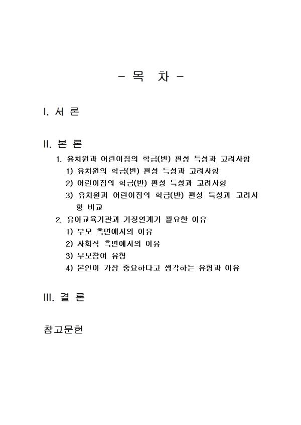 2. À¯¾Æ±³À°±â°ü°ú °¡Á¤¿¬°è°¡ ÇÊ¿äÇÑ ÀÌÀ¯¿¡ ´ëÇØ À¯¾Æ, ºÎ¸ð, »çȸÀû Ãø¸é¿¡¼ ±â¼úÇϰí, ´Ù¾çÇÑ ºÎ¸ðÂü¿© À¯Çü Áß º»ÀÎÀÌ °¡Àå Áß¿äÇÏ´Ù°í »ý°¢ÇÏ´Â 2°¡Áö¸¦ ¼±ÅÃÇÏ°í ±× ÀÌÀ¯¸¦ Á¦½ÃÇϽÿÀ. - ¸ñ Â÷ - I. ¼ ·Ð II. º» ·Ð 1. À¯Ä¡¿ø°ú ¾î¸°ÀÌÁýÀÇ ÇбÞ(¹Ý) Æí¼º Ư¼º°ú °í·Á»çÇ× 1) À¯Ä¡¿øÀÇ ÇбÞ(¹Ý) Æí¼º Ư¼º°ú °í·Á»çÇ× 2) ¾î¸°ÀÌÁýÀÇ ÇбÞ(¹Ý) Æí¼º Ư¼º°ú °í·Á»çÇ× 3) À¯Ä¡¿ø°ú ¾î¸°ÀÌÁýÀÇ ÇбÞ(¹Ý) Æí¼º Ư¼º°ú °í·Á»çÇ× ºñ±³ 2. À¯¾Æ±³À°±â°ü°ú °¡Á¤¿¬°è°¡ ÇÊ¿äÇÑ ÀÌÀ¯ 1) ºÎ¸ð Ãø¸é¿¡¼ÀÇ ÀÌÀ¯ 2) »çȸÀû Ãø¸é¿¡¼ÀÇ ÀÌÀ¯ 3) ºÎ¸ðÂü¿© À¯Çü 4) º»ÀÎÀÌ °¡Àå Áß¿äÇÏ´Ù°í »ý°¢ÇÏ´Â À¯Çü°ú ÀÌÀ¯ III. °á ·Ð Âü°í¹®Çå ** ÇÔ²² Á¦°øµÇ´Â Âü°íÀÚ·á ÇÑ±ÛÆÄÀÏ ** 1. º»ÀÎÀÌ °¡Àå Áß¿äÇÏ´Ù°í »ý°¢ÇÏ´Â À¯Çü°ú ÀÌÀ¯.hwp 2. º»ÀÎÀÌ °¡Àå Áß¿äÇÏ´Ù°í »ý°¢ÇÏ´Â À¯Çü°ú ÀÌÀ¯2.hwp 3. ¾î¸°ÀÌÁýÀÇ ÇбÞ(¹Ý) Æí¼º Ư¼º°ú °í·Á»çÇ×.hwp 4. ¾î¸°ÀÌÁýÀÇ ÇбÞ(¹Ý) Æí¼º Ư¼º°ú °í·Á»çÇ×2.hwp 5. À¯¾Æ±³À°±â°ü°ú °¡Á¤¿¬°è°¡ ÇÊ¿äÇÑ ÀÌÀ¯.hwp 6. À¯¾Æ±³À°±â°ü°ú °¡Á¤¿¬°è°¡ ÇÊ¿äÇÑ ÀÌÀ¯2.hwp 7. À¯Ä¡¿ø°ú ¾î¸°ÀÌÁýÀÇ ÇбÞ(¹Ý) Æí¼º Ư¼º°ú °í·Á»çÇ× ºñ±³.hwp 8. À¯Ä¡¿ø°ú ¾î¸°ÀÌÁýÀÇ ÇбÞ(¹Ý) Æí¼º Ư¼º°ú °í·Á»çÇ× ºñ±³2.hwp 9. À¯Ä¡¿øÀÇ ÇбÞ(¹Ý) Æí¼º Ư¼º°ú °í·Á»çÇ×.hwp 10. À¯Ä¡¿øÀÇ ÇбÞ(¹Ý) Æí¼º Ư¼º°ú °í·Á»çÇ×2.hwp 11. ¼·Ð ÀÛ¼º½Ã ÂüÁ¶.hwp 12. °á·Ð ÀÛ¼º½Ã ÂüÁ¶.hwp 13. ¼·Ð ÀÛ¼º½Ã ÂüÁ¶2.hwp 14. °á·Ð ÀÛ¼º½Ã ÂüÁ¶2.hwp ¢ºÀÚ·á³»¿ë ¹Ì¸®º¸±â