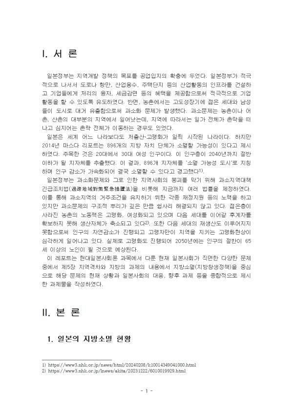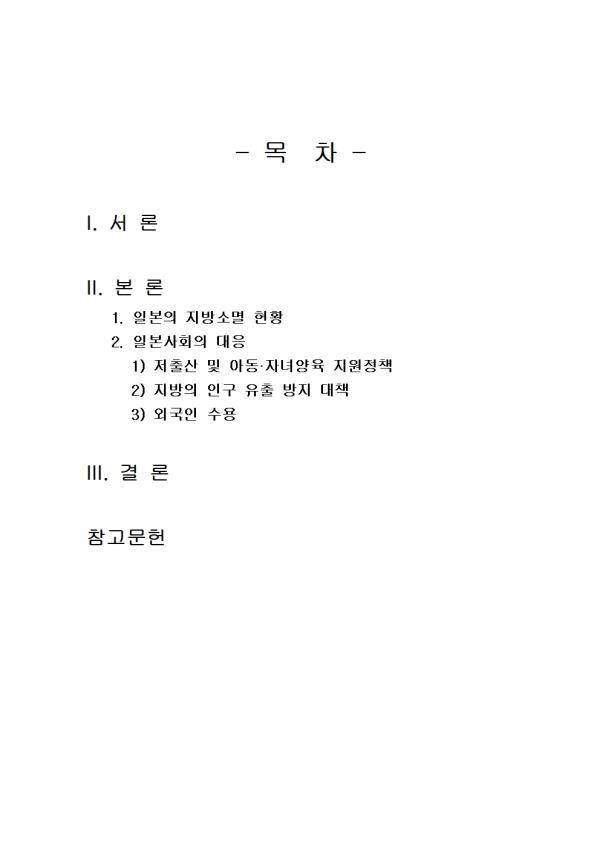 1. ¼·Ð¿¡¼ º»ÀÎÀÇ ¹®Á¦ÀǽÄÀ» ¹àÈ÷°í, º»·Ð¿¡¼ ±¸Ã¼ÀûÀÎ µ¥ÀÌÅÍ¿¡ ÀǰÅÇØ º»ÀÎÀÇ ÁÖÀåÀ» ³í¸®ÀûÀ¸·Î Á¦½ÃÇϰí, °á·Ð¿¡¼ Áö±Ý±îÁöÀÇ ºÐ¼®À» ÅëÇØ ¾Ë°Ô µÈ °Í, ÇâÈÄ °úÁ¦ µîÀ» Á¦½ÃÇÑ´Ù. 2. ±¸Ã¼ÀûÀÎ µ¥ÀÌÅ͸¦ ¼öÄ¡·Î Á¦½ÃÇϰí, Âü°íÇÑ ÀÚ·áÀÇ Ãâó¸¦ ¹àÈù´Ù(ÀÎÅÍ³Ý ÀÚ·áÀÇ °æ¿ì Ãâó¸¦ È®ÀÎÇÒ ¼ö ÀÖµµ·Ï ¸µÅ© ÁÖ¼Ò¸¦ Á¦½Ã). 3. »ý¼ºÇü ÀΰøÁö´ÉÀ» º¸Á¶ÀûÀ¸·Î Ȱ¿ëÇÒ ¼ö ÀÖÁö¸¸ »ç¿ë ¿©ºÎ¿Í Ãâó µîÀ» ¸íÈ®È÷ Ç¥±âÇϰí, º»ÀÎÀÇ ¸»·Î ¹®Á¦Àǽİú ÇÙ½ÉÁÖÀåÀÌ ¸íÈ®È÷ µå·¯³ªµµ·Ï ÀÛ¼ºÇÑ´Ù. 4. ºÐ·®Àº ±ÛÀÚ °ø¹éÀ» Æ÷ÇÔÇØ 4,000ÀÚ ³»¿Ü·Î ÀÛ¼ºÇÑ´Ù. - ¸ñ Â÷ - I. ¼ ·Ð II. º» ·Ð 1. ÀϺ»ÀÇ Áö¹æ¼Ò¸ê ÇöȲ 2. ÀϺ»»çȸÀÇ ´ëÀÀ 1) ÀúÃâ»ê ¹× ¾Æµ¿¡¤ÀÚ³à¾çÀ° Áö¿øÁ¤Ã¥ 2) Áö¹æÀÇ Àα¸ À¯Ãâ ¹æÁö ´ëÃ¥ 3) ¿Ü±¹ÀÎ ¼ö¿ë III. °á ·Ð Âü°í¹®Çå ** ÇÔ²² Á¦°øµÇ´Â Âü°íÀÚ·á ÇÑ±ÛÆÄÀÏ ** 1. °æÁ¦¡¤»çȸ¿¡ ¹ÌÄ¡´Â ¿µÇâ.hwp 2. »çȸ¡¤°æÁ¦Àû ¿µÇâ.hwp 3. ÀϺ» Àα¸±¸Á¶ º¯È¿Í ÇöȲ.hwp 4. ÀϺ» ÀúÃâ»ê¡¤°í·ÉÈÀÇ ÇöÀç »óȲ.hwp 5. ÀϺ»»çȸÀÇ ´ëÀÀ.hwp 6. ÀúÃâ»ý¡¤°í·ÉÈÀÇ ¿øÀÎ.hwp 7. Á¤Ã¥ È¿°ú¿Í ÇѰè.hwp 8. ¼·Ð ÀÛ¼º½Ã ÂüÁ¶.hwp 9. °á·Ð ÀÛ¼º½Ã ÂüÁ¶.hwp 10. ¼·Ð ÀÛ¼º½Ã ÂüÁ¶2.hwp 11. °á·Ð ÀÛ¼º½Ã ÂüÁ¶2.hwp ¢ºÀÚ·á³»¿ë ¹Ì¸®º¸±â