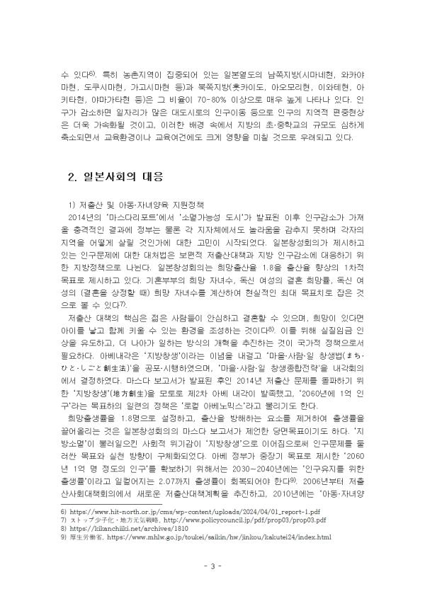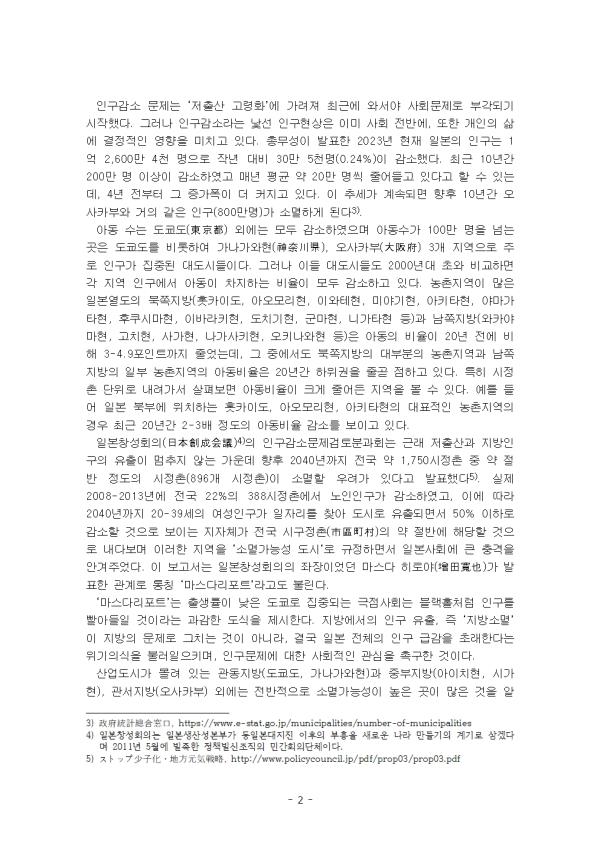 ÀϺ»Á¤ºÎ´Â Áö¿ª°³¹ß Á¤Ã¥ÀÇ ¸ñÇ¥¸¦ °ø¾÷ÀÔÁöÀÇ È®Ãæ¿¡ µÎ¾ú´Ù. ÀϺ»Á¤ºÎ°¡ Àû±ØÀûÀ¸·Î ³ª¼¼ µµ·Î³ª Ç׸¸, »ê¾÷¿ë¼ö, ÁÖÅôÜÁö µîÀÇ »ê¾÷Ȱµ¿ÀÇ ÀÎÇÁ¶ó¸¦ °Ç¼³ÇÏ°í ±â¾÷µé¿¡°Ô Àú¸®ÀÇ À¶ÀÚ, ¼¼±Ý°¨¸é µîÀÇ ÇýÅÃÀ» Á¦°øÇÔÀ¸·Î½á Àû±ØÀûÀ¸·Î ±â¾÷Ȱµ¿À» ÇÒ ¼ö ÀÖµµ·Ï À¯µµÇÏ¿´´Ù. ¹Ý¸é, ³óÃÌ¿¡¼´Â °íµµ¼ºÀå±â¿¡ ÀþÀº ¼¼´ë¿Í ³²¼ºµéÀÌ µµ½Ã·Î ´ë°Å À¯ÃâÇÔÀ¸·Î½á °ú¼ÒÈ ¹®Á¦°¡ ¹ß»ýÇß´Ù. °ú¼Ò¹®Á¦´Â ³óÃÌÀ̳ª ¾îÃÌ, »êÃÌÀÇ ´ëºÎºÐÀÇ Áö¿ª¿¡¼ ÀϾ´Âµ¥, Áö¿ª¿¡ µû¶ó¼´Â Àϰ¡ Àüü°¡ Ã̶ôÀ» ¶°³ª°í ½ÉÁö¾î´Â Ã̶ô Àüü°¡ À̵¿ÇÏ´Â °æ¿ìµµ ÀÖ¾ú´Ù. ÀϺ»Àº ¼¼°è ¾î´À ³ª¶óº¸´Ùµµ ÀúÃâ»ê¡¤°í·ÉȰ¡ ÀÏÂï ½ÃÀÛµÈ ³ª¶óÀÌ´Ù. ÇÏÁö¸¸ 2014³â ¸¶½º´Ù ¸®Æ÷Æ®´Â 896°³ÀÇ Áö¹æ ÀÚÄ¡ ´Üü°¡ ¼Ò¸êÇÒ °¡´É¼ºÀÌ ÀÖ´Ù°í Á¦½ÃÇÏ¿´´Ù. ÁÖ¸ñÇÑ °ÍÀº 20´ë¿¡¼ 30´ë ¿©¼º Àα¸ÀÌ´Ù. ÀÌ Àα¸ÃþÀÌ 2040³â±îÁö Àý¹Ý ÀÌÇϰ¡ µÉ ÁöÀÚü¸¦ ÃßÃâÇß´Ù. ÀÌ °á°ú, 896°³ ÁöÀÚü¸¦ '¼Ò¸ê °¡´É¼º µµ½Ã'·Î ÁöĪÇϸç Àα¸ °¨¼Ò°¡ °¡¼ÓÈµÇ¾î °á±¹ ¼Ò¸êÇÒ ¼ö ÀÖ´Ù°í °æ°íÇß´Ù. ÀϺ»Á¤ºÎ´Â °ú¼Òȹ®Á¦¿Í ±×·Î ÀÎÇÑ Áö¿ª»çȸÀÇ ºØ±«¸¦ ¸·±â À§ÇØ °ú¼ÒÁö¿ª´ëÃ¥±ä±ÞÁ¶Ä¡¹ý(ΦáÃò¢æ´ÓßóþÑÌÐáðÂöÇÛö)À» ºñ·ÔÇØ Áö±Ý±îÁö ¿©·¯ ¹ý·üÀ» Á¦Á¤ÇÏ¿´´Ù. À̸¦ ÅëÇØ °ú¼ÒÁö¿ªÀÇ °ÅÁÖÁ¶°ÇÀ» À¯ÁöÇϱâ À§ÇÑ °¢Á¾ ÀçÁ¤Áö¿ø µîÀÇ ³ë·ÂÀ» Çϰí ÀÖÁö¸¸ °ú¼Ò¹®Á¦ÀÇ ±¸Á¶Àû »Ñ¸®°¡ ±íÀº ¸¸Å ½±»ç¸® ÇØ°áµÇÁö ¾Ê°í ÀÖ´Ù. ÀþÀºÃþÀÌ »ç¶óÁø ³óÃÌÀÇ ³ëµ¿·ÂÀº °í·ÉÈ, ¿©¼ºÈµÇ°í ÀÖÀ¸¸ç ´ÙÀ½ ¼¼´ë¸¦ À̾ ÈİèÀÚ¸¦ È®º¸ÇÏÁö ¸øÇØ »ý»êÀÚü°¡ Ãà¼ÒµÇ°í ÀÖ´Ù. ¶ÇÇÑ ´ÙÀ½ ¼¼´ëÀÇ Àç»ý»êµµ ÀÌ·ç¾îÁöÁö ¸øÇÔÀ¸·Î½á Àα¸ÀÇ ÀÚ¿¬°¨¼Ò°¡ ÁøÇàµÇ°í °í·ÉÀÚ¸¸ÀÌ Áö¿ªÀ» ÁöŰ´Â °í·ÉÈÇö»óÀÌ ½É°¢ÇÏ°Ô ÀϾ°í ÀÖ´Ù. ½ÇÁ¦·Î °í·Éȵµ ÁøÇàµÇ¾î 2050³â¿¡´Â Àα¸ÀÇ Àý¹ÝÀÌ 65¼¼ ÀÌ»óÀÇ ³ëÀÎÀÌ µÉ °ÍÀ¸·Î ¿¹»óµÈ´Ù. ÀÌ ·¹Æ÷Æ®´Â Çö´ëÀϺ»»çȸ·Ð °ú¸ñ¿¡¼ ´Ù·é ÇöÀç ÀϺ»»çȸ°¡ Á÷¸éÇÑ ´Ù¾çÇÑ ¹®Á¦ Áß¿¡¼ Á¦5Àå Áö¿ª°ÝÂ÷¿Í Áö¹æÀÇ °úÁ¦ÀÇ ³»¿ë¿¡¼ Áö¹æ¼Ò¸ê(Áö¹æÃ¢»ýÁ¤Ã¥)À» Áß½ÉÀ¸·Î ÇØ´ç ¹®Á¦ÀÇ ÇöÀç »óȲ°ú ÀϺ»»çȸÀÇ ´ëÀÀ, ÇâÈÄ °úÁ¦ µîÀ» Á¾ÇÕÀûÀ¸·Î Á¦½ÃÇÑ °úÁ¦¹°À» ÀÛ¼ºÇÏ¿´´Ù. II. º» ·Ð 1. ÀϺ»ÀÇ Áö¹æ¼Ò¸ê ÇöȲ Àα¸°¨¼Ò ¹®Á¦´Â ¡®ÀúÃâ»ê °í·ÉÈ¡¯¿¡ °¡·ÁÁ® ÃÖ±Ù¿¡ ¿Í¼¾ß »çȸ¹®Á¦·Î ºÎ°¢µÇ±â ½ÃÀÛÇß´Ù. ±×·¯³ª Àα¸°¨¼Ò¶ó´Â ³¸¼± Àα¸Çö»óÀº ÀÌ¹Ì »çȸ Àü¹Ý¿¡, ¶ÇÇÑ °³ÀÎÀÇ »î¿¡ °áÁ¤ÀûÀÎ ¿µÇâÀ» ¹ÌÄ¡°í ÀÖ´Ù. Ãѹ«¼ºÀÌ ¹ßÇ¥ÇÑ 2023³â ÇöÀç ÀϺ»ÀÇ Àα¸´Â 1¾ï 2,600¸¸ 4õ ¸íÀ¸·Î À۳⠴ëºñ 30¸¸ 5õ¸í(0.24%)ÀÌ °¨¼ÒÇß´Ù. ÃÖ±Ù 10³â°£ 200¸¸ ¸í ÀÌ»óÀÌ °¨¼ÒÇÏ¿´°í ¸Å³â Æò±Õ ¾à 20¸¸ ¸í¾¿ ÁÙ¾îµé°í ÀÖ´Ù°í ÇÒ ¼ö Àִµ¥, 4³â ÀüºÎÅÍ ±× Áõ°¡ÆøÀÌ ´õ Ä¿Áö°í ÀÖ´Ù. ÀÌ Ãß¼¼°¡ °è¼ÓµÇ¸é ÇâÈÄ 10³â°£ ¿À»çÄ«ºÎ¿Í °ÅÀÇ °°Àº Àα¸(800¸¸¸í)°¡ ¼Ò¸êÇÏ°Ô µÈ´Ù. ¾Æµ¿ ¼ö´Â µµÄìµµ(ÔÔÌÈÔ´) ¿Ü¿¡´Â ¸ðµÎ °¨¼ÒÇÏ¿´À¸¸ç ¾Æµ¿¼ö°¡ 100¸¸ ¸íÀ» ³Ñ´Â °÷Àº µµÄìµµ¸¦ ºñ·ÔÇÏ¿© °¡³ª°¡¿ÍÇö(ãêÒ¯ô¹県), ¿À»çÄ«ºÎ(ÓÞø¡Ý¤) 3°³ Áö¿ªÀ¸·Î ÁÖ·Î Àα¸°¡ ÁýÁßµÈ ´ëµµ½ÃµéÀÌ´Ù. ±×·¯³ª ÀÌµé ´ëµµ½Ãµéµµ 2000³â´ë ÃÊ¿Í ºñ±³ÇÏ¸é °¢ Áö¿ª Àα¸¿¡¼ ¾Æµ¿ÀÌ Â÷ÁöÇÏ´Â ºñÀ²ÀÌ ¸ðµÎ °¨¼ÒÇϰí ÀÖ´Ù. ³óÃÌÁö¿ªÀÌ ¸¹Àº ÀϺ»¿µµÀÇ ºÏÂÊÁö¹æ(ȪīÀ̵µ, ¾Æ¿À¸ð¸®Çö, ÀÌ¿ÍÅ×Çö, ¹Ì¾ß±âÇö, ¾ÆÅ°Å¸Çö, ¾ß¸¶°¡Å¸Çö, ÈÄÄí½Ã¸¶Çö, À̹ٶóŰÇö, µµÄ¡±âÇö, ±º¸¶Çö, ´Ï°¡Å¸Çö µî)°ú ³²ÂÊÁö¹æ(¿ÍÄ«¾ß¸¶Çö, °íÄ¡Çö, »ç°¡Çö, ³ª°¡»çŰÇö, ¿ÀŰ³ª¿ÍÇö µî)Àº ¾Æµ¿ÀÇ ºñÀ²ÀÌ 20³â Àü¿¡ ºñÇØ 3-4.9Æ÷ÀÎÆ®±îÁö ÁÙ¾ú´Âµ¥, ±× Áß¿¡¼µµ ºÏÂÊÁö¹æÀÇ ´ëºÎºÐÀÇ ³óÃÌÁö¿ª°ú ³²ÂÊÁö¹æÀÇ ÀϺΠ³óÃÌÁö¿ªÀÇ ¾Æµ¿ºñÀ²Àº 20³â°£ ÇÏÀ§±ÇÀ» ÁÙ°ð Á¡Çϰí ÀÖ´Ù. ƯÈ÷ ½ÃÁ¤ÃÌ ´ÜÀ§·Î ³»·Á°¡¼ »ìÆìº¸¸é ¾Æµ¿ºñÀ²ÀÌ Å©°Ô ÁÙ¾îµç Áö¿ªÀ» º¼ ¼ö ÀÖ´Ù. ¿¹¸¦ µé¾î ÀϺ» ºÏºÎ¿¡ À§Ä¡Çϴ ȪīÀ̵µ, ¾Æ¿À¸ð¸®Çö, ¾ÆÅ°Å¸ÇöÀÇ ´ëÇ¥ÀûÀÎ ³óÃÌÁö¿ªÀÇ °æ¿ì ÃÖ±Ù 20³â°£ 2-3¹è Á¤µµÀÇ ¾Æµ¿ºñÀ² °¨¼Ò¸¦ º¸À̰í ÀÖ´Ù. ÀϺ»Ã¢¼ºÈ¸ÀÇ(ìíÜâóÜà÷会ì¡) ÀϺ»Ã¢¼ºÈ¸ÀÇ´Â ÀϺ»»ý»ê¼ºº»ºÎ°¡ µ¿ÀϺ»´ëÁöÁø ÀÌÈÄÀÇ ºÎÈïÀ» »õ·Î¿î ³ª¶ó ¸¸µé±âÀÇ °è±â·Î »ï°Ú´Ù¸ç 2011³â 5¿ù¿¡ ¹ßÁ·ÇÑ Á¤Ã¥¹ß½ÅÁ¶Á÷ÀÇ ¹Î°£È¸ÀÇ´ÜüÀÌ´Ù. ÀÇ Àα¸°¨¼Ò¹®Á¦°ËÅäºÐ°ú