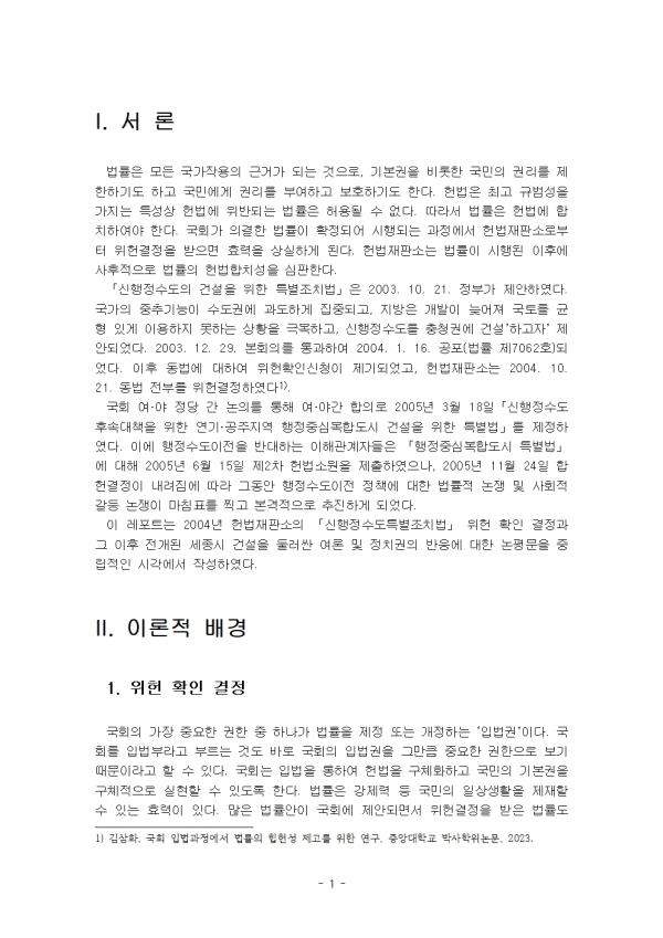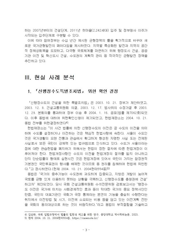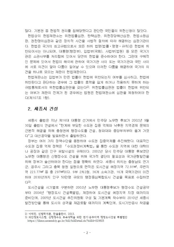 ¹ý·üÀº ¸ðµç ±¹°¡ÀÛ¿ëÀÇ ±Ù°Å°¡ µÇ´Â °ÍÀ¸·Î, ±âº»±ÇÀ» ºñ·ÔÇÑ ±¹¹ÎÀÇ ±Ç¸®¸¦ Á¦ÇÑÇϱ⵵ ÇÏ°í ±¹¹Î¿¡°Ô ±Ç¸®¸¦ ºÎ¿©ÇÏ°í º¸È£Çϱ⵵ ÇÑ´Ù. Çå¹ýÀº ÃÖ°í ±Ô¹ü¼ºÀ» °¡Áö´Â Ư¼º»ó Çå¹ý¿¡ À§¹ÝµÇ´Â ¹ý·üÀº Çã¿ëµÉ ¼ö ¾ø´Ù. µû¶ó¼ ¹ý·üÀº Çå¹ý¿¡ ÇÕÄ¡ÇÏ¿©¾ß ÇÑ´Ù. ±¹È¸°¡ ÀǰáÇÑ ¹ý·üÀÌ È®Á¤µÇ¾î ½ÃÇàµÇ´Â °úÁ¤¿¡¼ Çå¹ýÀçÆÇ¼Ò·ÎºÎÅÍ À§Çå°áÁ¤À» ¹ÞÀ¸¸é È¿·ÂÀ» »ó½ÇÇÏ°Ô µÈ´Ù. Çå¹ýÀçÆÇ¼Ò´Â ¹ý·üÀÌ ½ÃÇàµÈ ÀÌÈÄ¿¡ »çÈÄÀûÀ¸·Î ¹ý·üÀÇ Çå¹ýÇÕÄ¡¼ºÀ» ½ÉÆÇÇÑ´Ù. ¡¸½ÅÇàÁ¤¼öµµÀÇ °Ç¼³À» À§ÇÑ Æ¯º°Á¶Ä¡¹ý¡¹Àº 2003. 10. 21. Á¤ºÎ°¡ Á¦¾ÈÇÏ¿´´Ù. ±¹°¡ÀÇ ÁßÃß±â´ÉÀÌ ¼öµµ±Ç¿¡ °úµµÇÏ°Ô ÁýÁߵǰí, Áö¹æÀº °³¹ßÀÌ ´Ê¾îÁ® ±¹Å並 ±ÕÇü ÀÖ°Ô ÀÌ¿ëÇÏÁö ¸øÇÏ´Â »óȲÀ» ±Øº¹Çϰí, ½ÅÇàÁ¤¼öµµ¸¦ ÃæÃ»±Ç¿¡ °Ç¼³¡¯ÇϰíÀÚ¡¯ Á¦¾ÈµÇ¾ú´Ù. 2003. 12. 29. º»È¸ÀǸ¦ Åë°úÇÏ¿© 2004. 1. 16. °øÆ÷(¹ý·ü Á¦7062È£)µÇ¾ú´Ù. ÀÌÈÄ µ¿¹ý¿¡ ´ëÇÏ¿© À§ÇåÈ®ÀνÅûÀÌ Á¦±âµÇ¾ú°í, Çå¹ýÀçÆÇ¼Ò´Â 2004. 10. 21. µ¿¹ý ÀüºÎ¸¦ À§Çå°áÁ¤ÇÏ¿´´Ù. ±¹È¸ ¿©¡¤¾ß Á¤´ç °£ ³íÀǸ¦ ÅëÇØ ¿©¡¤¾ß°£ ÇÕÀÇ·Î 2005³â 3¿ù 18ÀÏ¡¸½ÅÇàÁ¤¼öµµ ÈļӴëÃ¥À» À§ÇÑ ¿¬±â¡¤°øÁÖÁö¿ª ÇàÁ¤Á߽ɺ¹ÇÕµµ½Ã °Ç¼³À» À§ÇÑ Æ¯º°¹ý¡¹¸¦ Á¦Á¤ÇÏ¿´´Ù. ÀÌ¿¡ ÇàÁ¤¼öµµÀÌÀüÀ» ¹Ý´ëÇÏ´Â ÀÌÇØ°ü°èÀÚµéÀº ¡¸ÇàÁ¤Á߽ɺ¹ÇÕµµ½Ã Ưº°¹ý¡¹¿¡ ´ëÇØ 2005³â 6¿ù 15ÀÏ Á¦2Â÷ Çå¹ý¼Ò¿øÀ» Á¦ÃâÇÏ¿´À¸³ª, 2005³â 11¿ù 24ÀÏ ÇÕÇå°áÁ¤ÀÌ ³»·ÁÁü¿¡ µû¶ó ±×µ¿¾È ÇàÁ¤¼öµµÀÌÀü Á¤Ã¥¿¡ ´ëÇÑ ¹ý·üÀû ³íÀï ¹× »çȸÀû °¥µî ³íÀïÀÌ ¸¶Ä§Ç¥¸¦ Âï°í º»°ÝÀûÀ¸·Î ÃßÁøÇÏ°Ô µÇ¾ú´Ù. ÀÌ ·¹Æ÷Æ®´Â 2004³â Çå¹ýÀçÆÇ¼ÒÀÇ ¡¸½ÅÇàÁ¤¼öµµÆ¯º°Á¶Ä¡¹ý¡¹ À§Çå È®ÀÎ °áÁ¤°ú ±× ÀÌÈÄ Àü°³µÈ ¼¼Á¾½Ã °Ç¼³À» µÑ·¯½Ñ ¿©·Ð ¹× Á¤Ä¡±ÇÀÇ ¹ÝÀÀ¿¡ ´ëÇÑ ³íÆò¹®À» Á߸³ÀûÀÎ ½Ã°¢¿¡¼ ÀÛ¼ºÇÏ¿´´Ù. II. ÀÌ·ÐÀû ¹è°æ 1. À§Çå È®ÀÎ °áÁ¤ ±¹È¸ÀÇ °¡Àå Áß¿äÇÑ ±ÇÇÑ Áß Çϳª°¡ ¹ý·üÀ» Á¦Á¤ ¶Ç´Â °³Á¤ÇÏ´Â ¡®ÀÔ¹ý±Ç¡¯ÀÌ´Ù. ±¹È¸¸¦ ÀÔ¹ýºÎ¶ó°í ºÎ¸£´Â °Íµµ ¹Ù·Î ±¹È¸ÀÇ ÀÔ¹ý±ÇÀ» ±×¸¸Å Áß¿äÇÑ ±ÇÇÑÀ¸·Î º¸±â ¶§¹®À̶ó°í ÇÒ ¼ö ÀÖ´Ù. ±¹È¸´Â ÀÔ¹ýÀ» ÅëÇÏ¿© Çå¹ýÀ» ±¸Ã¼ÈÇÏ°í ±¹¹ÎÀÇ ±âº»±ÇÀ» ±¸Ã¼ÀûÀ¸·Î ½ÇÇöÇÒ ¼ö ÀÖµµ·Ï ÇÑ´Ù. ¹ý·üÀº °Á¦·Â µî ±¹¹ÎÀÇ ÀÏ»ó»ýȰÀ» Á¦ÀçÇÒ ¼ö ÀÖ´Â È¿·ÂÀÌ ÀÖ´Ù. ¸¹Àº ¹ý·ü¾ÈÀÌ ±¹È¸¿¡ Á¦¾ÈµÇ¸é¼ À§Çå°áÁ¤À» ¹ÞÀº ¹ý·üµµ ¸¹´Ù. ±âº»±Ç µî Çå¹ýÀû ±Ç¸®¸¦ Ä§ÇØ´çÇß´Ù°í ÆÇ´ÜÇÑ ±¹¹ÎµéÀÇ À§Çå½ÅûÀÌ ¸¹¾Ò´Ù. Çå¹ý»óÀÇ Çå¹ýÀçÆÇ¼Ò´Â À§Çå¹ý·ü½ÉÆÇ, źÇÙ½ÉÆÇ, À§ÇåÁ¤´çÇØ»ê½ÉÆÇ, Çå¹ý¼Ò¿ø½ÉÆÇ, ±ÇÇÑÀïÀÇ½ÉÆÇ°ú °°Àº Á¤Ä¡Àû »ç°ÇÀ» »ç¹ýÀû ÀýÂ÷¿¡ µû¶ó ÇØ°áÇÏ´Â ½ÉÆÇ±â°üÀÌ´Ù. Çå¹ýÀº ±¹°¡ÀÇ ÃÖ°í±Ô¹üÀ¸·Î¼ ¸ðµç ÇÏÀ§ ¹ý·É(¹ý·ü¤ý¸í·É¤ý±ÔÄ¢)Àº Çå¹ý¿¡ À§¹ÝµÇ¾î¼´Â ¾Æ´ÏµÇ¸ç, ´ëÅë·É(ÇàÁ¤ºÎ), ÀÔ¹ýºÎ(±¹È¸), »ç¹ýºÎ(¹ý¿ø) µî ¸ðµç ±¹°¡±â°üÀº ¼Ò°ü»ç¹«¸¦ ó¸®ÇÔ¿¡ ÀÖ¾î¼ ´ç¿¬È÷ Çå¹ýÀ» ÁؼöÇÏ¿©¾ß ÇÑ´Ù. ±×·±µ¥ ±¸Ã¼ÀûÀÎ ¹®Á¦¿¡ ÀÖ¾î¼ Çå¹ýÀÇ ÇØ¼®¿¡ °üÇÏ¿© ±¹°¡±â°ü »çÀÌ ¶Ç´Â ±¹°¡±â°ü°ú ±¹¹Î »çÀÌ¿¡ ¼·Î ÀǰßÀÌ ´Þ¶ó ´ÙÅùÀÌ ÀϾ ¼ö ÀÖÀ¸¸ç ÀÌ·¯ÇÑ ´ÙÅùÀ» ÇØ°áÇÏ¿© ±¹°¡ÀÇ ÀǰßÀ» Çϳª·Î ¸ðÀ¸´Â ÀçÆÇÀÌ Çå¹ýÀçÆÇÀÌ´Ù. Çå¹ýÀçÆÇ¼Ò´Â ÀÔ¹ýºÎ°¡ ¸¸µç ¹ý·üÀÌ Çå¹ý¿¡ À§¹ÝµÇ´ÂÁö ¿©ºÎ¸¦ ½É»çÇϰí, Çå¹ý¿¡ À§¹ÝµÈ´Ù°í ÆÇ´ÜÇÏ´Â °æ¿ì¿¡ ±× ¹ý·üÀÇ È¿·ÂÀ» ÀÒ°Ô Çϰųª Àû¿ëÇÏÁö ¸øÇÏ°Ô ÇÏ´Â ±Ô¹üÅëÁ¦·Î¼ÀÇ À§Çå¹ý·ü½ÉÆÇ±ÇÀ» °®´Â´Ù. À§Çå¹ý·ü½ÉÆÇ±Ç ¹ý·üÀÌ Çå¹ý¿¡ À§¹ÝµÇ´Â ¿©ºÎ°¡ ÀçÆÇÀÇ ÀüÁ¦°¡ µÈ °æ¿ì¿¡´Â ¹ý¿øÀº Çå¹ýÀçÆÇ¼Ò¿¡ ½ÉÆÇÀ» Á¦Ã»ÇÏ¿©¾ß ÇÑ´Ù(Á¦107Á¶ 1Ç×). 2. ¼¼Á¾½Ã °Ç¼³ ¼¼Á¾½Ã Ãâ¹üÀº Áö³ Á¦16´ë ´ëÅë·É ¼±°Å¿¡¼ ¹ÎÁÖ´ç ³ë¹«Çö È帰¡ 2002³â 9¿ù 30ÀÏ Ãâ¹ü½Ä ¿¬¼³¿¡¼ ¡°ÇѰ迡 ºÎµúÈù ¼öµµ±Ç ÁýÁß ¾ïÁ¦¿Í ³«ÈÄµÈ Áö¿ª°æÁ¦ ¹®Á¦ÀÇ ±Ùº»Àû ÇØ°áÀ» À§ÇØ ÃæÃ»±Ç¿¡ ÇàÁ¤¼öµµ¸¦ °Ç¼³, û¿Í´ë¿Í Áß¾ÓºÎóºÎÅÍ ¿Å°Ü °¡°Ú´Ù¡±°í ´ë¼±°ø¾àÀ» ¹ßÇ¥ÇÏ¸é¼ Ãâ¹ßÇÏ¿´´Ù. Á¤ºÎ´Â ¿©·¯ °¡Áö Á¤Ã¥¼ö´ÜÀ» µ¿¿øÇÏ¿© ¼öµµ±Ç ÁýÁß¾ïÁ¦¸¦ ÃßÁøÇؿԴÙ. ´ëÇ¥ÀûÀÎ ¼öµµ±Ç ÁýÁß ¾ïÁ¦ Á¤Ã¥Àº ¡¸¼öµµ±ÇÁ¤ºñ°èȹ¹ý¡¹À» ÅëÇÑ ¼öµµ±Ç Áö¿ª¿¡ ´ëÇÑ ´ëÇÐÀ̳ª °øÀå°ú °°Àº Àα¸ À¯¹ß½Ã¼³ÀÇ ±ÔÁ¦ÀÌ´Ù. 2002³â ´ç½Ã ¹ÎÁÖ´ç ´ëÅë·É Èĺ¸¿´´ø ³ë