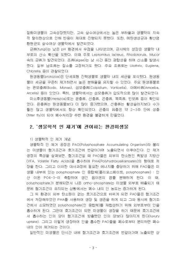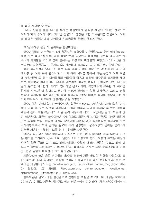 ¹Ì»ý¹°Àº ¿ì¸®ÀÇ ´«À¸·Î ºÐº°ÇÒ ¼ö ¾ø´Â ÀÛÀº »ý¹°À» ¶æÇϸç, ´ë·« ±× Å©±â°¡ 0.1 mm ÀÌÇÏÀÎ ÀÛÀº »ý¹°À» ÀǹÌÇÑ´Ù. ȯ°æ¹Ì»ý¹°Àº Áö±¸ ¹× Àΰ£ ȯ°æ¿¡ ¿µÇâÀ» ¹ÌÄ¡¸ç ¶ÇÇÑ Áö±¸»ýŰè¿Í Àΰ£È°µ¿¿¡ °ü·ÃÀÌ ÀÖ´Â ¹Ì»ý¹°ÀÌ´Ù. ¶Ç ÀÚ¿¬È¯°æÀ¸·Î À¯ÀԵǴ ¿À¿°¹°ÁúÀ» ºÐÇØ¡¤Á¦°ÅÇϴµ¥ °ü¿©ÇÏ´Â ¹Ì»ý¹°À» ¸»ÇÑ´Ù. »ì¼ö¿©»ó¹ý(trickling filter process)Àº º¸Åë µµ½ÃÇϼöÀÇ 2Â÷ 󸮸¦ ÀÇÇÏ¿© »ç¿ëµÇ¸ç, ÀÌ Àç·Î ä¿öÁø ¿©»ó À§¿¡ »ì¼öµÈ Çϼö´Â ¿©Àç »çÀ̸¦ À¯ÇÏÇÏ¸é¼ ÇϼöÁß¿¡ ÀÖ´Â À¯±â¹°ÀÌ ¿©Àç Ç¥¸é¿¡ Çü¼ºµÈ ¹Ì»ý¹°¸·¿¡ ÈíÂøµÇ¾î »êÈ ºÐÇØµÇ¹Ç·Î Á¦°ÅµÈ´Ù. ÇϤýÆó¼ö ³»¿¡ ´Ù·® ÇÔÀ¯µÇ¾î ÀÖ´Â ÀÎÀº È£¼Ò¿Í ÇÏõÀÇ ºÎ¿µ¾çȸ¦ À¯¹ßÇÏ¿© ¼öÀÚ¿ø È®º¸¿¡ ¸·´ëÇÑ ¿µÇâÀ» ÃÊ·¡ÇÏ°Ô µÇ¸ç ÇØ¸¶´Ù ¼öÁú¹®Á¦ ¹ß»ýÀÇ ¿øÀÎÀÌ µÇ¾î ÁÖ¿äÇÑ »çȸ¹®Á¦·Î ´ëµÎµÇ°í ÀÖ´Ù. Æó¼ö Áß¿¡ µé¾îÀÖ´Â ¹°ÁúÀ» Á¦°ÅÇϰųª ¿À¿°¹°ÁúÀÌ °¡Áö´Â À¯ÇؼºÀ» ¾ø¾ÚÀ¸·Î½á Æó¼ö°¡ µµÀԵǴ ÇÏõÀ̳ª ¹Ù´Ù¿¡ ¹ÌÄ¡´Â ¾Ç¿µÇâÀ» Á¦°ÅÇÏ´Â °øÀÛÀÌ Æó¼öó¸®ÀÌ´Ù. ¹«±â¼ºÀ¸·Î À¯Çع°Áú ÇÔÀ¯Æó¼ö Áß¿¡ ¿ëÇØµÇ¾î ÀÖ´Â ½Ã¾È, Ä«µå¹Å, ¼öÀº, Å©·Ò, ¾Æ¿¬, ºÒ¼Ò µî°ú °°ÀÌ ¼öÁß»ý¹°À̳ª ÀÎüÀÇ °Ç°¿¡ À§Çظ¦ ³¢Ä¥ ¿ì·Á´Â ¼ººÐÀº ¹Ì¸® Æó¼ö Áß¿¡¼ 󸮵Ǿî Á¦°ÅÇØ¾ß ÇÑ´Ù. ÀÌ ·¹Æ÷Æ®´Â ¡®»ì¼ö¿©»ó °øÁ¤¡¯¿¡ °ü¿©Çϴ ȯ°æ¹Ì»ý¹°°ú ¡®»ý¹°ÇÐÀû ÀÎ Á¦°Å¡¯¿¡ °ü¿©Çϴ ȯ°æ¹Ì»ý¹°À» ¼·Î ºñ±³ÇÏ¿© ³íÇÏ¿´´Ù. II. º» ·Ð 1. ¡®»ì¼ö¿©»ó °øÁ¤¡¯¿¡ °ü¿©Çϴ ȯ°æ¹Ì»ý¹° 1) ¡®»ì¼ö¿©»ó °øÁ¤¡¯ °³³ä »ì¼ö¿©»ó¹ý(trickling filter process)Àº ºÎÂø»ý¹°À» ÀÌ¿ëÇÑ ¿À¿°¹°ÁúÀÇ Ã³¸®¹æ¹ýÀ¸·Î ÀÚ°¥, ¼â¼®, ÇÃ¶ó½ºÆ½Á¦ µîÀÇ ¸Åü·Î ä¿öÁø ¹ÝÀÀÁ¶À§¿¡ »ì¼ö±â ȤÀº °íÁ¤»ó ³ëÁñ·Î Æó¼ö¸¦ ±ÕµîÇÏ°Ô »ì¼öÇÏ¿© ¸ÅüÃþÀ» °ÅÄ¡¸é¼ Æó¼ö³»ÀÇ ¿À¿°¹°ÁúÀ» Á¦°ÅÇÏ´Â °øÁ¤ÀÌ´Ù. 󸮼ö´Â ¹Ù´ÚÀÇ ¹è¼ö½Ã¼³¿¡ Áý¼öµÈ ´ÙÀ½ ħÀüÁö¿¡¼ °í¤ý¾×ºÐ¸®µÇ¸ç, ½½·¯Áö´Â ¹Ý¼ÛÇÏÁö ¾ÊÀ¸³ª, 󸮼ö´Â ¿©»óÀÇ Á¾·ù¿¡ µû¶ó Àç¼øÈ¯½Ã۱⵵ ÇÑ´Ù. »ì¼ö¿©»óÀÇ Á¤ÈÀÛ¿ëÀº ¸ÅÃÿ¡ ºÎÂøµÈ ¹Ì»ý¹°ÀÇ »êÈÀÛ¿ëÀ» ÀÌ¿ëÇÏ¿© ¿À¿°¹°ÁúÀ» Á¦°ÅÇÏ´Â °øÁ¤À¸·Î¼ ºÐ´¢ ¹× Ãà»êÆó¼öÀÇ Ã³¸®¿¡ Àû¿ëÇϱâ À§Çؼ´Â ¿©»óÀÇ Æó¼â¹æÁö¿Í Ãë±â¹ß»ý¿¡ ´ëÇØ¼ ÃæºÐÈ÷ °ËÅäÇÏ¿©¾ß ÇÑ´Ù. »ì¼ö¿©»óÀÇ ÀåÁ¡Àº ¿îÀüÀÌ ½±°í ºñ¿ëÀÌ Àû°Ô µé¸ç ½Å·Úµµ°¡ ³ô¾Æ ÀÛÀº ±Ô¸ð¿¡ ÀûÇÕÇÏ´Ù. µ¶¼º¹°ÁúÀÇ °úºÎÇÏ¿¡ ´ëÇÑ ÀúÇ×¼ºÀÌ ÀÖ¾î »ê¾÷Æó¼ö¸¦ ó¸®Çϴµ¥ ¸¹ÀÌ »ç¿ëÇÑ´Ù. Å»¸®µÈ »ý¹°¸·Àº ħÀü¿¡ ÀÇÇØ ½±°Ô Á¦°ÅÇÒ ¼ö ÀÖ´Ù. ±×·¯³ª ´ÜÁ¡Àº ³ôÀº À¯±â¹° ºÎÇÏ´Â »ý¹°¸·¿¡¼ Á¡Âø¼º ¼¼±ÕÀÇ Áö³ªÄ£ ¹ø½ÄÀ¸·Î ¿©ÀçÀÇ Æó»ö ¿ì·Á°¡ ÀÖ´Ù. Áö³ªÄ£ »ý¹°¸·ÀÇ »ýÀåÀº ¶ÇÇÑ ¾ÇÃë¹®Á¦¸¦ À¯¹ßÇϸç, ¿©ÀçÀÇ Æó»öÀº »ý¹°¸· ³»ÀÇ ¹Ì»ý¹°¿¡ »ê¼Ò°ø±ÞÀ» ¿øÈ°Ä¡ ¸øÇÏ°Ô ÇÑ´Ù. 2) ¡®»ì¼ö¿©»ó °øÁ¤¡¯¿¡ °ü¿©Çϴ ȯ°æ¹Ì»ý¹° »ì¼ö¿©»ó¹ýÀÇ ±âº»¿ø¸®´Â 1Â÷ ħÀü½ÃŲ À¯Ãâ¼ö¸¦ ¹Ì»ý¹°¸·À¸·Î µ¤ÀÎ ¿©Àç(media, ¼â¼® ¶Ç´Â ÇÃ¶ó½ºÆ½Á¦Ç°) À§¿¡ »Ñ¸²À¸·Î½á ¸·Ç¥¸éÀÇ ¹Ì»ý¹°ÀÌ Ç¥¸éÀ» Èê·¯°¡´Â Çϼö³»ÀÇ À¯±â¹°À» ¸ÔÀÌ·Î ¼·Ãë ºÐÇØÇÏ´Â °úÁ¤À¸·Î ¹Ì»ý¹°¸· Ç¥¸é(0.1-0.2mm)Àº ÇϺηκÎÅÍ ÀÚ¿¬ÅëdzµÇ´Â °ø±â·Î È£±â¼º»óŰ¡ À¯ÁöµÇ³ª ±× ÀÌÇÏ´Â Çø±â¼ºÀÌ µÈ´Ù. Ȱ¼º ½½·¯Áö¹ý°ú ´Þ¸® 1Â÷ ħÀü À¯Ãâ ¼ö¸¦ ¹Ì»ý¹° Á¡¸·À¸·Î µ¤ÀÎ ¼â¼®À̳ª ±âŸ ¸Å°³Ãþ µî ¿©Àç À§¿¡ »ì¼öÇÏ¿© Çϼö°¡ ¿©Àç »çÀ̸¦ Åë°úÇØ °¡´Â µ¿¾È¿¡ ¿©Àç Ç¥¸é¿¡ ºÎÂø¼ºÀåÇϰí ÀÖ´Â ¹Ì»ý¹°¸·ÀÇ »ý¹°ÇÐÀû ÀÛ¿ë¿¡ ÀÇÇÏ¿© ÇϼöÁßÀÇ À¯±â¹°À» Á¦°Å ÇÏ´Â »ý¹°ÇÐÀû 󸮹ýÀÌ´Ù. À¯Ãâ¼ö Àç¼øÈ¯ÀÇ ¸ñÀûÀº ¿©»ó¿¡ °¡ÇØÁö´Â °ÇÑ À¯±â¹°ÁúÀÇ ³óµµ¸¦ Èñ¼®ÇÑ´Ù. ÆÄ¸®ÀÇ ¹ø½Ã±âÀ» °¨¼Ò½Ã۸ç, À¯ÀÔÆó¼ö°¡ ºÎÁ·ÇÒ ¶§ ÃÖÃÊħÀüÁöÀÇ Ã¼·ù½Ã°£ÀÌ ±æ¾îÁö°í Çø±â¼º ºÐÇØ°¡ ¹ß»ýµÇ´Â °ÍÀ» ¿¹¹æÇÑ´Ù. ±×¸®°í À¯ÀÔÇϼöÀÇ ¼ö¸®ÇÐÀû ºÎÇÏÀ²°ú Àü´Ü·ÂÀ» Áõ°¡½ÃÅ´À¸·Î½á ¹Ì»ý¹° Á¡¸·ÀÌ °è¼ÓÀûÀ¸·Î Å»¶ôµÇµµ·Ï Çϸç, °úµµÇÏ°Ô ¼ºÀåÇÏ´Â °ÍÀ» ¿¹¹æÇÑ´Ù. »ì¼ö¿©»óÀº ¿©»ó¸ÅÁú, ÇϺιè¼ö½Ã¼³, ȸÀü½ÄºÐ¹è±â·Î ±¸¼ºµÈ´Ù. ¿©»ó¸ÅÁúÀº ¹Ì»ý¹°ÀÌ ÀÚ¶ö ¼ö Àִ ǥ¸éÀ» Á¦°øÇÔ°ú ¾Æ¿ï·¯ Çϼö¿Í °ø±â°¡ Åë°úÇÒ ¼ö ÀÖ´Â °øÁ¤À» Á¦°øÇØ ÁØ´Ù. ¸ÅÁú·Î´Â ¼â¼®, ÀÚ°¥ µîÀÌ »ç¿ëµÇ¾î ¿ÔÀ¸³ª ÃÖ±Ù¿¡´Â ÇÃ