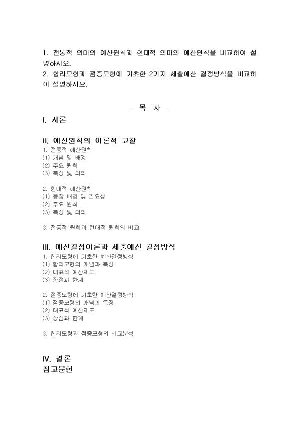2. ÇÕ¸®¸ðÇü°ú Á¡Áõ¸ðÇü¿¡ ±âÃÊÇÑ 2°¡Áö ¼¼Ã⿹»ê °áÁ¤¹æ½ÄÀ» ºñ±³ÇÏ¿© ¼³¸íÇϽÿÀ. - ¸ñ Â÷ - I. ¼·Ð II. ¿¹»ê¿øÄ¢ÀÇ ÀÌ·ÐÀû °íÂû 1. ÀüÅëÀû ¿¹»ê¿øÄ¢ (1) °³³ä ¹× ¹è°æ (2) ÁÖ¿ä ¿øÄ¢ (3) Ư¡ ¹× ÀÇÀÇ 2. Çö´ëÀû ¿¹»ê¿øÄ¢ (1) µîÀå ¹è°æ ¹× Çʿ伺 (2) ÁÖ¿ä ¿øÄ¢ (3) Ư¡ ¹× ÀÇÀÇ 3. ÀüÅëÀû ¿øÄ¢°ú Çö´ëÀû ¿øÄ¢ÀÇ ºñ±³ III. ¿¹»ê°áÁ¤À̷аú ¼¼Ã⿹»ê °áÁ¤¹æ½Ä 1. ÇÕ¸®¸ðÇü¿¡ ±âÃÊÇÑ ¿¹»ê°áÁ¤¹æ½Ä (1) ÇÕ¸®¸ðÇüÀÇ °³³ä°ú Ư¡ (2) ´ëÇ¥Àû ¿¹»êÁ¦µµ (3) ÀåÁ¡°ú ÇѰè 2. Á¡Áõ¸ðÇü¿¡ ±âÃÊÇÑ ¿¹»ê°áÁ¤¹æ½Ä (1) Á¡Áõ¸ðÇüÀÇ °³³ä°ú Ư¡ (2) ´ëÇ¥Àû ¿¹»êÁ¦µµ (3) ÀåÁ¡°ú ÇѰè 3. ÇÕ¸®¸ðÇü°ú Á¡Áõ¸ðÇüÀÇ ºñ±³ºÐ¼® IV. °á·Ð Âü°í¹®Çå ** ÇÔ²² Á¦°øµÇ´Â Âü°íÀÚ·áÆÄÀÏ ** 1. ¼·Ð Âü°í.hwp 2. ¼·Ð Âü°í2.hwp 3. °á·Ð Âü°í.hwp 4. °á·Ð Âü°í2.hwp 5. ÀüÅëÀû ¿¹»ê¿øÄ¢.hwp 6. ÀüÅëÀû ¿¹»ê¿øÄ¢2.hwp 7. ÀüÅëÀû¿¹»ê¿øÄ¢°ú Çö´ëÀû¿¹»ê¿øÄ¢ÀÇ ºñ±³.hwp 8. ÀüÅëÀû¿¹»ê¿øÄ¢°ú Çö´ëÀû¿¹»ê¿øÄ¢ÀÇ ºñ±³2.hwp 9. Á¡Áõ¸ðÇü¿¡ ±âÃÊÇÑ ¿¹»ê°áÁ¤¹æ½Ä.hwp 10. ÇÕ¸®¸ðÇü¿¡ ±âÃÊÇÑ ¿¹»ê°áÁ¤¹æ½Ä.hwp 11. ÇÕ¸®¸ðÇü°ú Á¡Áõ¸ðÇüÀÇ ºñ±³.hwp 12. ÇÕ¸®¸ðÇü°ú Á¡Áõ¸ðÇüÀÇ ºñ±³2.hwp 13. Çö´ëÀû¿¹»ê¿øÄ¢.hwp 14. Çö´ëÀû¿¹»ê¿øÄ¢2.hwp ¢ºÀÚ·á³»¿ë ¹Ì¸®º¸±â