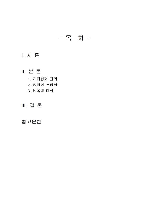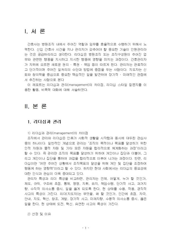 2. ÷ºÎÇÑ ¸®´õ½Ê ½ºÅ¸ÀÏ Áú¹®Áö¸¦ ÀÌ¿ëÇÑ È°µ¿ÀÔ´Ï´Ù. º»ÀÎ ¶Ç´Â »ó±ÞÀÚ 1¸íÀ» ¼±Á¤ÇÏ¿© Áú¹®ÁöÀÇ 20°³ ¹®Ç׿¡ ´äÇÑ ÈÄ, Á¦½ÃµÈ [äÁ¡ ¹æ½Ä]°ú [°á°ú Á¡¼öÀÇ ÇØ¼®]À» Àû¿ëÇÕ´Ï´Ù. º¸°í¼¿¡ ¨çÆò°¡ ´ë»óÀÌ ´©±¸ÀÎÁö 1~2ÁÙ·Î ±â¼úÇϰí, ¨èÆò°¡ °á°ú¸¦ ´ÙÀ½°ú °°ÀÌ Á¡¼ö·Î Á¦½ÃÇϰí, µ¿½Ã¿¡ ¨é°ú¾÷ ÁöÇâÇü°ú °ü°è ÁöÇâÇü Ãø¸é¿¡¼ ±×ÀÇ ¸®´õ½ÊÀ» ÇØ¼®ÇÏ¿© ±â¼úÇÕ´Ï´Ù. ¸¶Áö¸·À¸·Î ¨ê±×ÀÇ °ú¾÷ ÁöÇâÇü ¶Ç´Â °ü°è ÁöÇâÇü ¸®´õ½ÊÀ» º¸¿©ÁÖ´Â ±¸Ã¼Àû »ç·Ê¸¦ 1°¡Áö¸¸ Á¦½ÃÇϼ¼¿ä. ¡Ü ¦¼ö ¹®Ç× ÀÀ´äÀÇ ÇÕ(ÃÖ´ë 50Á¡) = ( ) ¡Ü Ȧ¼ö ¹®Ç× ÀÀ´äÀÇ ÇÕ(ÃÖ´ë 50Á¡) = ( ) 3. ºñÆø·Â ´ëȸ¦ ÇÏ·Á¸é Æò°¡³ª ÆÇ´Ü ¾øÀÌ ½ÇÁ¦ ÀϾ°í ÀÖ´Â °ÍÀ» ±×´ë·Î °üÂûÇÏ¿© ¸»ÇÏ¿©¾ß ÇÕ´Ï´Ù. 1~2ÀÏ Á¤µµ °¡Á·, Ä£±¸, Á÷Àå µ¿·áµéÀÇ ´ëȸ¦ °üÂûÇÏ°í Æò°¡°¡ ¼¯ÀÎ ´ëȹ®À» 3°³ ã¾Æ¼ À̸¦ ¨çºñÆø·Â ´ëȹý¿¡ ¸Â°Ô ¼öÁ¤Çϰí, ¨èº»ÀÎ Àǰß(5ÁÙ À̳»)À» ±â¼úÇϼ¼¿ä. - ¸ñ Â÷ - I. ¼ ·Ð II. º» ·Ð 1. ¸®´õ½Ê°ú °ü¸® 2. ¸®´õ½Ê ½ºÅ¸ÀÏ 3. ºñÆø·Â ´ëÈ III. °á ·Ð Âü°í¹®Çå ** ÇÔ²² Á¦°øµÇ´Â Âü°íÀÚ·á ÇÑ±ÛÆÄÀÏ ** 1. °ü¸® ¿ª·®º¸´Ù ¸®´õ½ÊÀÌ ´õ ¶Ù¾î³ »ç¶÷.hwp 2. ¸®´õ½Êº¸´Ù °ü¸® ¿ª·®ÀÌ ´õ ¶Ù¾î³ »ç¶÷.hwp 3. ¸®´õ½Ê°ú °ü¸®ÀÇ Â÷ÀÌÁ¡.hwp 4. ¸®´õ½Ê°ú °ü¸®ÀÇ Â÷ÀÌÁ¡2.hwp 5. ºñÆø·Â ´ëÈ ºÐ¼® ¹× Àû¿ë.hwp 6. ºñÆø·Â ´ëÈ ºÐ¼® ¹× Àû¿ë2.hwp 7. ºñÆø·Â ´ëÈ ºÐ¼® ¹× Àû¿ë3.hwp 8. ºñÆø·Â ´ëÈ ºÐ¼® ¹× Àû¿ë4.hwp ¢ºÀÚ·á³»¿ë ¹Ì¸®º¸±â
