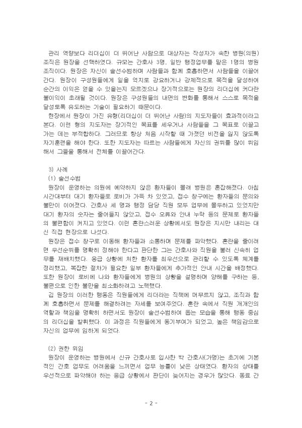 °£È£»ç´Â º´¿øÁ¶Á÷ ³»¿¡¼ ÁÖ¾îÁø ¿ªÇÒ°ú ÀÓ¹«¸¦ È¿À²ÀûÀ¸·Î ¼öÇàÇϱâ À§Çؼ ³ë·ÂÇÑ´Ù. ½ÅÀÔ °£È£»ç ½Ã°£À» Áö³ª °ü¸®ÀÚ°¡ °®Ãß¾î¾ß ÇÒ Áß¿äÇÑ ±â¼úÀÌ Àοø°ü¸®¶ó´Â °ÍÀº °ø°¨Çϸ®¶ó°í »ý°¢ÇÑ´Ù. ¸®´õ½ÊÀº º´¿øÁ¶Á÷ ¶Ç´Â Á¶Á÷±¸¼º¿øÀÌ ÁÖ¾îÁø ¾÷¹«¿Í °ü·ÃµÈ ÇൿÀ» Áö½ÃÇϰí Áö½ÃÇÑ Çൿ¿¡ ¿µÇâÀ» ¹ÌÄ¡´Â °úÁ¤ÀÌ´Ù. °£È£°ü¸®ÀÚ°¡ ÁöÀ§¿¡ ¿À¸£¸é »õ·Î¿î ±Ç¸® ¡¤ Ư±Ç ¡¤ Ã¥ÀÓ µîÀÌ µû¸£°Ô µÈ´Ù. °ü¸®ÀÚ´Â °ü·áÀûÀÌ°í ´Ü±âÀûÀ̸ç ÁÖ¾îÁø ÀÏó¸®ÀÇ ¼ö´Ü°ú ¹æ¹ý¿¡ ÁßÁ¡À» µÎ´Â »ç¶÷ÀÌ´Ù. ÁöµµÀÚ´Â ½Å·Ú¿Í âÀÇ·ÂÀ» Áß½ÉÀ¸·Î Áß¿äÇÑ ÇÙ½ÉÀûÀÎ ÀÏÀ» ¹ß°ßÇÏ¿© Àå±âÀû ¡¤ ¹Ì·¡ÀûÀÎ °üÁ¡¿¡¼ ÃßÁøÇÏ´Â »ç¶÷À¸·Î º»´Ù ÀÌ ·¹Æ÷Æ®´Â ¸®´õ½Ê°ú °ü¸®(management)ÀÇ Â÷ÀÌÁ¡, ¸®´õ½Ê ½ºÅ¸ÀÏ Áú¹®Áö¸¦ ÀÌ¿ëÇÑ È°µ¿, ºñÆø·Â ´ëÈ¿¡ ´ëÇØ ¼¼úÇÏ¿´´Ù. II. º» ·Ð 1. ¸®´õ½Ê°ú °ü¸® 1) ¸®´õ½Ê°ú °ü¸®(management)ÀÇ Â÷ÀÌÁ¡ Á¶Á÷¿¡¼ °ü¸®¿Í ¸®´õ½ÊÀº Àηù°¡ »çȸÀû »ýȰÀ» ½ÃÀÛÇÔ°ú µ¿½Ã¿¡ ´ëµÎµÈ °ü½É»ç ÁßÀÇ ÇϳªÀÌ´Ù. ÀϹÝÀûÀÎ °³³äÀ¸·Î °ü¸®´Â ¡®Á¶Á÷ÀÇ ¸ñÀûÀ̳ª ¸ñÇ¥¸¦ ´Þ¼ºÇϱâ À§ÇÑ ÀÎÀû ÀÚ¿ø°ú ¹°Àû ÀÚ¿ø ¹× ±âŸ ¸ðµç ÀÚ¿øÀ» ÇÕ¸®ÀûÀ¸·Î ü°èÈÇÏ´Â °úÁ¤¡¯À̶ó°í ÇÒ ¼ö ÀÖ´Ù. Áï °ü¸®¶õ Á¶Á÷ÀÇ ¸ñÇ¥¸¦ ´Þ¼ºÇϱâ À§ÇÏ¿© °³ÀÎÀ̳ª Áý´Ü°ú ´õºÒ¾î, ±×¸®°í °³ÀÎÀ̳ª Áý´ÜÀ» ÅëÇÏ¿© °ú¾÷À» ÇÕ¸®ÀûÀ¸·Î ÀÌ·ç¾î ³ª°¡´Â °úÁ¤ÀÌ´Ù. ¹Ý¸é, ¸®´õ½ÊÀ̶õ ¡®¾î¶² ÁÖ¾îÁø »óȲ¿¡¼ Á¶Á÷¸ñÇ¥ÀÇ ´Þ¼ºÀ» À§ÇØ °³ÀÎ ¹× Áý´ÜÀ» Á¶Á¤ÇÏ¿© ÇൿÄÉ ÇÏ´Â ¿µÇâ·Â¡¯À̶ó°í ÇÒ ¼ö ÀÖ´Ù. ÇÏÁö¸¸ Çö´ë »çȸ¿¡¼´Â ¸®´õ½ÊÀÇ Á߿伺¿¡ ´ëÇÑ Àνİú °ü½ÉÀÌ ´õ¿í Áõ´ëµÇ°í ÀÖ´Ù. °ü¸®ÀÚ Æ¯¼º°ú ¸®´õ Ư¼ºÀ» ºñ±³Çϸé, °ü¸®ÀÚ´Â ¾ðÁ¦, ¾î¶»°Ô, ´©°¡ ÇÒ °ÍÀΰ¡, Á¦µµ, ±ÔÄ¢, ±¸Á¶¿¡ ÃÊÁ¡, ÅëÁ¦, ¸í·É, ÁöÈÖ, À¯Áö, Ã¥ÀÓ¼öÇà, ´Ü±âÀû »ç°í, °ú°ÅÁöÇâ, ¼öÁ÷Àû ÀÇ»ç¼ÒÅë Áß½Ã, ÀÏÀ» ¿Ç°Ô µÇµµ·Ï ÇÑ´Ù, Çö »óŸ¦ ¼ö¿ë, Àû¿ë, °æÁ÷Àû »ç°íÀÇ Æ¯¼ºÀÌ °¡Áø´Ù. ¸®´õ(ÁöµµÀÚ)´Â ¹«¾ùÀ», ¿Ö ÇÒ °ÍÀΰ¡, Àΰ£¿¡ ÃÊÁ¡, ÀÚ±Ø, ¾È³», Áöµµ, Çõ½Å, âÁ¶, °³¹ß, Àå±âÀû »ç°í, ¹Ì·¡ÁöÇâ, ¼öÆòÀû ÀÇ»ç¼ÒÅë Áß½Ã, ¿ÇÀº ÀÏÀ» ÇÑ´Ù, Çö »óÅ¿¡ µµÀü, Çõ½Å, À¯¿¬ÇÑ »ç°íÀÇ Æ¯¼ºÀÌ °¡Áø´Ù. 2) ¼±Á¤ ¹× ÀÌÀ¯ °ü¸® ¿ª·®º¸´Ù ¸®´õ½ÊÀÌ ´õ ¶Ù¾î³ »ç¶÷À¸·Î ´ë»óÀÚ´Â ÀÛ¼ºÀÚ°¡ ¼ÓÇÑ º´¿ø(ÀÇ¿ø) Á¶Á÷Àº ¿øÀåÀ» ¼±ÅÃÇÏ¿´´Ù. ±Ô¸ð´Â °£È£»ç 3¸í, ÀÏ¹Ý ÇàÁ¤¾÷¹«¸¦ ¸ÃÀº 1¸íÀÇ º´¿ø Á¶Á÷ÀÌ´Ù. ¿øÀåÀº ÀÚ½ÅÀÌ ¼Ö¼±¼ö¹üÇÏ¸ç »ç¶÷µé°ú ÇÔ²² È£ÈíÇÏ¸é¼ »ç¶÷µéÀ» À̲ø¾î °£´Ù. ¿øÀåÀÌ ±¸¼º¿øµé¿¡°Ô ÀÏÀ» ¾ïÁö·Î °¿äÇϰųª °Á¦ÀûÀ¸·Î ¸ñÀûÀ» ´Þ¼ºÇÏ¿© ¼ø°£ÀÇ ÀÌÀÍÀº ¾òÀ» ¼ö ÀÖÀ»´ÂÁö ¸ð¸£°ÚÀ¸³ª Àå±âÀûÀ¸·Î´Â ¿øÀåÀÇ ¸®´õ½Ê¿¡ Ä¿´Ù¶õ ºÒÀÌÀÍÀÌ ÃÊ·¡µÉ °ÍÀÌ´Ù. ¿øÀåÀº ±¸¼º¿øµéÀÇ ³»¸éÀÇ º¯È¸¦ ÅëÇØ¼ ½º½º·Î ¸ñÀûÀ» ´Þ¼ºÅä·Ï À¯µµÇÏ´Â ±â¼úÀÌ ÇÊ¿äÇϱ⠶§¹®ÀÌ´Ù. ÇöÀå¿¡¼ ¿øÀåÀÌ °¡Áø À¯Çü(¸®´õ½ÊÀÌ ´õ ¶Ù¾î³ »ç¶÷)ÀÇ ÁöµµÀÚµéÀÌ È¿°úÀûÀ̶ó°í º»´Ù. ÀÌ·± ÇüÀÇ ÁöµµÀÚ´Â Àå±âÀûÀÎ ¸ñÇ¥¸¦ ¼¼¿ì°Å³ª »ç¶÷µéÀ» ±× ¸ñÇ¥·Î À̲ø°í °¡´Â µ¥´Â ºÎÀûÇÕÇÏ´Ù. ±×·¯¹Ç·Î Ç×»ó óÀ½ ½ÃÀÛÇÒ ¶§ °¡Á³´ø ºñÀüÀ» ÀÒÁö ¾Êµµ·Ï ÀÚ±âÈÆ·ÃÀ» ÇØ¾ß ÇÑ´Ù. ¶ÇÇÑ ÁöµµÀÚ´Â µû¸£´Â »ç¶÷µé¿¡°Ô ÀÚ½ÅÀÇ ±ÇÀ§¸¦ ¸¹ÀÌ À§ÀÓÇØ¼ ±×µéÀ» ÅëÇØ¼ Àüü¸¦ À̲ø¾î°£´Ù. 3) »ç·Ê (1) ¼Ö¼±¼ö¹ü ¿øÀåÀÌ ¿î¿µÇÏ´Â ÀÇ¿ø¿¡ ¿¹¾àÇÏÁö ¾ÊÀº ȯÀÚµéÀÌ ¸ô·Á º´¿øÀº È¥ÀâÇØÁ³´Ù. ¾ÆÄ§ ½Ã°£´ëºÎÅÍ ´ë±â ȯÀÚµé·Î ·Îºñ°¡ °¡µæ Â÷ ÀÖ¾ú°í, Á¢¼ö ⱸ¿¡´Â ȯÀÚµéÀÇ ¹®ÀÇ¿Í ºÒ¸¸ÀÌ À̾îÁ³´Ù. °£È£»ç ¼¼ ¸í°ú ÇàÁ¤ ´ã´ç Á÷¿ø ¸ðµÎ ¾÷¹«¿¡ ¸ôµÎÇϰí ÀÖ¾úÁö¸¸ ´ë±â ȯÀÚÀÇ ¼ýÀÚ´Â ÁÙ¾îµéÁö ¾Ê¾Ò°í, Á¢¼ö ¿À·ù¿Í ¾È³» ´©¶ô µîÀÇ ¹®Á¦·Î ȯÀÚµéÀÇ ºÒÆíÇÔÀÌ Ä¿Áö°í ÀÖ¾ú´Ù. ÀÌ·± È¥¶õ½º·¯¿î »óȲ¿¡¼µµ ¿øÀåÀº Áö½Ã¸¸ ³»¸®´Â ´ë½Å Á÷Á¢ ÇöÀåÀ¸·Î ³ª¼¹´Ù. ¿øÀåÀº Á¢¼ö ⱸ·Î À̵¿ÇØ È¯ÀÚµé°ú ¼ÒÅëÇÏ¸ç ¹®Á¦¸¦ ÆÄ¾ÇÇß´Ù. È¥¶õÀ» ÁÙÀÌ·Á¸é ¿ì¼±¼øÀ§¸¦ ¸íÈ®È÷ Á¤ÇØ¾ß ÇÑ´Ù°í ÆÇ´ÜÇÑ ±×´Â °£È£»ç¿Í Á÷¿øÀ» ºÒ·¯ ½Å¼ÓÈ÷ ¾÷¹«¸¦ Àç¹èÄ¡Çß´Ù. ÀÀ±Þ »óȲ¿¡ óÇÑ È¯ÀÚ¸¦ ÃÖ¿ì¼±À¸·Î °ü¸®ÇÒ ¼ö ÀÖµµ·Ï ü°è¸¦ Á¤¸®Çß°í, º¹ÀâÇÑ ÀýÂ÷°¡ ÇÊ¿äÇÑ ÀϺΠȯÀڵ鿡°Ô Ãß°¡ÀûÀÎ ¾È³» ½Ã°£À» ¹èÁ¤Çß´Ù. ¶ÇÇ
