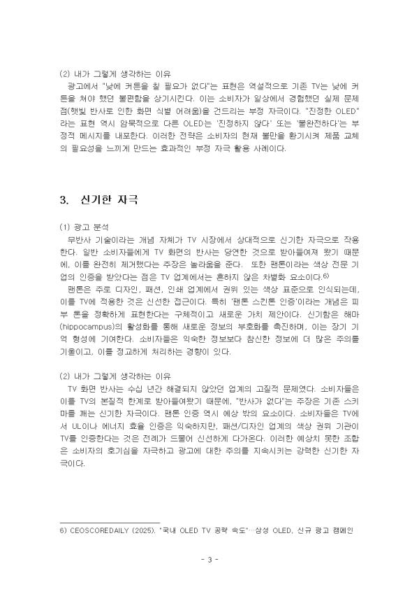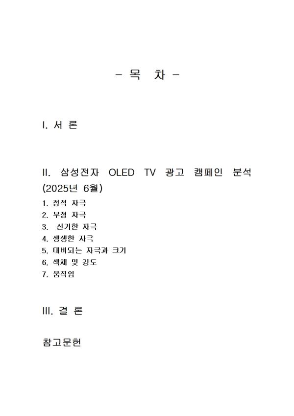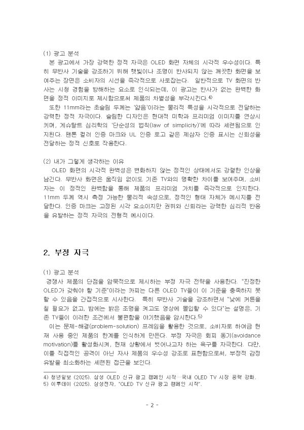 Á¦1Àå 3Àý¿¡¼ Á¦½ÃÇÑ ½É¸®Àû 󸮿¡ ¿µÇâÀ» ÁÖ´Â ¸Þ½ÃÁö Ư¼º Áï Á¤ÀûÀڱذú ºÎÁ¤ÀÚ±Ø, ½Å±âÇÑ ÀÚ±Ø, »ý»ýÇÑ ÀÚ±Ø, ´ëºñµÇ´Â ÀÚ±Ø, Å©±â, »öä ¹× °µµ, ¿òÁ÷ÀÓÀ» ±âÁØÀ¸·Î ºÐ¼®ÇϽÿÀ. - ¸ñ Â÷ - I. ¼ ·Ð II. »ï¼ºÀüÀÚ OLED TV ±¤°í Ä·ÆäÀÎ ºÐ¼®(2025³â 6¿ù) 1. Á¤Àû ÀÚ±Ø 2. ºÎÁ¤ ÀÚ±Ø 3. ½Å±âÇÑ ÀÚ±Ø 4. »ý»ýÇÑ ÀÚ±Ø 5. ´ëºñµÇ´Â Àڱذú Å©±â 6. »öä ¹× °µµ 7. ¿òÁ÷ÀÓ III. °á ·Ð Âü°í¹®Çå ** ÇÔ²² Á¦°øµÇ´Â Âü°íÀÚ·áÆÄÀÏ ** 1. ¼·Ð ÂüÁ¶.hwp 2. ¼·Ð ÂüÁ¶2.hwp 3. °á·Ð ÂüÁ¶.hwp 4. °á·Ð ÂüÁ¶2.hwp 5. µé¾î°¡´Â¸» ÂüÁ¶.hwp 6. ¸ÎÀ½¸» ÂüÁ¶.hwp 7. »ï¼ºÀüÀÚ OLED TV ±¤°í Ä·ÆäÀÎ ºÐ¼® ¿¬±¸(2025³â 6¿ù).hwp 8. »ï¼ºÀüÀÚ OLED TV ±¤°í.hwp 9. »ï¼ºÀüÀÚ OLED TV ±¤°í2.hwp 10.»ï¼ºÀüÀÚ OLED TV ±¤°íÀÇ ÁÖÀÇ ÁýÁß Àü·« ¿¬±¸(°³¿ä).hwp ¢ºÀÚ·á³»¿ë ¹Ì¸®º¸±â