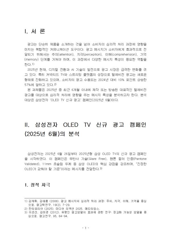 ±¤°í´Â ´Ü¼øÈ÷ Á¦Ç°À» ¼Ò°³ÇÏ´Â °ÍÀ» ³Ñ¾î ¼ÒºñÀÚÀÇ ½É¸®Àû ó¸® °úÁ¤¿¡ ¿µÇâÀ» ¹ÌÄ¡´Â º¹ÇÕÀûÀÎ Ä¿¹Â´ÏÄÉÀÌ¼Ç µµ±¸ÀÌ´Ù. ±¤°í ¸Þ½ÃÁö°¡ ¼ÒºñÀÚ¿¡°Ô È¿°úÀûÀ¸·Î Àü´ÞµÇ±â À§Çؼ´Â ÁÖÀÇ(attention), Áö°¢(perception), ÀÌÇØ(comprehension), ±â¾ï(memory) ´Ü°è¸¦ °ÅÃÄ¾ß Çϸç, ÀÌ °úÁ¤¿¡¼ ´Ù¾çÇÑ ¸Þ½ÃÁö Ư¼º - Áß·« - II. »ï¼ºÀüÀÚ OLED TV ½Å±Ô ±¤°í Ä·ÆäÀÎ (2025³â 6¿ù)ÀÇ ºÐ¼® »ï¼ºÀüÀÚ´Â 2025³â 6¿ù 26ÀϺÎÅÍ 2025³âÇü »ï¼º OLED TVÀÇ ½Å±Ô ±¤°í Ä·ÆäÀÎÀ» ½ÃÀÛÇÏ¿´´Ù. ÀÌ Ä·ÆäÀÎÀº ¹«¹Ý»ç ±â¼ú(Glare Free), ÆÒÅæ Ä÷¯ ÀÎÁõ(Pantone Validated), 11mm Ãʽ½¸² µÎ²² µî »ï¼º OLEDÀÇ ÇÙ½É °Á¡À» °Á¶Çϸç, "ÁøÁ¤ÇÑ OLED°¡ °®Ãç¾ß ÇÒ ±âÁØ"À̶ó´Â ¸Þ½ÃÁö¸¦ - Áß·« - |