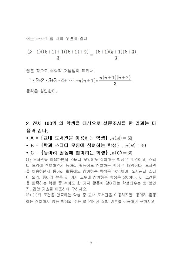 1. ÀÚ¿¬¼ö ¿¡ ´ëÇÏ¿© ´ÙÀ½ µî½ÄÀÌ ¼º¸³ÇÔÀ» ¼öÇÐÀû ±Í³³¹ýÀ» ÀÌ¿ëÇÏ¿© Áõ¸íÇϽÿÀ. 2. Àüü 100¸í ÀÇ ÇлýÀ» ´ë»óÀ¸·Î ¼³¹®Á¶»ç¸¦ ÇÑ °á°ú´Â ´ÙÀ½°ú °°´Ù. 3. ÇÔ¼ö¿¡ ´ëÇÑ ´ÙÀ½ ¹°À½¿¡ ´äÇϽÿÀ. 4. ´ÙÀ½ ±Þ¼ö¸¦ ½Ã±×¸¶ ±âÈ£¸¦ ÀÌ¿ëÇÏ¿© ¼öÇÐÀûÀ¸·Î Ç¥ÇöÇϰí.. 5. ÇÔ¼ö f(x) °¡ ´ÙÀ½°ú °°ÀÌ Á¤ÀǵǾî ÀÖ´Ù. ** ÇÔ²² Á¦°øµÇ´Â ¼öÁ¤°¡´É Âü°íÀÚ·áÆÄÀÏ ** 1. ÇàÁ¤ÄÄÇ»ÅÍ2_´ëÇмöÇÐÀÇÀÌÇØ_°øÅë_°úÁ¦¹°¿Ï¼ºº»(°ßº»).hwp 2. 1¹ø ¹®Á¦ ´Ù¸¥ÀÚ·á 2°¡Áö.hwp 3. 2¹ø¹®Á¦ ´Ù¸¥ÀÚ·á.hwp 4. 3¹ø¹®Á¦ ´Ù¸¥ÀÚ·á 2°¡Áö.hwp 5. 4¹ø¹®Á¦ ´Ù¸¥ÀÚ·á 2°¡Áö.hwp 6. 5¹ø¹®Á¦ ´Ù¸¥ÀÚ·á.hwp * °úÁ¦¹° ¿Ï¼ºº»°ú Á¦°øÇص帮´Â ÇÑ±Û ÆÄÀÏ ÀڷḦ ÀÌ¿ëÇÏ¿© ¼öÁ¤.º¸¿ÏÇϽŠÈÄ ÃÖÁ¾¿Ï¼ºº»À» PDF ÆÄÀÏ·Î ÀúÀåÇÏ½Ã¸é µË´Ï´Ù. ¢ºÀÚ·á³»¿ë ¹Ì¸®º¸±â