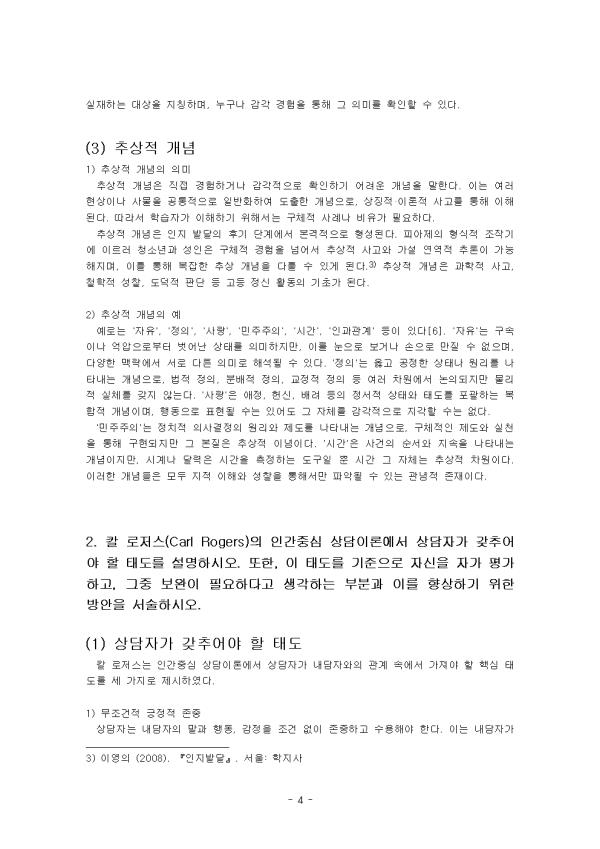 1. À̷аú °ü·ÃµÈ ¿ë¾î Áß ¡®°³³ä(concept)¡¯ÀÇ Á¤ÀǸ¦ Á¦½ÃÇϰí, ±¸Ã¼Àû °³³ä°ú Ãß»óÀû °³³äÀÇ Àǹ̸¦ ¼³¸íÇϽÿÀ. ¶ÇÇÑ, °¢°¢¿¡ ÇØ´çÇÏ´Â ¿¹¸¦ µé¾î ¼¼úÇϽÿÀ. 2. Ä® ·ÎÀú½º(Carl Rogers)ÀÇ Àΰ£Á᫐ »ó´ãÀ̷п¡¼ »ó´ãÀÚ°¡ °®Ãß¾î¾ß ÇÒ Åµµ¸¦ ¼³¸íÇϽÿÀ. ¶ÇÇÑ, ÀÌ Åµµ¸¦ ±âÁØÀ¸·Î ÀÚ½ÅÀ» ÀÚ°¡ Æò°¡Çϰí, ±×Áß º¸¿ÏÀÌ ÇÊ¿äÇÏ´Ù°í »ý°¢ÇÏ´Â ºÎºÐ°ú À̸¦ Çâ»óÇϱâ À§ÇÑ ¹æ¾ÈÀ» ¼¼úÇϽÿÀ. 3. ÆäÇöó¿ì(Peplau)°¡ Á¦½ÃÇÑ °£È£»ç¿Í ȯÀÚ °ü°è¿¡¼ÀÇ 6°¡Áö ¿ªÇÒÀ» ¼³¸íÇϽÿÀ. ¶ÇÇÑ, ÀÚ½ÅÀÇ ¿ª·®¿¡ ºñÃß¾î °¡Àå Àß ¼öÇàÇϰí ÀÖ´Ù°í »ý°¢ÇÏ´Â ¿ªÇÒ°ú °¡Àå Ãë¾àÇÏ´Ù°í ÆÇ´ÜµÇ´Â ¿ªÇÒÀ» Á¦½ÃÇϰí, ÇØ´ç Ãë¾àÇÑ ¿ªÇÒÀ» º¸¿ÏÇÏ´Â µ¥ ÇÊ¿äÇÑ ³ë·Â°ú ¹æ¾ÈÀ» ¼¼úÇϽÿÀ. 4. º£³Ê(Benner)ÀÇ Àü¹®°¡À̷п¡¼ Á¦½ÃÇÑ 5´Ü°è¸¦ ¼³¸íÇϽÿÀ. ¶ÇÇÑ, ÀÚ½ÅÀÇ ¾÷¹«¼÷·Ãµµ¸¦ °í·ÁÇÏ¿© ÇöÀç ÀÚ½ÅÀÌ ÇØ´çÇÏ´Â ´Ü°è¸¦ Á¦½ÃÇϰí, Àü¹®°¡ ´Ü°è·Î Çâ»óÇÏ´Â µ¥ ÇÊ¿äÇÑ ³ë·Â°ú ¹æ¾ÈÀ» ¼¼úÇϽÿÀ. ** ÇÔ²² Á¦°øµÇ´Â Âü°íÀÚ·áÆÄÀÏ ** 1. °³³äÀÇÁ¤ÀÇ.hwp 2. °³³äÀÇÁ¤ÀÇ2.hwp 3. °³³äÀÇÁ¤ÀÇ3.hwp 4. ±¸Ã¼Àû°³³ä°úÃß»óÀû°³³ä.hwp 5. ±¸Ã¼Àû°³³ä°úÃß»óÀû°³³ä2.hwp 6. ³ªÀÇ °£È£»ç ´Ü°è¿¡ ´ëÇÑ Æò°¡.hwp 7. ³ªÀÇ °£È£»ç ´Ü°è¿¡ ´ëÇÑ Æò°¡2.hwp 8. ³ªÀÇ °£È£»ç ¿ªÇÒº¸¿Ï°ú ³ë·Â¹æ¾È.hwp 9. ³ªÀÇ °£È£»ç ¿ªÇÒº¸¿Ï°ú ³ë·Â¹æ¾È2.hwp 10.³»¿ª·®¿¡ ºñÃß¾î º» °£È£»çÀÇ ¿ªÇÒ.hwp 11.º£³ÊÀÇ °£È£ Àü¹®¼º ¹ß´Þ 5´Ü°è.hwp 12.³ªÀÇ °£È£»ç·Î¼ º¸¿ÏÁ¡°ú Çâ»óÀ» À§ÇÑ ¹æ¾È.hwp 13.³ªÀÇ °£È£»ç·Î¼ º¸¿ÏÁ¡°ú Çâ»óÀ» À§ÇÑ ¹æ¾È2.hwp 14.Ä®·ÎÀú½º Àΰ£Á᫐ »ó´ãÀ̷п¡¼ »ó´ãÀÚ°¡ °®Ãß¾î¾ß ÇÒ Åµµ.hwp 15.ŵµ¸¦ ±âÁØÀ¸·Î ÇÑ ³ªÀÇ Æò°¡.hwp 16.ŵµ¸¦ ±âÁØÀ¸·Î ÇÑ ³ªÀÇ Æò°¡2.hwp 17. ÆäÇöó¿ì°¡ Á¦½ÃÇÑ °£È£»çÀÇ 6°¡Áö ¿ªÇÒ.hwp ¢ºÀÚ·á³»¿ë ¹Ì¸®º¸±â