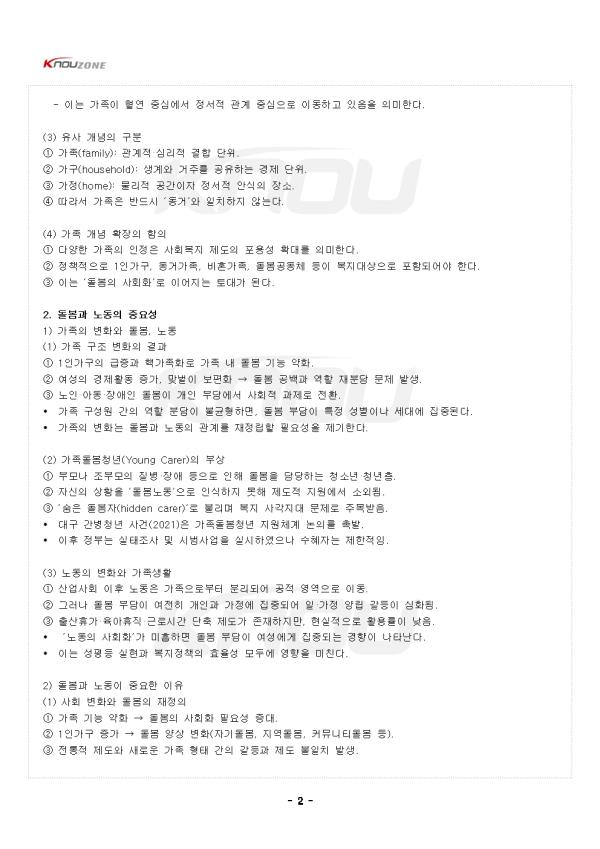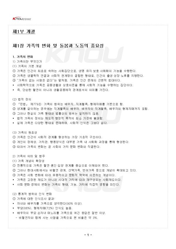 Á¦1Àå °¡Á·ÀÇ º¯È ¹× µ¹º½°ú ³ëµ¿ÀÇ Á߿伺 1. °¡Á·ÀÇ º¯È 1) °¡Á·À̶õ ¹«¾ùÀΰ¡ (1) °¡Á·ÀÇ ±âº» °³³ä ¨ç °¡Á·Àº Àΰ£ÀÌ ÃÖÃÊ·Î ¼ÓÇÏ´Â »çȸÁý´ÜÀ¸·Î, »ý¸í À¯Áö¡¤º¸È£¡¤»çȸÈÀÇ ±â´ÉÀ» ¼öÇàÇÑ´Ù. ¨è °¡Á·Àº »ý¹°ÇÐÀû ¿¬°á°ú »çȸÀû °ü°è¸ÁÀÌ °áÇÕµÈ ÇüÅ·Î, Àΰ£ÀÇ Ãâ»ý¡¤¼ºÀ塤³ëÈĸ¦ ÁöÅÊÇÑ´Ù. ¨é ¡°°¡Á·ÀÌ ¾ø´Â »ç¶÷Àº ¾ø´Ù¡±´Â ¸»Ã³·³, °¡Á·Àº Àΰ£ Á¸ÀçÀÇ ±Ùº»Àû Åä´ëÀÌ´Ù. ¡Ü »çȸÇÐÀûÀ¸·Î °¡Á·Àº °øµ¿»ýȰ°ú »óÈ£ÀÇÁ¸À» ÅëÇØ »çȸÀû ±â´ÉÀ» ¼öÇàÇÏ´Â Áý´ÜÀÌ´Ù. ¡Ü Áï, ´Ü¼øÇÑ Ç÷¿¬ÀÌ ¾Æ´Ï¶ó »ýȰ°øµ¿Ã¼Àû °ü°è·Î¼ÀÇ Àǹ̸¦ °¡Áø´Ù. (2) ¹ýÀû Á¤ÀÇ ¨ç ¡¸¹Î¹ý¡¹ Á¦779Á¶: °¡Á·ÀÇ ¹üÀ§´Â ¹è¿ìÀÚ, Á÷°èÇ÷Á·, ÇüÁ¦ÀڸŸ¦ ±âº»À¸·Î ÇÔ. ¨è »ý°è¸¦ °°ÀÌÇÏ´Â °æ¿ì¿¡´Â Á÷°èÇ÷Á·ÀÇ ¹è¿ìÀÚ, ¹è¿ìÀÚÀÇ Á÷°èÇ÷Á·, ¹è¿ìÀÚÀÇ ÇüÁ¦ÀڸűîÁö Æ÷ÇÔ. ¨é ±×·¯³ª Çö½ÇÀÇ °¡Á· ÇüÅÂ¿Í ¹ý·ü»óÀÇ ¹üÀ§´Â ÀÏÄ¡ÇÏÁö ¾ÊÀ½. ¡Ü ¹ýÀû °¡Á·ÀÇ Á¤ÀÇ´Â Á¦µµÀû¡¤ÇàÁ¤Àû ¸ñÀûÀÇ ÃÖ¼Ò ±âÁØ¿¡ ºÒ°úÇÔ. ¡Ü ½ÇÁ¦ °¡Á·Àº ´Ù¾çÇÑ ÇüÅ·ΠÁ¸ÀçÇϸç, »çȸÀû ÀνÄÀº ±×º¸´Ù ³Ð´Ù. (3) °¡Á·ÀÇ ¿øÃʼº ¨ç °¡Á·Àº Àΰ£ÀÌ »çȸÀû °ü°è¸¦ Çü¼ºÇÏ´Â °¡Àå ±âÃÊÀû ±¸Á¶ÀÌ´Ù. ¨è °³ÀÎÀÇ Á¤Ã¼¼º, °¡Ä¡°ü, Çൿ¾ç½ÄÀº ´ëºÎºÐ °¡Á· ³» »çÈ¸È °úÁ¤À» ÅëÇØ Çü¼ºµÈ´Ù. ¨é µû¶ó¼ °¡Á·ÀÇ º¯È´Â °ð »çȸÀÇ °¡Ä¡¡¤¹®È º¯È¿Í Á÷°áµÈ´Ù. 2) °¡Á·ÀÇ ÀÇ¹Ì ¹× ¹üÁÖ (1) °¡Á· °³³äÀÇ È®À强 ¨ç ÀüÅëÀûÀ¸·Î °¡Á·Àº Ç÷¿¬¡¤È¥ÀΡ¤ÀÔ¾ç °ü°è¸¦ Áß½ÉÀ¸·Î ÀÌÇØµÇ¾î ¿Ô´Ù. ¨è ±×·¯³ª Çö´ë»çȸ¿¡¼´Â ºñÇ÷¿¬ °ü°è, ¼±Åð¡Á·, ¹Ý·Á°¡Á· µîÀ¸·Î °³³äÀÌ È®´ëµÇ°í ÀÖ´Ù. ¨é °¡Á·Àº »çȸ º¯È¿¡ µû¶ó À¯µ¿ÀûÀÌ°í ¹®ÈÀû ¸Æ¶ô¿¡ ÀÇÁ¸ÇÏ´Â °³³äÀÌ´Ù. ¡Ü °¡Á·Àº °íÁ¤µÈ Á¦µµ°¡ ¾Æ´Ï¶ó ½Ã´ëÀû °¡Ä¡¿¡ µû¶ó À籸¼ºµÇ´Â »çȸÁ¦µµÀÌ´Ù. ¡Ü »çȸ¡¤¹®È¡¤°æÁ¦ÀÇ º¯È´Â °¡Á·ÀÇ ÇüÅÂ, ±â´É, °¡Ä¡¿¡ Á÷Á¢Àû ¿µÇâÀ» ¹ÌÄ£´Ù. (2) Åë°èÀû ¹üÀ§¿Í ÀÎ½Ä º¯È ¨ç °¡Á·¿¡ ´ëÇÑ ÀνÄÁ¶»ç °á°ú: ¡Ü ÀÚ³à¿Í ¹è¿ìÀÚ¸¦ °¡Á·À¸·Î »ý°¢ÇÑ´Ù(90% ÀÌ»ó). ¡Ü ºÎ¸ð(86%), ÇüÁ¦ÀÚ¸Å(72%) Àνĵµ ³ôÀ½. ¡Ü ¹è¿ìÀÚÀÇ ºÎ¸ð¡¤¼ÕÀڳࡤ¸ç´À¸®¸¦ °¡Á·À¸·Î ¿©±ä ÀÀ´äÀº Àý¹Ý ÀÌ»ó. - ºñÇ÷¿¬ÀÚ¿Í ÇÔ²² »ç´Â »ç¶÷À» °¡Á·À¸·Î º» ºñÀ²Àº ¾à 3%. - ÀÌ´Â °¡Á·ÀÌ Ç÷¿¬ Á߽ɿ¡¼ Á¤¼Àû °ü°è Áß½ÉÀ¸·Î À̵¿Çϰí ÀÖÀ½À» ÀǹÌÇÑ´Ù. (3) À¯»ç °³³äÀÇ ±¸ºÐ ¨ç °¡Á·(family): °ü°èÀû¡¤½É¸®Àû °áÇÕ ´ÜÀ§. ¨è °¡±¸(household): »ý°è¿Í °ÅÁÖ¸¦ °øÀ¯ÇÏ´Â °æÁ¦ ´ÜÀ§. ¨é °¡Á¤(home): ¹°¸®Àû °ø°£ÀÌÀÚ Á¤¼Àû ¾È½ÄÀÇ Àå¼Ò. ¨ê µû¶ó¼ °¡Á·Àº ¹Ýµå½Ã ¡®µ¿°Å¡¯¿Í ÀÏÄ¡ÇÏÁö ¾Ê´Â´Ù. (4) °¡Á· °³³ä È®ÀåÀÇ ÇÔÀÇ ¨ç ´Ù¾çÇÑ °¡Á·ÀÇ ÀÎÁ¤Àº »çȸº¹Áö Á¦µµÀÇ Æ÷¿ë¼º È®´ë¸¦ ÀǹÌÇÑ´Ù. ¨è Á¤Ã¥ÀûÀ¸·Î 1Àΰ¡±¸, µ¿°Å°¡Á·, ºñÈ¥°¡Á·, µ¹º½°øµ¿Ã¼ µîÀÌ º¹Áö´ë»óÀ¸·Î Æ÷ÇԵǾî¾ß ÇÑ´Ù. ¨é ÀÌ´Â ¡®µ¹º½ÀÇ »çȸȡ¯·Î À̾îÁö´Â Åä´ë°¡ µÈ´Ù. 2. µ¹º½°ú ³ëµ¿ÀÇ Á߿伺 1) °¡Á·ÀÇ º¯È¿Í µ¹º½, ³ëµ¿ (1) °¡Á· ±¸Á¶ º¯ÈÀÇ °á°ú ¨ç 1Àΰ¡±¸ÀÇ ±ÞÁõ°ú ÇÙ°¡Á·È·Î °¡Á· ³» µ¹º½ ±â´É ¾àÈ. ¨è ¿©¼ºÀÇ °æÁ¦È°µ¿ Áõ°¡, ¸Â¹úÀÌ º¸ÆíÈ ¡æ µ¹º½ °ø¹é°ú ¿ªÇÒ ÀçºÐ´ã ¹®Á¦ ¹ß»ý. ¨é ³ëÀΡ¤¾Æµ¿¡¤Àå¾ÖÀÎ µ¹º½ÀÌ °³ÀÎ ºÎ´ã¿¡¼ »çȸÀû °úÁ¦·Î Àüȯ. ¡Ü °¡Á· ±¸¼º¿ø °£ÀÇ ¿ªÇÒ ºÐ´ãÀÌ ºÒ±ÕÇüÇϸé, µ¹º½ ºÎ´ãÀÌ Æ¯Á¤ ¼ºº°À̳ª ¼¼´ë¿¡ ÁýÁߵȴÙ. ¡Ü °¡Á·ÀÇ º¯È´Â µ¹º½°ú ³ëµ¿ÀÇ °ü°è¸¦ ÀçÁ¤¸³ÇÒ Çʿ伺À» Á¦±âÇÑ´Ù. (2) °¡Á·µ¹º½Ã»³â(Young Carer)ÀÇ ºÎ»ó ¨ç ºÎ¸ð³ª Á¶ºÎ¸ðÀÇ Áúº´¡¤Àå¾Ö µîÀ¸·Î ÀÎÇØ µ¹º½À» ´ã´çÇϴ û¼Ò³â¡¤Ã»³âÃþ. ¨è ÀÚ½ÅÀÇ »óȲÀ» ¡®µ¹º½³ëµ¿¡¯À¸·Î ÀνÄÇÏÁö ¸øÇØ Á¦µµÀû Áö¿ø¿¡¼ ¼Ò¿ÜµÊ. ¨é ¡®¼ûÀº µ¹º½ÀÚ(hidden carer)¡¯·Î ºÒ¸®¸ç º¹Áö »ç°¢Áö´ë ¹®Á¦·Î ÁÖ¸ñ¹ÞÀ½. ¡Ü ´ë±¸ °£º´Ã»³â »ç°Ç(2021)Àº °¡Á·µ¹º½Ã»³â Áö¿øÃ¼°è ³íÀǸ¦ Ã˹ß. ¡Ü ÀÌÈÄ Á¤ºÎ´Â ½ÇÅÂÁ¶»ç ¹× ½Ã¹ü»ç¾÷À» ½Ç½ÃÇÏ¿´À¸³ª ¼öÇýÀÚ´Â Á¦ÇÑÀûÀÓ. (3) ³ëµ¿ÀÇ º¯È¿Í °¡Á·»ýȰ ¨ç »ê¾÷»çȸ ÀÌÈÄ ³ëµ¿Àº °¡Á·À¸·ÎºÎÅÍ ºÐ¸®µÇ¾î °øÀû ¿µ¿ªÀ¸·Î À̵¿. ¨è ±×·¯³ª µ¹º½ ºÎ´ãÀÌ ¿©ÀüÈ÷ °³Àΰú °¡Á¤¿¡ ÁýÁߵǾî ÀÏ¡¤°¡Á¤ ¾ç¸³ °¥µîÀÌ ½ÉȵÊ. ¨é Ãâ»êÈÞ°¡¡¤À°¾ÆÈÞÁ÷¡¤±Ù·Î½Ã°£ ´ÜÃà Á¦µµ°¡ Á¸ÀçÇÏÁö¸¸, Çö½ÇÀûÀ¸·Î Ȱ¿ë·üÀÌ ³·À½. ¡Ü ¡®³ëµ¿ÀÇ »çȸȡ¯°¡ ¹ÌÈíÇÏ¸é µ¹º½ ºÎ´ãÀÌ ¿©¼º¿¡°Ô ÁýÁߵǴ 