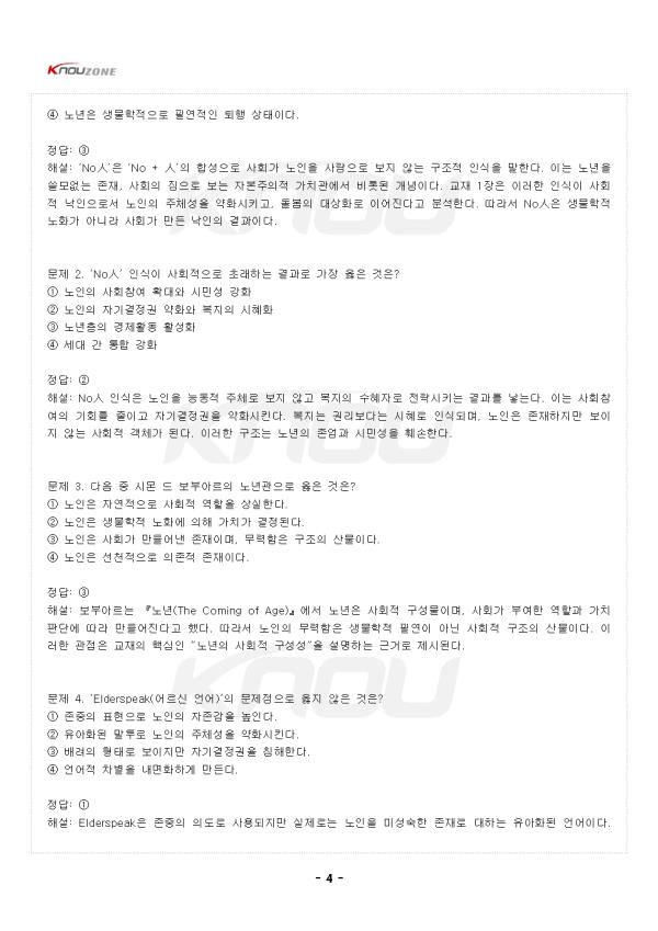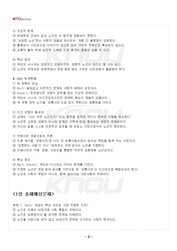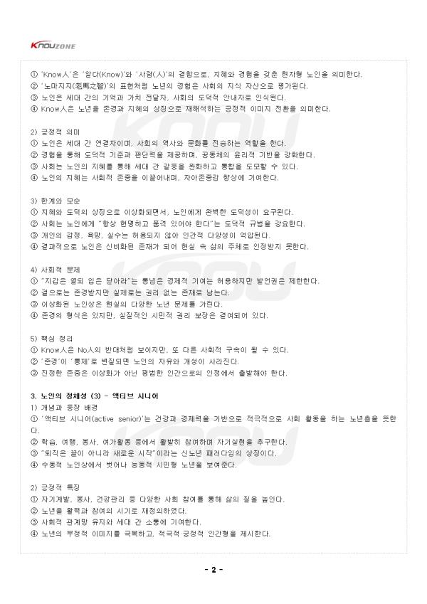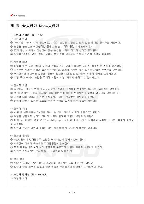 1. ³ëÀÎÀÇ Á¤Ã¼¼º (1) - NoìÑ 1) °³³ä°ú ÀÇ¹Ì ¨ç ¡®NoìÑ¡¯Àº ¡®No + ìÑ¡¯ÀÇ ÇÕ¼º¾î·Î, »çȸ°¡ ³ëÀÎÀ» »ç¶÷À¸·Î º¸Áö ¾Ê´Â Á¸Àç·Î ÀνÄÇÏ´Â °³³äÀÌ´Ù. ¨è ³ëÀÎÀ» ¾µ¸ð¾ø°í ºñ»ý»êÀûÀÎ Á¸Àç·Î º¸´Â »çȸÀû Æí°ßÀÌ ³»Æ÷µÇ¾î ÀÖ´Ù. ¨é °æÁ¦ Á᫐ »çȸ¿¡¼ »ý»ê¼ºÀÌ ¾ø´Â ³ëÀÎÀº »çȸÀû °¡Ä¡°¡ ¾ø´Ù°í Æò°¡µÈ´Ù. ¨ê ³ë³âÀ» ¡®Á¸ÀçÀÇ °áÇÌ¡¯ ¶Ç´Â ¡®»çȸÀû ºÎ´ã¡¯À¸·Î ±ÔÁ¤ÇÏ´Â ÀνÄÀº Àΰ£ÀÇ Á¸¾öÀ» ÈѼÕÇÑ´Ù. 2) »çȸÀû ¹è°æ ¨ç »ê¾÷È ÀÌÈÄ ³ëµ¿ Áß½ÉÀÇ °¡Ä¡°¡ °ÈµÇ¸é¼, ÀÏ¿¡¼ ¹èÁ¦µÈ ³ëÀÎÀº ¡®ÅðÃâµÈ Àΰ£¡¯À¸·Î ¿©°ÜÁ³´Ù. ¨è ÀÚº»ÁÖÀÇ Ã¼Á¦´Â °æÀï°ú È¿À²À» Áß½ÃÇϸç, °æÁ¦Àû ´É·ÂÀÌ ¾ø´Â ³ëÀÎÀ» »çȸÀÇ ÁÖº¯ºÎ·Î ¹Ð¾î³Â´Ù. ¨é º¹ÁöÁ¤Ã¥°ú ¹Ìµð¾î´Â ³ëÀÎÀ» ¡®µ¹º½ÀÌ ÇÊ¿äÇÑ ´ë»ó¡¯À¸·Î ¹¦»çÇÏ¿© ¼öµ¿Àû Á¸Àç·Î °íÁ¤½ÃÄ×´Ù. ¨ê ÀÌ·± ±¸Á¶ ¼Ó¿¡¼ ³ëÀÎÀº ÁÖüÀû ½Ã¹ÎÀÌ ¾Æ´Ñ ¡®½ÃÇýÀÇ ¼öÇýÀÚ¡¯·Î ÀνĵǾú´Ù. 3) ¾ð¾îÀû Â÷º° ¨ç Àϻ󿡼 ¡®¾î¸£½Å ¾ð¾î(Elderspeak)¡¯´Â Á¸ÁßÀÇ Ç¥Çöó·³ º¸ÀÌÁö¸¸ ½ÇÁ¦·Î´Â À¯¾ÆÈµÈ ¸»ÅõÀÌ´Ù. ¨è ¡°ÆíÈ÷ °è¼¼¿ä¡±, ¡°ÇÏÁö ¸¶¼¼¿ä¡± µîÀÇ Ç¥ÇöÀº ¹è·Áó·³ º¸ÀÌÁö¸¸ ÀÚÀ²¼º°ú °áÁ¤±ÇÀ» ¾àȽÃŲ´Ù. ¨é »çȸÀû ´ëÈ ¼Ó¿¡¼ ³ëÀÎÀº ÁÖü·Î¼°¡ ¾Æ´Ñ, °ü¸®¹Þ´Â °´Ã¼·Î ÀνĵȴÙ. ¨ê ¾ð¾îÀû Â÷º°Àº ³ëÀÎÀ» ½º½º·Î ¹«´ÉÇÑ Á¸Àç·Î ´À³¢°Ô ÇÏ´Â ±¸Á¶Àû Æø·ÂÀÌ´Ù. 4) öÇÐÀû ÇØ¼® ¨ç ½Ã¸ó µå º¸ºÎ¾Æ¸£´Â ¡°³ëÀÎÀº ž´Â °ÍÀÌ ¾Æ´Ï¶ó »çȸ°¡ ¸¸µç´Ù¡±°í ¸»ÇÑ´Ù. ¨è ³ë³âÀº »ý¹°ÇÐÀû »óŰ¡ ¾Æ´Ï¶ó »çȸÀû °ü°è¿Í ¿ªÇÒÀÇ ¹ÚÅ»·Î Á¤ÀǵȴÙ. ¨é ¸¶»ç ´©½º¹Ù¿òÀº ¿ª·® Á¢±Ù(capability approach)À» ÅëÇØ ³ëÀÎÀÇ ÀáÀç·ÂÀ» ½ÇÇöÇÒ ¼ö Àִ ȯ°æÀÇ Á߿伺À» °Á¶Çß´Ù. ¨ê ³ëÀÎÀÇ ÇѰè´Â °³ÀÎÀÇ °áÇÔÀÌ ¾Æ´Ñ »çȸÀû ¹èÁ¦ ±¸Á¶¿¡¼ ºñ·ÔµÈ °á°úÀÌ´Ù. 5) °á°ú¿Í ¹®Á¦Á¡ ¨ç NoìÑ ÀνÄÀÌ °ÈµÉ¼ö·Ï ³ëÀÎÀº º¹Áö¡¤ÀÇ·áÀÇ °ü¸® ´ë»óÀÌ µÈ´Ù. ¨è »çȸÂü¿© ±âȸ°¡ Ãà¼ÒµÇ°í ÀÚ¾ÆÁ¸Áß°¨ÀÌ ³·¾ÆÁø´Ù. ¨é º¹Áö Á¦µµ´Â ±Ç¸®º¸´Ù ½ÃÇý Áß½ÉÀ¸·Î ¿î¿µµÇ¾î ½Ã¹ÎÀû ÁÖü·Î ¼ºÀåÇÏ±â ¾î·Æ´Ù. ¨ê ³ëÀÎÀº Á¸ÀçÇÏÁö¸¸ º¸ÀÌÁö ¾Ê´Â »ç¶÷À¸·Î ³²°Ô µÈ´Ù. 6) ÇÙ½É Á¤¸® ¨ç NoìÑÀº »çȸ°¡ ¸¸µç ³«ÀÎÀÇ °á°úÀ̸ç, »ý¹°ÇÐÀû ³ëȰ¡ ¿øÀÎÀÌ ¾Æ´Ï´Ù. ¨è ³ë³âÀÇ Á¸¾ö ȸº¹Àº º¸È£°¡ ¾Æ´Ñ ±Ç¸®ÀÇ ÁÖü·Î¼ÀÇ ÀÎÁ¤¿¡¼ ½ÃÀ۵Ǿî¾ß ÇÑ´Ù. 2. ³ëÀÎÀÇ Á¤Ã¼¼º (2) - KnowìÑ 1) °³³ä°ú ÀÇ¹Ì ¨ç ¡®KnowìÑ¡¯Àº ¡®¾Ë´Ù(Know)¡¯¿Í ¡®»ç¶÷(ìÑ)¡¯ÀÇ °áÇÕÀ¸·Î, ÁöÇý¿Í °æÇèÀ» °®Ãá ÇöÀÚÇü ³ëÀÎÀ» ÀǹÌÇÑ´Ù. ¨è ¡®³ë¸¶ÁöÁö(ÖÕØ©ñýòª)¡¯ÀÇ Ç¥Çöó·³ ³ë³âÀÇ °æÇèÀº »çȸÀÇ Áö½Ä ÀÚ»êÀ¸·Î Æò°¡µÈ´Ù. ¨é ³ëÀÎÀº ¼¼´ë °£ÀÇ ±â¾ï°ú °¡Ä¡ Àü´ÞÀÚ, »çȸÀÇ µµ´öÀû ¾È³»ÀÚ·Î ÀνĵȴÙ. ¨ê KnowìÑÀº ³ë³âÀ» Á¸°æ°ú ÁöÇýÀÇ »ó¡À¸·Î ÀçÇØ¼®ÇÏ´Â ±àÁ¤Àû À̹ÌÁö ÀüȯÀ» ÀǹÌÇÑ´Ù. 2) ±àÁ¤Àû ÀÇ¹Ì ¨ç ³ëÀÎÀº ¼¼´ë °£ ¿¬°áÀÚÀ̸ç, »çȸÀÇ ¿ª»ç¿Í ¹®È¸¦ Àü½ÂÇÏ´Â ¿ªÇÒÀ» ÇÑ´Ù. ¨è °æÇèÀ» ÅëÇØ µµ´öÀû ±âÁذú ÆÇ´Ü·ÂÀ» Á¦°øÇϸç, °øµ¿Ã¼ÀÇ À±¸®Àû ±â¹ÝÀ» °ÈÇÑ´Ù. ¨é »çȸ´Â ³ëÀÎÀÇ ÁöÇý¸¦ ÅëÇØ ¼¼´ë °£ °¥µîÀ» ¿ÏÈÇϰí ÅëÇÕÀ» µµ¸ðÇÒ ¼ö ÀÖ´Ù. ¨ê ³ëÀÎÀÇ ÁöÇý´Â »çȸÀû Á¸ÁßÀ» À̲ø¾î³»¸ç, ÀÚ¾ÆÁ¸Áß°¨ Çâ»ó¿¡ ±â¿©ÇÑ´Ù. 3) ÇѰè¿Í ¸ð¼ø ¨ç ÁöÇý¿Í µµ´öÀÇ »ó¡À¸·Î ÀÌ»óȵǸé¼, ³ëÀο¡°Ô ¿Ïº®ÇÑ µµ´ö¼ºÀÌ ¿ä±¸µÈ´Ù. ¨è »çȸ´Â ³ëÀο¡°Ô ¡°Ç×»ó Çö¸íÇϰí ǰ°Ý ÀÖ¾î¾ß ÇÑ´Ù¡±´Â µµ´öÀû ±Ô¹üÀ» °¿äÇÑ´Ù. ¨é °³ÀÎÀÇ °¨Á¤, ¿å¸Á, ½Ç¼ö´Â Çã¿ëµÇÁö ¾Ê¾Æ Àΰ£Àû ´Ù¾ç¼ºÀÌ ¾ï¾ÐµÈ´Ù. ¨ê °á°úÀûÀ¸·Î ³ëÀÎÀº ½ÅºñÈµÈ Á¸Àç°¡ µÇ¾î Çö½Ç ¼Ó »îÀÇ ÁÖü·Î ÀÎÁ¤¹ÞÁö ¸øÇÑ´Ù. 4) »çȸÀû ¹®Á¦ ¨ç ¡°Áö°©Àº ¿µÇ ÀÔÀº ´Ý¾Æ¶ó¡±´Â Åë³äÀº °æÁ¦Àû ±â¿©´Â Çã¿ëÇÏÁö¸¸ ¹ß¾ð±ÇÀº Á¦ÇÑÇÑ´Ù. ¨è °ÑÀ¸·Î´Â Á¸°æ¹ÞÁö¸¸ ½ÇÁ¦·Î´Â ±Ç¸® ¾ø´Â Á¸Àç·Î ³²´Â´Ù. ¨é ÀÌ»óÈµÈ ³ëÀλóÀº Çö½ÇÀÇ ´Ù¾çÇÑ ³ë³â ¹®Á¦¸¦ °¡¸°´Ù. ¨ê Á¸°æÀÇ Çü½ÄÀº ÀÖÁö¸¸, ½ÇÁúÀûÀÎ ½Ã¹ÎÀû ±Ç¸® º¸ÀåÀº °á¿©µÇ¾î ÀÖ´Ù. 5) ÇÙ½É Á¤¸® ¨ç KnowìÑÀº NoìÑÀÇ ¹Ý´ëó·³ º¸ÀÌÁö¸¸, ¶Ç ´Ù¸¥ »çȸÀû ±¸¼ÓÀÌ µÉ ¼ö ÀÖ´Ù. ¨è ¡®Á¸°æ¡¯ÀÌ ¡®ÅëÁ¦¡¯·Î º¯ÁúµÇ¸é ³ëÀÎÀÇ ÀÚÀ¯¿Í °³¼ºÀÌ »ç¶óÁø´Ù. ¨é ÁøÁ¤ÇÑ Á¸ÁßÀº ÀÌ»óȰ¡ ¾Æ´Ñ Æò¹üÇÑ Àΰ£À¸·ÎÀÇ ÀÎÁ¤¿¡¼ Ãâ¹ßÇØ¾ß ÇÑ´Ù. 3. ³ëÀÎÀÇ Á¤Ã¼¼º (3) - ¾×Ƽºê ½Ã´Ï¾î 1) °³³ä°ú µîÀå ¹è°æ