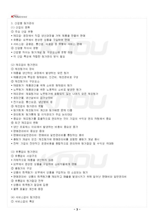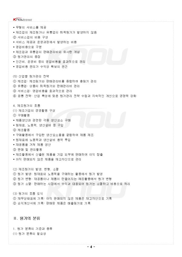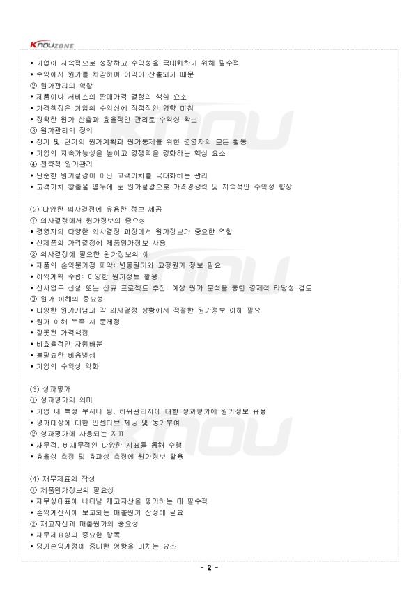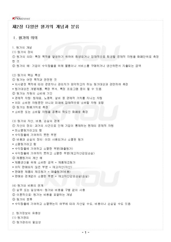¥°. ¿ø°¡ÀÇ ÀÇÀÇ 1. ¿ø°¡ÀÇ °³³ä (1) ¿ø°¡ÀÇ Á¤ÀÇ ¨ç ¿ø°¡ÀÇ ÀǹÌ: ƯÁ¤ ¸ñÀûÀ» ´Þ¼ºÇϱâ À§ÇÏ¿© Èñ»ýµÇ°Å³ª ÀáÀçÀûÀ¸·Î Èñ»ýµÉ °æÁ¦Àû ÀÚ¿øÀ» ÈÆó´ÜÀ§·Î ÃøÁ¤ÇÑ °Í ¨è ¿ø°¡ÀÇ ¿¹: ±â¾÷ÀÌ ¼öÀÍâÃâÀ» À§ÇØ ¹°Ç°À̳ª ¼ºñ½º¸¦ ±¸¸ÅÇϰųª »ý»êÇÏ¸é¼ ÁöÃâµÇ´Â ±Ý¾× (2) ¿ø°¡ÀÇ ÇÙ½É Æ¯¼º ¨ç ¿ø°¡´Â ¾î¶² ¸ñÀû°ú °ü·ÃµÈ °Í • ÀÇ»ç°áÁ¤ ¸ñÀû¿¡ µû¶ó °æ¿µÀÚ³ª °ü¸®ÀÚ°¡ ÆÄ¾ÇÇϰíÀÚ ÇÏ´Â ¿ø°¡´ë»ó°ú °ü·ÃÇÏ¿© ÃøÁ¤ • ¿ø°¡´ë»óÀº °³º°Á¦Ç°, ƯÁ¤ ºÎ¼, ƯÁ¤ ÇÁ·Î±×·¥ µîÀÌ µÉ ¼ö ÀÖÀ½ ¨è ¿ø°¡´Â ÀÚ¿øÀÇ ¼Òºñ¿¡ ±âÀÎ • °æÁ¦Àû ÀÚ¿ø: ¿øÀç·á, ³ëµ¿·Â, ¼³ºñ µî °æÁ¦Àû °¡Ä¡¸¦ Áö´Ï´Â ÀÚ¿ø • ÀÌ¹Ì ¼ÒºñµÈ ÀÚ¿ø»Ó¸¸ ¾Æ´Ï¶ó ¹Ì·¡¿¡ ÀáÀçÀûÀ¸·Î ¼ÒºñµÉ ÀÚ¿ø Æ÷ÇÔ ¨é ¿ø°¡´Â ÈÆó°¡Ä¡·Î ÃøÁ¤ • ¼ÒºñµÈ ¶Ç´Â ¼ÒºñµÉ ÀÚ¿øÀ» °øÅëÀÇ Ã´µµÀÎ ÈÆó·Î ÃøÁ¤ (3) ¿ø°¡¿Í ÀÚ»ê, ºñ¿ë, ¼Õ½ÇÀÇ °ü°è ¨ç ÀÚ»êÀÇ Á¤ÀÇ: °ú°ÅÀÇ »ç°ÇÀ¸·Î ÀÎÇØ ±â¾÷ÀÌ ÅëÁ¦ÇÏ´Â ÇöÀçÀÇ °æÁ¦Àû ÀÚ¿ø • ¹Ì¼Ò¸ê¿ø°¡¶ó°íµµ ÇÔ • ¼öÀÍâÃâ¿¡ ±â¿©ÇÏÁö ¸øÇÑ ºÎºÐ ¨è ºñ¿ë°ú ¼Õ½ÇÀÇ Á¤ÀÇ: ÀÌ¹Ì »ç¿ëµÇ°Å³ª ¼Ò¸êµÈ ¿ø°¡ • ¼Ò¸ê¿ø°¡¶ó°í ÇÔ • ¼öÀÍâÃâ¿¡ ±â¿©ÇÏ°í ¼Ò¸êÇÑ ºÎºÐ(¸ÅÃâ¿ø°¡) • ¼öÀÍâÃâ¿¡ ±â¿©ÇÏÁö ¸øÇÏ°í ¼Ò¸êÇÑ ºÎºÐ(Àç°íÀڻ갨¸ð¼Õ½Ç) ¨é Á¦Ç°¿ø°¡ÀÇ °è»ê ¿¹ • Á¦Ç°»ý»êÀ» À§ÇØ ¼ÒºñÇÑ ±Ý¾× = Á¦Ç°Á¦Á¶¿ø°¡ • ¾ÆÁ÷ ÆÇ¸ÅµÇÁö ¾ÊÀº ºÎºÐ = Àç°íÀÚ»ê(ÀÚ»ê) • ÆÇ¸ÅµÈ Á¦Ç°ÀÇ Á¦Á¶¿ø°¡ = ¸ÅÃâ¿ø°¡(ºñ¿ë) • ÆÇ¸Å¿Í °ü°è¾øÀÌ ¼Ò¸êµÈ ºÎºÐ = Àç°íÀڻ갨¸ð¼Õ½Ç(¼Õ½Ç) (4) ¿ø°¡¿Í ºñ¿ëÀÇ °ü°è ¨ç ½Ç¹« ¶Ç´Â Àϻ󿡼: ¿ø°¡¿Í ºñ¿ëÀ» ±¸º° ¾øÀÌ »ç¿ë ¨è ÀÌ·ÐÀûÀ¸·Î: ¿ø°¡´Â ºñ¿ëÀ» Æ÷°ýÇÏ´Â °³³ä ¨é ¿ø°¡ÀÇ ºÐ·ù • ¼öÀÍâÃâ¿¡ ±â¿©ÇÏ°í ¼Ò¸êÇß´ÂÁö ¿©ºÎ¿¡ µû¶ó ÀÚ»êÀÏ ¼öµµ, ºñ¿ëÀ̳ª ¼Õ½ÇÀÏ ¼öµµ ÀÖÀ½ 2. ¿ø°¡Á¤º¸ÀÇ À¯¿ë¼º (1) ¿ø°¡°ü¸® ¨ç ¿ø°¡°ü¸®ÀÇ Çʿ伺 • ±â¾÷ÀÌ Áö¼ÓÀûÀ¸·Î ¼ºÀåÇÏ°í ¼öÀͼºÀ» ±Ø´ëÈÇϱâ À§ÇØ ÇʼöÀû • ¼öÀÍ¿¡¼ ¿ø°¡¸¦ Â÷°¨ÇÏ¿© ÀÌÀÍÀÌ »êÃâµÇ±â ¶§¹® ¨è ¿ø°¡°ü¸®ÀÇ ¿ªÇÒ • Á¦Ç°À̳ª ¼ºñ½ºÀÇ ÆÇ¸Å°¡°Ý °áÁ¤ÀÇ ÇÙ½É ¿ä¼Ò • °¡°ÝÃ¥Á¤Àº ±â¾÷ÀÇ ¼öÀͼº¿¡ Á÷Á¢ÀûÀÎ ¿µÇâ ¹Ìħ • Á¤È®ÇÑ ¿ø°¡ »êÃâ°ú È¿À²ÀûÀÎ °ü¸®·Î ¼öÀͼº È®º¸ ¨é ¿ø°¡°ü¸®ÀÇ Á¤ÀÇ • Àå±â ¹× ´Ü±âÀÇ ¿ø°¡°èȹ°ú ¿ø°¡ÅëÁ¦¸¦ À§ÇÑ °æ¿µÀÚÀÇ ¸ðµç Ȱµ¿ • ±â¾÷ÀÇ Áö¼Ó°¡´É¼ºÀ» ³ôÀÌ°í °æÀï·ÂÀ» °ÈÇÏ´Â ÇÙ½É ¿ä¼Ò ¨ê Àü·«Àû ¿ø°¡°ü¸® • ´Ü¼øÇÑ ¿ø°¡Àý°¨ÀÌ ¾Æ´Ñ °í°´°¡Ä¡¸¦ ±Ø´ëÈÇÏ´Â °ü¸® • °í°´°¡Ä¡ âÃâÀ» ¿°µÎ¿¡ µÐ ¿ø°¡Àý°¨À¸·Î °¡°Ý°æÀï·Â ¹× Áö¼ÓÀûÀÎ ¼öÀͼº Çâ»ó (2) ´Ù¾çÇÑ ÀÇ»ç°áÁ¤¿¡ À¯¿ëÇÑ Á¤º¸ Á¦°ø ¨ç ÀÇ»ç°áÁ¤¿¡¼ ¿ø°¡Á¤º¸ÀÇ Á߿伺 • °æ¿µÀÚÀÇ ´Ù¾çÇÑ ÀÇ»ç°áÁ¤ °úÁ¤¿¡¼ ¿ø°¡Á¤º¸°¡ Áß¿äÇÑ ¿ªÇÒ • ½ÅÁ¦Ç°ÀÇ °¡°Ý°áÁ¤¿¡ Á¦Ç°¿ø°¡Á¤º¸ »ç¿ë ¨è ÀÇ»ç°áÁ¤¿¡ ÇÊ¿äÇÑ ¿ø°¡Á¤º¸ÀÇ ¿¹ • Á¦Ç°ÀÇ ¼ÕÀͺбâÁ¡ ÆÄ¾Ç: º¯µ¿¿ø°¡¿Í °íÁ¤¿ø°¡ Á¤º¸ ÇÊ¿ä • ÀÌÀͰèȹ ¼ö¸³: ´Ù¾çÇÑ ¿ø°¡Á¤º¸ Ȱ¿ë • ½Å»ç¾÷ºÎ ½Å¼³ ¶Ç´Â ½Å±Ô ÇÁ·ÎÁ§Æ® ÃßÁø: ¿¹»ó ¿ø°¡ ºÐ¼®À» ÅëÇÑ °æÁ¦Àû Ÿ´ç¼º °ËÅä ¨é ¿ø°¡ ÀÌÇØÀÇ Á߿伺 • ´Ù¾çÇÑ ¿ø°¡°³³ä°ú °¢ ÀÇ»ç°áÁ¤ »óȲ¿¡¼ ÀûÀýÇÑ ¿ø°¡Á¤º¸ ÀÌÇØ ÇÊ¿ä • ¿ø°¡ ÀÌÇØ ºÎÁ· ½Ã ¹®Á¦Á¡ • À߸øµÈ °¡°ÝÃ¥Á¤ • ºñÈ¿À²ÀûÀÎ ÀÚ¿ø¹èºÐ • ºÒÇÊ¿äÇÑ ºñ¿ë¹ß»ý • ±â¾÷ÀÇ ¼öÀͼº ¾ÇÈ (3) ¼º°úÆò°¡ ¨ç ¼º°úÆò°¡ÀÇ ÀÇ¹Ì • ±â¾÷ ³» ƯÁ¤ ºÎ¼³ª ÆÀ, ÇÏÀ§°ü¸®ÀÚ¿¡ ´ëÇÑ ¼º°úÆò°¡¿¡ ¿ø°¡Á¤º¸ À¯¿ë • Æò°¡´ë»ó¿¡ ´ëÇÑ Àμ¾Æ¼ºê Á¦°ø ¹× µ¿±âºÎ¿© ¨è ¼º°úÆò°¡¿¡ »ç¿ëµÇ´Â ÁöÇ¥ • À繫Àû, ºñÀ繫ÀûÀÎ ´Ù¾çÇÑ ÁöÇ¥¸¦ ÅëÇØ ¼öÇà • È¿À²¼º ÃøÁ¤ ¹× È¿°ú¼º ÃøÁ¤¿¡ ¿ø°¡Á¤º¸ Ȱ¿ë - Áß·« - |