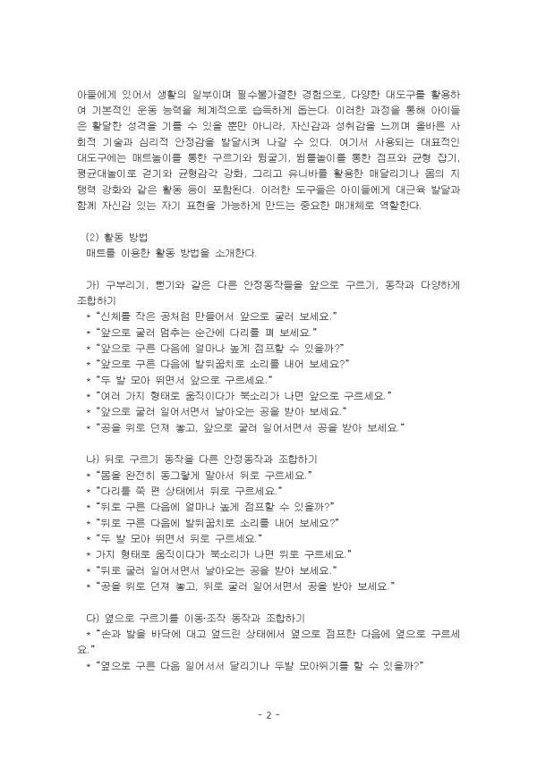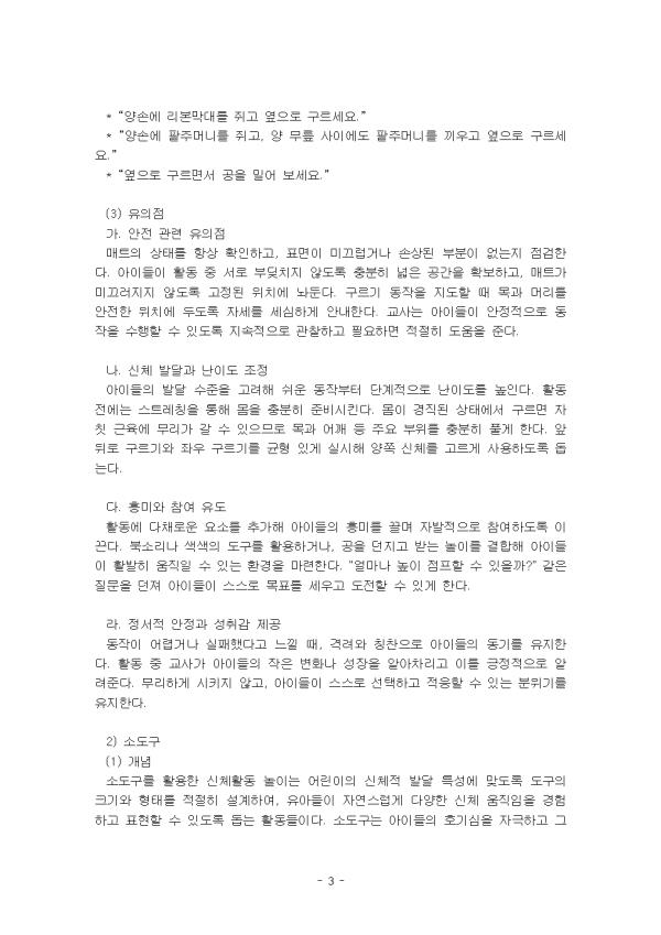 À¯¾Æµ¿ÀÛ±³À°Àº À¯¾Æµé¿¡°Ô ½Åü¸¦ ÅëÇØ¼ ±âº»ÀûÀÎ ¿òÁ÷ÀÓÀ» ¹è¿ì°Ô Çϰí, ÁÖÀ§ ¼¼°è¸¦ Ž»öÇÏ°í ¹è¿ö³ª°¥ ¼ö ÀÖ´Â ±âȸ¸¦ Á¦°øÇØ ÁØ´Ù. ¶ÇÇÑ À¯¾Æµ¿ÀÛ±³À°À̶õ À¯¾Æµé¿¡ ±âº»ÀûÀÎ µ¿ÀÛ´É·ÂÀ» ±æ·¯ÁÖ°í ÀÎÁö, »çȸ, Á¤¼¹ß´ÞÀ» Àß Çϵµ·Ï µµ¿ÍÁÖ¸ç, À¯¾Æ±³À°ÀÇ ±âº»¸ñÀûÀ» ÀÌ·ç±â À§ÇÑ ÇÑ ¹æ¹ýÀ¸·Î¼ ±ÕÇü ÀÖ°í Á¶È·Î¿î ÀüÀα³À°À» °¡´ÉÇÏ°Ô ÇÑ´Ù. À¯¾Æµ¿ÀÛ±³À°¿¡¼ ÁַΠȰ¿ëµÇ´Â Ȱµ¿ ÀÚ·á¿Í ´Ù¾çÇÑ µµ±¸µéÀº ¾ÆÀ̵éÀÇ ¹ß´ÞÀû Ư¼º°ú °¢ ±³À° Ȱµ¿ÀÇ ¸ñÇ¥¿¡ ºÎÇÕÇϵµ·Ï ½ÅÁßÈ÷ ¼±Åõǰí ÀûÀýÈ÷ Ȱ¿ëµÇ¾î¾ß ÇÑ´Ù. ÀÌ·¯ÇÑ µµ±¸µé¿¡´Â ´ëµµ±¸¿Í ¼Òµµ±¸°¡ Æ÷ÇԵǸç, °¢°¢ÀÇ µµ±¸´Â À¯¾ÆµéÀÇ ½ÅüÀû ¹ß´Þ»Ó¸¸ ¾Æ´Ï¶ó âÀÇÀû Ç¥Çö ´É·Â°ú Çùµ¿ ´É·Â, ±×¸®°í ¹®Á¦¸¦ ÇØ°áÇÏ´Â ´É·ÂÀ» ±æ·¯ÁÖ´Â Áß¿äÇÑ ¿ªÇÒÀ» ´ã´çÇÑ´Ù. ¿¹¸¦ µé¾î, ´ëµµ±¸´Â ½ÅüÀÇ Àü¹ÝÀûÀÎ Å« ±ÙÀ°À» »ç¿ëÇϰųª, ¸ö Àüü¸¦ ¿òÁ÷ÀÌ´Â Àü½Å ¿îµ¿À» ÃËÁøÇϱâ À§ÇØ ¼³°èµÇ¾î ÀÖ¾î ÁÖ·Î ¾Å¾Å Ÿ´Â ÀÚÀü°Å³ª ±ÕÇü Àâ±â ±â±¸ °°Àº ¿ø°Å¸® µ¿ÀÛ¿¡ ÀûÇÕÇÏ´Ù. ¹Ý¸é, ¼Òµµ±¸´Â »ó´ëÀûÀ¸·Î Å©±â°¡ ÀÛ°í ¾ÆÀ̵éÀÌ ¼Õ°ú ´«ÀÇ Á¶È¸¦ ÀÌ·ç¸ç »ç¿ëÇϱ⠶§¹®¿¡, ¼Ò±ÙÀ°ÀÇ ¹ß´ÞÀ» µ½°Å³ª ´õ Á¤±³ÇÑ ¿òÁ÷ÀÓ°ú µ¿ÀÛÀ» ¿¬½ÀÇÏ´Â µ¥ Ȱ¿ëµÈ´Ù. ¿¹¸¦ µé¾î, ÀÛÀº °øÀ̳ª ºí·Ï °°Àº µµ±¸°¡ ÀÌ¿¡ ÇØ´çÇϸç, ¾ÆÀ̵éÀÌ ¼¼¹ÐÇÑ Á¶ÀÛ ´É·ÂÀ» ±â¸¦ ¼ö ÀÖ´Â ±âȸ¸¦ Á¦°øÇÑ´Ù. ÀÌ ·¹Æ÷Æ®´Â À¯¾Æ µ¿ÀÛ È°µ¿¿¡ Ȱ¿ëÇÒ ¼ö ÀÖ´Â ´ëµµ±¸ Áß 1°³, ¼Òµµ±¸ Áß 1°³¸¦ ¼±ÅÃÇÏ¿©, ´Ù¾çÇÑ È°µ¿ ¹æ¹ýÀ» ±â¼ú, À¯¾Æ¿¬·ÉÀ̳ª µµ±¸ÀÇ Æ¯¼º µîÀ» °í·ÁÇÒ ¶§ À¯ÀÇÁ¡¿¡ ´ëÇØ¼µµ ±â¼úÇÏ¿´´Ù. ±×¸®°í ÃÖ±Ù »õ·Ó°Ô ³ª¿Â À¯¾Æ±³À°±â°ü¿¡¼ Ȱ¿ë °¡´ÉÇÑ µ¿ÀÛ È°µ¿ ´ëµµ±¸ ¹× ¼Òµµ±¸¸¦ Á¦½ÃÇϰí, Ȱ¿ë¹æ¹ý, À¯ÀÇÁ¡¿¡ ´ëÇØ ±â¼úÇÏ¿´´Ù. II. º» ·Ð 1. ´ëµµ±¸¿Í ¼Òµµ±¸ 1) ´ëµµ±¸ (1) °³³ä À¯¾Æµ¿ÀÛ±³À°¿¡¼ Ȱ¿ëµÇ´Â ´ëµµ±¸´Â ¾ÆÀ̵鿡°Ô ´Ù¾çÇÑ ¿òÁ÷ÀÓÀÇ ±âȸ¸¦ Á¦°øÇϸç, ±¸¸£±â, ¶Ù±â, ±â¾î¿À¸£±â, ¹Ù¸£°Ô °È±â, ¸Å´Þ¸®±â, ¸öÀ» ±ÁÈ÷±â µî »ýȰ¿¡¼ ÀÚ¿¬½º·´°Ô ÀÌ·ç¾îÁö´Â ÇʼöÀûÀΠȰµ¿µéÀ» ´õ¿í ü°èÀûÀ̰í È¿°úÀûÀ¸·Î ÀÍÈú ¼ö ÀÖµµ·Ï ¸¸µé¾îÁø µµ±¸µéÀÌ´Ù. ÀÌ¿Í °°Àº Ȱµ¿Àº ´Ü¼øÈ÷ ½ÅüÀûÀÎ ¿òÁ÷ÀÓÀ» ³Ñ¾î¼¼ À¯¾Æµé¿¡°Ô ÀÖ¾î¼ »ýȰÀÇ ÀϺÎÀ̸ç ÇʼöºÒ°¡°áÇÑ °æÇèÀ¸·Î, ´Ù¾çÇÑ ´ëµµ±¸¸¦ Ȱ¿ëÇÏ¿© ±âº»ÀûÀÎ ¿îµ¿ ´É·ÂÀ» ü°èÀûÀ¸·Î ½ÀµæÇÏ°Ô µ½´Â´Ù. ÀÌ·¯ÇÑ °úÁ¤À» ÅëÇØ ¾ÆÀ̵éÀº Ȱ´ÞÇÑ ¼º°ÝÀ» ±â¸¦ ¼ö ÀÖÀ» »Ó¸¸ ¾Æ´Ï¶ó, Àڽۨ°ú ¼ºÃë°¨À» ´À³¢¸ç ¿Ã¹Ù¸¥ »çȸÀû ±â¼ú°ú ½É¸®Àû ¾ÈÁ¤°¨À» ¹ß´Þ½ÃÄÑ ³ª°¥ ¼ö ÀÖ´Ù. ¿©±â¼ »ç¿ëµÇ´Â ´ëÇ¥ÀûÀÎ ´ëµµ±¸¿¡´Â ¸ÅÆ®³îÀ̸¦ ÅëÇÑ ±¸¸£±â¿Í µß±¼±â, ¶ÜƲ³îÀ̸¦ ÅëÇÑ Á¡ÇÁ¿Í ±ÕÇü Àâ±â, Æò±Õ´ë³îÀÌ·Î °È±â¿Í ±ÕÇü°¨°¢ °È, ±×¸®°í À¯´Ï¹Ù¸¦ Ȱ¿ëÇÑ ¸Å´Þ¸®±â³ª ¸öÀÇ ÁöÅÊ·Â °È¿Í °°Àº Ȱµ¿ µîÀÌ Æ÷ÇԵȴÙ. ÀÌ·¯ÇÑ µµ±¸µéÀº ¾ÆÀ̵鿡°Ô ´ë±ÙÀ° ¹ß´Þ°ú ÇÔ²² Àڽۨ ÀÖ´Â ÀÚ±â Ç¥ÇöÀ» °¡´ÉÇÏ°Ô ¸¸µå´Â Áß¿äÇÑ ¸Å°³Ã¼·Î ¿ªÇÒÇÑ´Ù. (2) Ȱµ¿ ¹æ¹ý ¸ÅÆ®¸¦ ÀÌ¿ëÇÑ È°µ¿ ¹æ¹ýÀ» ¼Ò°³ÇÑ´Ù. °¡) ±¸ºÎ¸®±â, »¸±â¿Í °°Àº ´Ù¸¥ ¾ÈÁ¤µ¿ÀÛµéÀ» ¾ÕÀ¸·Î ±¸¸£±â, µ¿ÀÛ°ú ´Ù¾çÇÏ°Ô Á¶ÇÕÇϱâ * ¡°½Åü¸¦ ÀÛÀº °øÃ³·³ ¸¸µé¾î¼ ¾ÕÀ¸·Î ±¼·¯ º¸¼¼¿ä.¡± * ¡°¾ÕÀ¸·Î ±¼·¯ ¸ØÃß´Â ¼ø°£¿¡ ´Ù¸®¸¦ Æì º¸¼¼¿ä.¡± * ¡°¾ÕÀ¸·Î ±¸¸¥ ´ÙÀ½¿¡ ¾ó¸¶³ª ³ô°Ô Á¡ÇÁÇÒ ¼ö ÀÖÀ»±î?¡± * ¡°¾ÕÀ¸·Î ±¸¸¥ ´ÙÀ½¿¡ ¹ßµÚ²ÞÄ¡·Î ¼Ò¸®¸¦ ³»¾î º¸¼¼¿ä?¡± * ¡°µÎ ¹ß ¸ð¾Æ ¶Ù¸é¼ ¾ÕÀ¸·Î ±¸¸£¼¼¿ä.¡± * ¡°¿©·¯ °¡Áö ÇüÅ·Π¿òÁ÷ÀÌ´Ù°¡ ºÏ¼Ò¸®°¡ ³ª¸é ¾ÕÀ¸·Î ±¸¸£¼¼¿ä.¡± * ¡°¾ÕÀ¸·Î ±¼·¯ ÀÏ¾î¼¸é¼ ³¯¾Æ¿À´Â °øÀ» ¹Þ¾Æ º¸¼¼¿ä.¡± * ¡°°øÀ» À§·Î ´øÁ® ³õ°í, ¾ÕÀ¸·Î ±¼·¯ ÀÏ¾î¼¸é¼ °øÀ» ¹Þ¾Æ º¸¼¼¿ä.¡± ³ª) µÚ·Î ±¸¸£±â µ¿ÀÛÀ» ´Ù¸¥ ¾ÈÁ¤µ¿ÀÛ°ú Á¶ÇÕÇϱâ * ¡°¸öÀ» ¿ÏÀüÈ÷ µ¿±×¶þ°Ô ¸»¾Æ¼ µÚ·Î ±¸¸£¼¼¿ä.¡± * ¡°´Ù¸®¸¦ Âß Æí »óÅ¿¡¼ µÚ·Î ±¸¸£¼¼¿ä.¡± * ¡°µÚ·Î ±¸¸¥ ´ÙÀ½¿¡ ¾ó¸¶³ª ³ô°Ô Á¡ÇÁÇÒ ¼ö ÀÖÀ»±î?¡± * ¡°µÚ·Î ±¸¸¥ ´ÙÀ½¿¡ ¹ßµÚ²ÞÄ¡·Î ¼Ò¸®¸¦ ³»¾î º¸¼¼¿ä?¡± * ¡°µÎ ¹ß ¸ð¾Æ ¶Ù¸é¼ µÚ·Î ±¸¸£¼¼¿ä.¡± * °¡Áö ÇüÅ·Π¿òÁ÷ÀÌ´Ù°¡ ºÏ¼Ò¸®°¡ ³ª¸é µÚ·Î ±¸¸£¼¼¿ä.¡± * ¡°µÚ·Î ±¼·¯ ÀÏ¾î¼¸é¼ ³¯¾Æ¿À´Â °øÀ» ¹Þ¾Æ º¸¼¼¿ä.¡± * ¡°°øÀ» À§·Î ´øÁ® ³õ°í, µÚ·Î ±¼