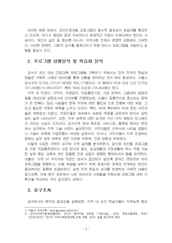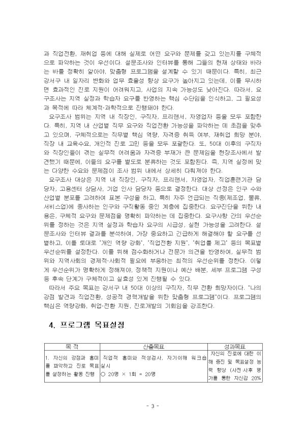 Æò»ý±³À°Àº ¸ðµç °³ÀÎÀº ÀÏ»ýÀ» ÅëÇØ °è¼ÓÀûÀ¸·Î ±³À°À» ¹Þ¾Æ¾ß¸¸ ÇÑ´Ù´Â °üÁ¡ÀÌ Æ÷ÇÔÇÑ´Ù. ÇнÀ»çȸ °Ç¼³ÀÇ Ãʼ®ÀÌ¸ç ¹Ì·¡ÀÇ ±³À°À» À̲ø¾î °¥ Áß¿äÇÑ ÆÐ·¯´ÙÀÓÀÌ ÇÔÃàµÇ¾î ÀÖ´Ù. Æò»ý±³À°°ú ÇÁ·Î±×·¥°³¹ßÀº °úÇбâ¼úÀÇ ¹ß´Þ°ú Áö½ÄÀÇ Æø¹ßÀûÀÎ Áõ°¡´Â Çö´ëÀο¡°Ô °ú°Å¿¡ ½ÀµæÇß´ø Á¤º¸¿Í Áö½Ä¿¡ ¾ÈÁÖÇÏ´Â °ÍÀ» Çã¶ôÇÏÁö ¾Ê°í »õ·Î¿î º¯È¿¡ ²÷ÀÓ¾øÀÌ ÀûÀÀÇØ ³ª°¥ °ÍÀ» ¿ä±¸Çϰí ÀÖ´Ù. °¡±î¿î ¹Ì·¡¿¡´Â Æò»ý±³À°ÀÌ Á¤±Ô±³À°º¸´Ù ±¹°¡¹ßÀü°ú ¹ø¿µ¿¡ ´õ ¸¹ÀÌ ±â¿©ÇÒ °ÍÀ¸·Î ¿¹»óµÈ´Ù. Æò»ý±³À°ÀÇ ÇÁ·Î±×·¥°³¹ßÀº ¼Ò¿ÜµÈ °èÃþ¿¡ ´ëÇÑ ±³À°°ú ÇнÀ±âȸ¸¦ Á¦°øÇÑ´Ù. ±Þº¯ÇÏ´Â Çö´ë»çȸ¿¡¼ µµÅµÇÁö ¾Ê°í Áö¼ÓÀûÀ¸·Î ¼ºÀå °¡´ÉÇÑ °³ÀÎÀ¸·Î ´É·Â°ú Áö½ÄÀ» ÇÔ¾ç½ÃŲ´Ù. Çö´ëÀÎÀÌ ÀÒ¾î¹ö¸®±â ½¬¿î ¿©À¯¿Í ±³¾ç ¹× Ãë¹Ì ․ ¿À¶ô»ýȰÀ» ´©¸± ¼ö ÀÖ´Â ±âȸ¸¦ Á¦°øÇÑ´Ù. Çö´ë»çȸ¿¡¼ ¹ß»ýµÇ´Â ¿©·¯ °¡Áö »çȸÀû ¹®Á¦¿Í ȯ°æÆÄ±«¸¦ ¿¹¹æÇÒ ¼ö ÀÖ´Â ±³À°À» ½Ç½ÃÇÑ´Ù. ¹°Áú¸¸´ÉÁÖÀÇ·Î È帣±â ½¬¿î Çö´ë»çȸ¿¡¼ À̰£¼ºÈ¸º¹°ú ÀüÀα³À° Â÷¿ø¿¡¼ Æò»ý±³À°À» Á¶¸ÁÇÒ ¼ö ÀÖ´Ù. ÀÌ ·¹Æ÷Æ®´Â Æò»ýÇнÀ»çȸ ±¸Çö°ú 100¼¼ ½Ã´ë¸¦ ¸ÂÀÌÇÏ¿© ¿ì¸®°¡ ´ç¸éÇÑ ¡®¼ºÀÎÁø·Î°³¹ß¡¯ÀÇ ¹®Á¦Á¡À» ºÐ¼®Çϰí, ±×°ÍÀ» ÇØ°áÇϱâ À§ÇÑ ±³À°Àû ¹æ¾ÈÀ¸·Î¼ ÀûÀýÇÑ Æò»ý±³À°ÇÁ·Î±×·¥À» °³¹ßÇÏ¿´´Ù. II. º» ·Ð 1. ÇÁ·Î±×·¥°³¹ßÀÇ Çʿ伺 °ËÅä ¹× ÃßÁø¿©ºÎ °áÁ¤ ¿ì¸®³ª¶ó°¡ 100¼¼ ½Ã´ë¿¡ Á¢¾îµé¸é¼ Æò»ý µ¿¾È ¿©·¯ ¹øÀÇ Á÷¾÷ Àüȯ°ú »õ·Î¿î ±â¼ú ½ÀµæÀÌ ¿ä±¸µÇ°í ÀÖÀ¸¸ç, ÀÌ´Â °³ÀÎÀÇ °æÀï·Â È®º¸¿Í Á÷¾÷Àû ¾ÈÁ¤¼ºÀ» À§ÇØ ¹Ýµå½Ã ÇÊ¿äÇÏ´Ù. ƯÈ÷, °¼±¸´Â ¼¿ï½Ã ³»¿¡¼µµ Àα¸°¡ Áõ°¡Çϰí ÀÖ´Â Áö¿ªÀ¸·Î, ´Ù¾çÇÑ ¿¬·É´ë¿Í Á÷¾÷±ºÀ» Æ÷°ýÇÏ´Â ¼ºÀÎ Àα¸°¡ Á¸ÀçÇÑ´Ù. À̵éÀÌ Á÷Àå ³»¿¡¼ Áö¼ÓÀûÀ¸·Î ¼ºÀåÇÏ°í º¯ÈÇϴ ȯ°æ¿¡ ÀûÀÀÇϱâ À§Çؼ´Â ü°èÀûÀÎ Áø·Î°³¹ß Áö¿øÀÌ ÇʼöÀÌ´Ù. ÃÖ±Ù °í¿ë½ÃÀåÀÇ À¯¿¬¼º°ú ºÒ¾ÈÁ¤¼ºÀÌ ½ÉÈµÇ¸é¼ Á÷ÀåÀεéÀº »õ·Î¿î ¿ª·®°ú ±â¼úÀ» ½ÀµæÇÏ´Â µ¥ Àû±ØÀûÀÌ´Ù. ÀÌ¿Í °ü·ÃÇØ Á¤ºÎ¿Í Áö¹æÀÚÄ¡´Üü, ±â¾÷µéÀº Æò»ýÇнÀÀ» ÅëÇØ ³ëµ¿½ÃÀå¿¡¼ÀÇ Áö¼Ó°¡´É¼ºÀ» ³ôÀ̱â À§ÇÑ Á¤Ã¥°ú ÇÁ·Î±×·¥À» ÃßÁøÇϰí ÀÖÀ¸¸ç, ÀÌ´Â Áö¿ª Â÷¿ø¿¡¼µµ µ¿ÀÏÇÏ°Ô ¿ä±¸µÇ°í ÀÖ´Ù. ¶ÇÇÑ, °¼±¸ Áö¿ª ³» °¢ ±â°ü°ú ±â¾÷µéÀº ÀηÂÀÇ Àü¹®¼º Á¦°í¿Í Á÷¹« ¸¸Á·µµ Áõ´ë¸¦ À§ÇØ Àû±ØÀûÀÎ ±³À° ÇÁ·Î±×·¥À» µµÀÔÇÏ´Â Ãß¼¼¸¦ º¸À̰í ÀÖ´Ù. ÀÌ·¯ÇÑ ¹è°æ ÇÏ¿¡¼, ¼ºÀÎÁø·Î°³¹ß ÇÁ·Î±×·¥ÀÇ ÇʼöÀû Çʿ伺ÀÌ °ø°¨´ë¸¦ Çü¼ºÇϰí ÀÖÀ¸¸ç, ¿©±â¼ Áß¿äÇÑ Á¡Àº Áö¼ÓÀûÀ̰í ü°èÀûÀÎ Áö¿øÀÌ ÀÌ·ç¾îÁ®¾ß ÇÑ´Ù´Â »ç½ÇÀÌ´Ù. °³ÀÎÀÇ »îÀÇ Áú Çâ»ó»Ó ¾Æ´Ï¶ó, Áö¿ª»çȸ ÀüüÀÇ °æÀï·Â °È¿¡µµ ±â¿©ÇÑ´Ù. ÀÌ·¯ÇÑ Á¤Ã¥Àû, »çȸÀû ¿ä±¸¸¦ ÃæÁ·½Ã۱â À§ÇØ ¹Ýµå½Ã ÇÁ·Î±×·¥À» °³¹ßÇÏ°í ½ÇÇàÇÒ Çʿ䰡 ÀÖ´Ù. 2. ÇÁ·Î±×·¥ »óȲºÐ¼® ¹× ÇнÀÀÚ ºÐ¼® °¼±¸ ¼ºÀÎ ´ë»ó Áø·Î±³À° ÇÁ·Î±×·¥À» ±âȹÇϱâ À§Çؼ´Â ¸ÕÀú Áö¿ªÀÇ Çö½Ç°ú ¸Â´êÀº ±¸Ã¼Àû »ç·Ê¿Í µ¥ÀÌÅ͸¦ ÅëÇØ »óȲÀ» ÆÄ¾ÇÇÏ´Â °ÍÀÌ ¸Å¿ì Áß¿äÇÏ´Ù. ¼¿ï½Ã °¼±¸ÀÇ Àα¸´Â 273,911¼¼´ë·Î 556,171¸íÀÌ´Ù. ÀÌ Áß¿¡¼ 65¼¼ ÀÌ»ó ³ëÀÎ Àα¸´Â 107,246¸í(19.28%)ÀÌ´Ù. ƯÈ÷ 50´ë ÀÌ»óÀº 235,464¸íÀÌ µÈ´Ù. Áö¿ª ³» Á÷ÀåÀÎ, ±¸Á÷ÀÚ, ÀÚ¿µ¾÷ÀÚ, Á÷¾÷ÈÆ·Ã±â°ü, ±â¾÷ °ü°èÀÚ, °í¿ë¼¾ÅÍ ´ã´çÀÚ µîÀ» ´ë»óÀ¸·Î ¼³¹®Á¶»ç¿Í ÀÎÅͺ並 ÁøÇàÇߴµ¥, À̵éÀÌ °øÅëÀûÀ¸·Î È£¼ÒÇÏ´Â ¹®Á¦°¡ ù ¹øÂ°´Ù. ¸¹Àº »ç¶÷µéÀÌ ÇöÀç Á÷¹«¿¡ ´ëÇÑ ºÒ¸¸°ú Áø·Î Àüȯ¿¡ ´ëÇÑ ºÎ´ã, ±×¸®°í ÇÊ¿äÇÑ ¿ª·®ÀÇ ºÎÁ·À» ´À³¢°í ÀÖ¾ú´Ù. ƯÈ÷, 40´ë ÈĹݺÎÅÍ 50´ë ÃÊ¹Ý ±¸Á÷ÀÚµéÀº ÀçÃë¾÷ÀÌ ¾î·Æ°í, Á÷ÀåÀεéÀº °è¼ÓÇØ¼ »õ·Î¿î ¿ª·®À» °®Ãß¾î¾ß ÇÑ´Ù´Â ¾Ð¹Ú°¨ÀÌ ³ô°Ô ³ªÅ¸³µ´Ù. ¶ÇÇÑ, Á÷¹« ´É·Â¿¡ ´ëÇÑ ¿ä±¸¿Í ±¸ÀÎ-±¸Á÷ ¸ÅĪÀÇ ¹Ì½º¸ÅÄ¡°¡ Å©´Ù´Â »ç½ÇÀÌ µå·¯³µ´Ù. °¼Áö¿ª °ü³» Á¦Á¶¾÷, ¼ºñ½º¾÷, ¹°·ù¾÷ ºÐ¾ß´Â ÇöÀå¿¡¼ ¿ä±¸ÇÏ´Â Á÷¹« ±â¼ú ¼öÁØÀÌ ³ô¾ÆÁ³Áö¸¸, ±¸Á÷ÀÚµéÀº À̷¼¿¡ ³ªÅ¸³¾ °æÇèÀ̳ª ±â¼úÀÌ ºÎÁ·ÇØ Á÷¾÷ÀüȯÀÌ ¾î·Á¿î ½ÇÁ¤ÀÌ´Ù. ´õ±¸³ª, ±¸Á÷ÀÚµéÀÌ ÀÚÁÖ ¾ð±ÞÇÏ´Â ¹®Á¦´Â ½Ç¹« ´É·Â ºÎÁ·°ú °ü·Ã ÀÚ°ÝÁõ ¹ÌÃëµæ, Áø·Î ¹æÇ⼺ ºÎÀç¿´´Ù. ÀÌ·¸°Ô ¼öÁýµÈ ±¸Ã¼Àû ¿ä±¸¿Í Áö¿ª ½ÇŸ¦ ºÐ¼®Çϸé¼, ¾ÕÀ¸·Î Ã