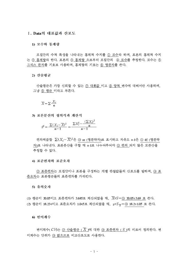 1) ¸ð¼ö¿Í Åë°è·® ¸ðÁý´ÜÀÇ ¼öÀû Ư¼ºÀ» ³ªÅ¸³»´Â Åë°èÀû ¼öÄ¡¸¦ ¨ç ¸ð¼ö/Åë°è·®¶ó Çϸç, Ç¥º»ÀÇ Åë°èÀû ¼öÄ¡´Â ¨è ¸ð¼ö/Åë°è·®¶ó ÇÑ´Ù. Ç¥º»ÀÇ ¨é Åë°è·®À¸·ÎºÎÅÍ ¸ðÁý´ÜÀÇ ¨ê ¸ð¼ö¸¦ ÃßÁ¤ÇÑ´Ù. ¸ð¼ö´Â ¨ë ±×¸®½º ¹®ÀÚ¸¦ ±âÈ£·Î »ç¿ëÇϸç, Åë°è·®ÀÇ ±âÈ£´Â ¨ì ¿µ¹®ÀÚ¸¦ ¾´´Ù. 2) »ê¼úÆò±Õ »ê¼úÆò±ÕÀº °¡Àå ½Å·ÚÇÒ ¼ö ÀÖ´Â ¨í ´ëÇ¥°ªÀÌ°í ¨î ¾çÀûº¯¼ö¿¡ ´ëÇØ¼¸¸ »ç¿ëÇϸç, ±×³É ¨ï Æò±ÕÀ̶ó°í ºÎ¸¥´Ù. 3) Ç¥º»ºÐ»êÀÇ Á¤Àǽİú °è»ê½Ä ÆíÂ÷Á¦°öÇÕ Àº ss (¿µ¹®¾àÀÚ)·Î Ç¥½ÃÇϰí ÀÚÀ¯µµ n-1Àº df (¿µ¹®¾àÀÚ)·Î ³ªÅ¸³½´Ù. Ç¥º»ºÐ»êÀ» ±¸ÇÒ ¶§ n-1·Î ³ª´©¾îÁÖ¾î¾ß ÆíÀǵÇÁö ¾ÊÀº ¸ðºÐ»êÀ» ÃßÁ¤ÇÒ ¼ö ÀÖ´Ù. 4) Ç¥ÁØÆíÂ÷¿Í Ç¥ÁØ¿ÀÂ÷ Ç¥ÁØÆíÂ÷/Ç¥ÁØ¿ÀÂ÷´Â ¸ðÁý´ÜÀ̳ª Ç¥º»À» ±¸¼ºÇÏ´Â °³º° °üÂû°ªµéÀÇ »êÆ÷µµ¸¦ ¸»ÇÏ ¸ç, Ç¥ÁØÆíÂ÷/Ç¥ÁØ¿ÀÂ÷´Â Ç¥º»Æò±ÕµéÀÇ Ç¥ÁØÆíÂ÷¸¦ °¡¸®Å²´Ù. 5) À¯ÀǼýÀÚ (1) Æò±ÕÀÌ 20.05À̰í Ç¥ÁØÆíÂ÷°¡ 3.685·Î °è»êµÇ¾úÀ» ¶§, 20.05¡¾3.69·Î ¾´´Ù. (2) Æò±ÕÀÌ 18.234À̰í Ç¥ÁØ¿ÀÂ÷°¡ 1.045·Î °è»êµÇ¾úÀ» ¶§, 18.2¡¾1.05·Î ¾´´Ù. 6) º¯À̰è¼ö º¯À̰è¼ö()´Â »ê¼úÆò±Õ ( )¿¡ ´ëÇÑ Ç¥ÁØÆíÂ÷( )ÀÇ ºñ·Î¼ Á¤ÀÇÇÑ´Ù. º¯À̰è¼ö´Â ´ÜÀ§°¡ ÀÖÀ¸¹Ç·Î/¾øÀ¸¹Ç·Î ºñ±³»êÆ÷µµ·Î »ç¿ëÇÑ´Ù. - Áß·« - |