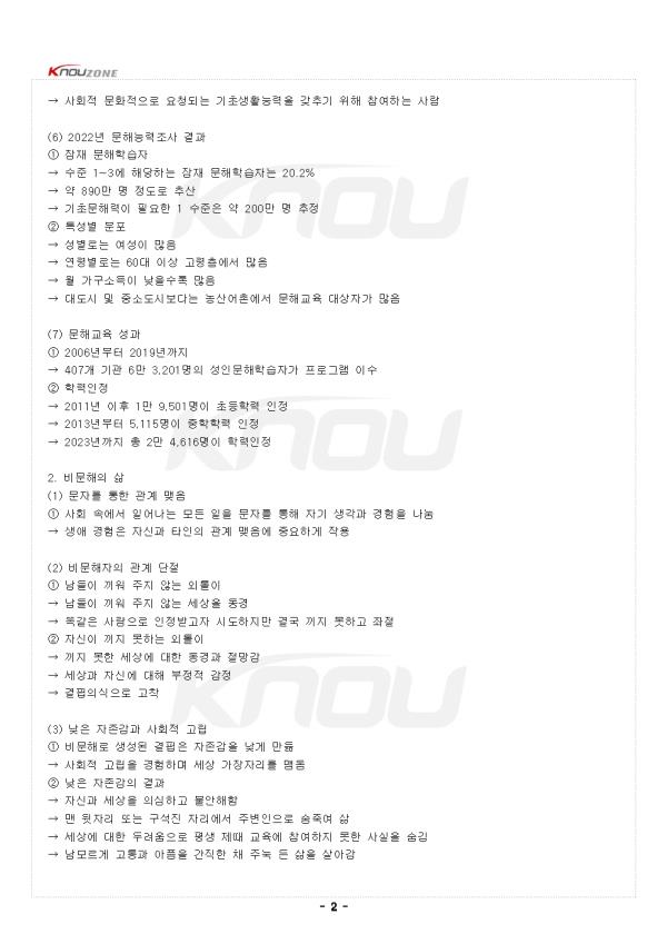 ¥°. ºñ¹®ÇØÀÇ ¿øÀÎ 1. ¹ß»ý ¿øÀΰú ÇöȲ (1) ¹®ÇØÇнÀÀÚÀÇ Á¤ÀÇ ¨ç ±³À°¿¡ Âü¿©ÇÒ ±âȸ¸¦ ´©¸®Áö ¸øÇÑ »îÀ» »ì¾Æ¿Â »ç¶÷µé ¡æ ÇнÀÀº ÇØ¾ß ÇÒ ½Ã±â°¡ ÀÖÀ½ ¡æ ¶§¸¦ ³õÄ¡°í ¹®ÇØ ÇöÀå¿¡ ÁøÀÔÇÏ´Â ¼ºÀι®ÇØÇнÀÀÚÀÇ Âü¿© ÀÌÀ¯´Â ´Ù¾ç (2) ÇнÀ ÁøÇÐÀ» ¹æÇØÇÏ´Â ÁÖµÈ ¿øÀÎ ¨ç °¡³ÇÑ ÇüÆí ¡æ °¡³ÇÑ °¡Á¤ÇüÆíÀÌ ÇнÀ ±âȸ ¹èÁ¦ÀÇ ÁÖ¿ä ¿øÀÎ ¨è ¿©ÀÚ¶ó´Â ÀÌÀ¯ ¡æ ¿©ÀÚ´Â ÇнÀÇÏÁö ¾Ê¾Æµµ µÈ´Ù´Â »çȸÀû ÀÎ½Ä ¡æ ÀÇ»ç °áÁ¤±ÇÀ» °¡Áø ¾Æ¹öÁöÀÇ ¿µÇâÀÌ Å ¨é ³²¾Æ¼±È£ »ç»ó ¡æ ¹®ÈÀûÀ¸·Î ¿µÇâÀ» ¹ÞÀº ³²¾Æ¼±È£ »ç»ó ¡æ ¾ÆµéÀº Çб³¿¡ ÁøÇнÃŰ´Â ¹Ý¸é µþÀº ÇнÀ ±âȸ¿¡¼ ¹èÁ¦ ¨ê ±âŸ ¿øÀÎ ¡æ ½ÅüÀû Àå¾Ö, µ¿»ý µ¹º¸±â, ºÎ¸ðÀÇ ¹«Áö µî (3) ºñ¹®ÇØÀÇ ´ë¹°¸² Çö»ó ¨ç ¸¹ÀÌ ÇнÀÇÏÁö ¸øÇÑ ºÎ¸ðÀÇ ºñ¹®ÇØ´Â ÀÚ³àÀÇ ºñ¹®ÇØ·Î ´ë¹°¸² ¡æ ƯÈ÷ ¿©¼ºÀÇ °æ¿ì °¡³ÇÏ°í ½ÅüÀû Àå¾Ö±îÁö ÀÖ´Ù¸é ÇнÀ¿¡¼ ´õ¿í ¸Ö¾îÁö´Â Çö»ó (4) »ê¾÷È¿Í ºñ¹®ÇØ ¨ç ÇØ¹æ ÀÌÈÄ ±Ù´ëÈ¿Í »ê¾÷ÈÀÇ ¹°°á ¡æ ÀûÁö ¾ÊÀº ÀþÀº ¿©¼ºµéÀÌ ±³À° Âü¿©º¸´Ù »ê¾÷ ÇöÀå¿¡ ÅõÀÔ ¡æ ÇнÀÇÒ ±âȸ¸¦ ³õÄ¡°í µ·¹úÀ̸¦ À§ÇØ »ê¾÷ ÇöÀåÀ¸·Î ³»¸ô¸² ¡æ ¼ö¸¹Àº ºñ¹®ÇØÀÚ°¡ ¾ç»ê ¨è »ê¾÷ÈÀÇ ¿ª¼³ ¡æ »ê¾÷È´Â ±³À° Âü¿©ÀÚ°¡ Àϱ¸¾î ³½ »çȸÀû ¼öÀÍÀÌ ¾Æ´Ô ¡æ ³óÃÌ¿¡¼ µµ½Ã·Î À¯ÀÔµÇ¾î ±³À°¿¡ Âü¿©ÇÏÁö ¸øÇÑ »ç¶÷µéÀÌ ¸öÀ¸·Î ÀÌ·ç¾î ³½ ³ëµ¿·ÂÀÇ °á°ú ¡æ ¿ì¸®³ª¶ó »ê¾÷È´Â ³²¼º ¸øÁö¾Ê°Ô ¼ö¸¹Àº ¿©¼ºÀÇ ³ë·Â°ú Èñ»ýÀÌ ÀÖ¾úÀ½ (5) ºñ¹®ÇØÀÚ ½ÇÅ ¨ç 2002³â Çѱ¹±³À°°³¹ß¿ø ½ÇÅÂÁ¶»ç ¡æ 20¼¼ ÀÌ»ó ¼ºÀÎ 3,000¸í ´ë»ó ¿¬±¸ ¡æ ÃʵîÇб³ 6Çг⠼öÁØÀÇ Àбâ, ¾²±â, ¼ÀÇϱⰡ ÀüÇô ºÒ°¡´ÉÇÑ ¿ÏÀü ºñ¹®ÇØÀÚ 8.4% ¡æ Á¶±Ý º¹ÀâÇÑ Àбâ, ¾²±â, ¼ÀÇϱ⿡ ¾î·Á¿òÀ» ´À³¢´Â ¼ºÀÎ Æ÷ÇÔ ½Ã 24.6% ¨è ¼ºÀι®ÇØ´É·ÂÁ¶»çÀÇ Á¤ÀÇ ¡æ ¹®ÇØÇнÀÀÚ´Â ¼öÁØ 1~3¿¡ ÇØ´çÇÏ´Â »ç¶÷ ¡æ »çȸÀû ¹®ÈÀûÀ¸·Î ¿äûµÇ´Â ±âÃÊ»ýȰ´É·ÂÀ» °®Ãß±â À§ÇØ Âü¿©ÇÏ´Â »ç¶÷ (6) 2022³â ¹®ÇØ´É·ÂÁ¶»ç °á°ú ¨ç ÀáÀç ¹®ÇØÇнÀÀÚ ¡æ ¼öÁØ 1~3¿¡ ÇØ´çÇÏ´Â ÀáÀç ¹®ÇØÇнÀÀÚ´Â 20.2% ¡æ ¾à 890¸¸ ¸í Á¤µµ·Î Ãß»ê ¡æ ±âÃʹ®ÇØ·ÂÀÌ ÇÊ¿äÇÑ 1 ¼öÁØÀº ¾à 200¸¸ ¸í ÃßÁ¤ ¨è Ư¼ºº° ºÐÆ÷ ¡æ ¼ºº°·Î´Â ¿©¼ºÀÌ ¸¹À½ ¡æ ¿¬·Éº°·Î´Â 60´ë ÀÌ»ó °í·ÉÃþ¿¡¼ ¸¹À½ ¡æ ¿ù °¡±¸¼ÒµæÀÌ ³·À»¼ö·Ï ¸¹À½ ¡æ ´ëµµ½Ã ¹× Áß¼Òµµ½Ãº¸´Ù´Â ³ó»ê¾îÃÌ¿¡¼ ¹®Çر³À° ´ë»óÀÚ°¡ ¸¹À½ (7) ¹®Çر³À° ¼º°ú ¨ç 2006³âºÎÅÍ 2019³â±îÁö ¡æ 407°³ ±â°ü 6¸¸ 3,201¸íÀÇ ¼ºÀι®ÇØÇнÀÀÚ°¡ ÇÁ·Î±×·¥ À̼ö ¨è ÇзÂÀÎÁ¤ ¡æ 2011³â ÀÌÈÄ 1¸¸ 9,501¸íÀÌ ÃʵîÇз ÀÎÁ¤ ¡æ 2013³âºÎÅÍ 5,115¸íÀÌ ÁßÇÐÇз ÀÎÁ¤ ¡æ 2023³â±îÁö ÃÑ 2¸¸ 4,616¸íÀÌ ÇзÂÀÎÁ¤ 2. ºñ¹®ÇØÀÇ »î (1) ¹®ÀÚ¸¦ ÅëÇÑ °ü°è ¸ÎÀ½ ¨ç »çȸ ¼Ó¿¡¼ ÀϾ´Â ¸ðµç ÀÏÀ» ¹®ÀÚ¸¦ ÅëÇØ Àڱ⠻ý°¢°ú °æÇèÀ» ³ª´® ¡æ »ý¾Ö °æÇèÀº ÀڽŰú ŸÀÎÀÇ °ü°è ¸ÎÀ½¿¡ Áß¿äÇÏ°Ô ÀÛ¿ë (2) ºñ¹®ÇØÀÚÀÇ °ü°è ´ÜÀý ¨ç ³²µéÀÌ ³¢¿ö ÁÖÁö ¾Ê´Â ¿ÜÅçÀÌ ¡æ ³²µéÀÌ ³¢¿ö ÁÖÁö ¾Ê´Â ¼¼»óÀ» µ¿°æ ¡æ ¶È°°Àº »ç¶÷À¸·Î ÀÎÁ¤¹Þ°íÀÚ ½ÃµµÇÏÁö¸¸ °á±¹ ³¢Áö ¸øÇϰí ÁÂÀý ¨è ÀÚ½ÅÀÌ ³¢Áö ¸øÇÏ´Â ¿ÜÅçÀÌ ¡æ ³¢Áö ¸øÇÑ ¼¼»ó¿¡ ´ëÇÑ µ¿°æ°ú Àý¸Á°¨ ¡æ ¼¼»ó°ú Àڽſ¡ ´ëÇØ ºÎÁ¤Àû °¨Á¤ ¡æ °áÇÌÀǽÄÀ¸·Î °íÂø - Áß·« - |