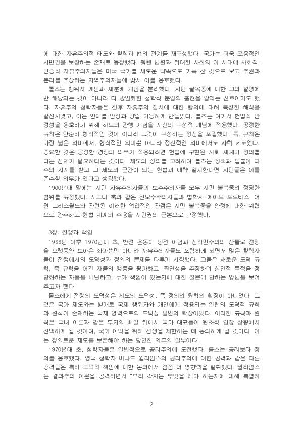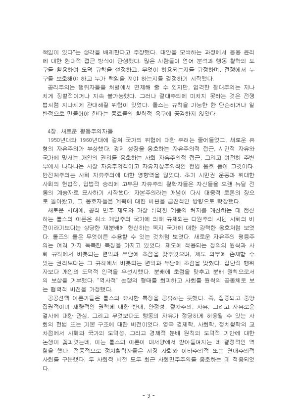 1Àå. Á¤ÀÇÀÇ Çü¼º ·Ñ½ºÀÇ <Á¤ÀÇ·Ð>Àº 600ÆäÀÌÁö¿¡ ´ÞÇÏ´Â ¼¼ °³ÀÇ ÀåÀ¸·Î ±¸¼ºµÇ¾ú´Ù. ·Ñ½º´Â "°øÁ¤À¸·Î¼ÀÇ Á¤ÀÇ"¶ó°í ºÎ¸£´Â °³³ä¿¡ ÀÇÇØ ±ÔÁ¦µÇ´Â Á¤ÀÇ·Ó°í "Áú¼ ÀÖ´Â »çȸ"¿¡ ´ëÇÑ ÀÚ½ÅÀÇ ºñÀüÀ» Á¦½ÃÇß´Ù. ·Ñ½º´Â »çȸÀÇ Á¤ÀǸ¦ ÆÇ´ÜÇÏ´Â ±âÁØÀ¸·Î µÎ °¡Áö Á¤ÀÇ ¿øÄ¢À» ¼±ÅÃÇØ¾ß ÇÑ´Ù°í ¸»Çß´Ù. ù ¹øÂ°´Â ½Ã¹ÎÀÇ ±âº»Àû ±Ç¸®¿Í ÀÚÀ¯¸¦ È®ÁõÇÏ´Â ÀÚÀ¯ÀÇ ¿øÄ¢À̾ú´Ù. µÎ ¹øÂ°´Â ÆòµîÀÇ ¿øÄ¢À̾ú´Ù. ¿©±â¿¡´Â »çȸÀû, °æÁ¦Àû ºÒÆòµîÀ» »çȸÀÇ ÃÖ¼Ò¼öÇýÀÚ¿¡°Ô À¯¸®Çϵµ·Ï Á¶Á¤Çϰí, "°øÁ¤ÇÑ ±âȸ ±Õµî"À̶ó´Â Á¶°Ç ÇÏ¿¡¼ ¸ðµç »ç¶÷¿¡°Ô Á÷À§¿Í ÁöÀ§°¡ °³¹æµÇ¾î¾ß ÇÑ´Ù°í ±ÔÁ¤ÇÏ´Â "Â÷µîÀÇ ¿øÄ¢"ÀÌ Æ÷ÇԵǾú´Ù. ·Ñ½º ÀÚ½ÅÀÇ À̷аú ¹æÇâÀ» Çü¼ºÇÏ°í ±×ÀÇ »ç»óÀÌ ¾î¶² Á¤Ä¡Àû ÀÛ¾÷À» ÇÒ ¼ö ÀÖ´ÂÁö º¸¿©ÁØ °ÍÀº ³ÃÀü ½Ã´ë ¹Ì±¹¸¸ÅÀ̳ª »çȸ¹ÎÁÖÁÖÀÇ ¿µ±¹À̾ú´Ù. ÀüÈÄ ¹Ì±¹ÀÇ ÀÚÀ¯ÁÖÀÇ´Â ÀÌÁßÀûÀÎ ¼º°ÝÀ» Áö³æ´Ù. ´ë°øÈ² ÀÌÈÄ, »çȸ¡¤°æÁ¦ »ýȰ¿¡ ´ëÇÑ ±¹°¡ ÅëÁ¦¿Í °³ÀÔÀÇ Çʿ伺ÀÌ ³Î¸® ¹Þ¾Æµé¿©Á³´Ù. Á¦2Â÷ ¼¼°è ´ëÀüÀ¸·Î Çü¼ºµÈ Àü½Ã ±¹°¡´Â ¸¹Àº ½Ã¹Îµé¿¡°Ô Á¤ºÎ¸¦ ±× ¾î´À ¶§º¸´Ù ´õ ÇÕ¹ýÀûÀÎ °ÍÀ¸·Î ¿©±â°Ô Çß´Ù. ·Ñ½º´Â ¹ÎÁÖÁÖÀÇ »çȸ»ýȰÀÇ Çٽɿ¡´Â "ÇÕÀÇ"°¡ ÀÖ´Ù°í ÁÖÀåÇß´Ù. öÇÐÀÇ ¸ñÇ¥´Â ±×·¯ÇÑ ÇÕÀÇ¿¡ È£¼ÒÇÒ "½Å·ÚÇÒ ¼ö ÀÖ´Â ¹æ¹ý", Áï º¯ÈÀÇ ¿©Áö¸¦ Çã¿ëÇÏ´Â ÆÇ´ÜÀÇ Á¤´çÇÑ ¿øÄ¢À» µµÃâÇÏ´Â "¹ß°ßÀû ÀåÄ¡"¸¦ ã´Â °ÍÀ̾ú´Ù. ·Ñ½º´Â "Á¦µµÀûÀ¸·Î Áö¿øµÇ´Â ¼±Àü ±â±¸¸¦ ÅëÇØ ¹ú¾îÁö´Â ¼ö¸¹Àº À̳ä ÀüÀï¿¡ Á÷¸éÇÏ¿© »ç¶÷µéÀº ÇÕ¸®ÀûÀÎ ¿øÄ¢ÀÇ È¿°ú»Ó¸¸ ¾Æ´Ï¶ó ±× Á¸Àç ÀÚüµµ ÀǽÉÇÏ°Ô µÉ °¡´É¼ºÀÌ ³ô´Ù"°í ½è´Ù. ÀÌ·¯ÇÑ ÀÏÀº À±¸® ¿øÄ¢À» ã´Â °ÍÀÌ ºÒ°¡´ÉÇÏ´Ù°í »ý°¢Çϰųª "±ÇÀ§ÁÖÀÇÀû" ¼ö´ÜÀ¸·Î °¿äµÇ´Â °ÍÀ» ¹Þ¾ÆµéÀÎ ¸¹Àº öÇÐÀڵ鿡°Ô ÀϾ´Ù. ·Ñ½º´Â ÀÌ·¯ÇÑ ÀÔÀå¿¡ Àû´ëÀûÀ̾ú°í, ÀÌ·¯ÇÑ ÀÔÀåÀÌ "Á÷°üÁÖÀÇ"¿Í °ø¸®ÁÖÀÇ¿¡ °øÅëÀûÀ̶ó°í º¸¾Ò´Ù. ·Ñ½º´Â ¹ÎÁÖÁÖÀÇ¿¡¼ ±¹°¡°¡ ¾Æ´Ï¶ó "¹ý"ÀÌ ±ÇÀ§ÀÇ ÁÖµÈ ¿øÃµÀ̶ó°í ÁÖÀåÇß´Ù. ±×´Â ±¹°¡¸¦ "»ó¿ø ÀÇ¿ø, ÇàÁ¤°¡, ÆÇ»ç, °æÂû µîÀÇ »ç¶÷µé·Î ±¸¼ºµÈ Áý´ÜÀÌ ÀÏÁ¾ÀÇ Çå¹ý ÇÏ¿¡¼ ¹ý¿¡ µû¶ó ƯÁ¤ ¾÷¹«¸¦ ¼öÇàÇÏ´Â °Í"À¸·Î ±ÞÁøÀûÀ¸·Î ÃÖ¼ÒÈÇÏ°í ¹èÁ¦ÁÖÀÇÀûÀ¸·Î ¼³¸íÇß´Ù. ³²¼º°ú ¹ýÀÌ ±¹°¡¿´°í, ±¹°¡´Â ´ÜÁö "¹ýÁ¤¿¡¼ ±×µéÀÇ ¹ýÀû °¡¸é"ÀÏ »ÓÀ̾ú´Ù. ¹ýÀº "°ø°³ Åä·Ð"À» ÅëÇØ "¿Ç°í ÇÕ¸®Àû"ÀÎ °ÍÀ¸·Î µå·¯³µ°í, "ÁöÀûÀÎ »ç¶÷µé·Î ±¸¼ºµÈ ½Ã¹Îµé"ÀÌ "ÀÚ¹ßÀûÀ¸·Î µ¿ÀÇ"ÇÏ¿© ±¸¼Ó·ÂÀ» °®´Â ±ÔÄ¢À¸·Î ¿©°ÜÁ³´Ù. ·Ñ½º´Â ÇÕ¸®ÀûÀÎ Åä·ÐÀÌ "ÇÕ¸®ÀûÀÎ ¹ýÀÇ Çʼö ÀüÁ¦ Á¶°Ç"À̶ó°í ½è´Ù. ÀÌ·¯ÇÑ Ãß·Ð °úÁ¤Àº ¹ÎÁÖÀû ½Çõ»Ó¸¸ ¾Æ´Ï¶ó À̷п¡µµ Áß¿äÇß´Ù 2Àå. Àǹ«µé ½Ã¹Î ºÒº¹Á¾Àº Á¤Ä¡Àû Çൿ°ú ½Ã¹ÎÀÇ Àǹ«¿¡ ´ëÇÑ Ã¶ÇÐÀû ³íÀÇÀÇ Æ²ÀÌ µÈ "°øÀûÀÎ ¹®Á¦"¿´´Ù. ½Ã¹Î ºÒº¹Á¾ÀÇ Á¤ÀÇ¿Í Á¤´çÈ¿¡ ´ëÇÑ ³íÀï¿¡¼ ÀÌ Ã¶ÇÐÀÚµéÀº ±¹°¡¿¡ ´ëÇÑ ÀÚÀ¯ÁÖÀÇÀû ŵµ¿Í öÇаú ¹ýÀÇ °ü°è¸¦ À籸¼ºÇß´Ù. ±¹°¡´Â ´õ¿í Æ÷¿ëÀûÀÎ ½Ã¹Î±ÇÀ» º¸ÀåÇÏ´Â Á¸Àç·Î µîÀåÇß´Ù. ¿ö·» ¹ý¿ø°ú À§´ëÇÑ »çȸÀÇ ÀÌ ½Ã´ë¿¡ »çȸÀû, ÀÎÁ¾Àû ÀÚÀ¯ÁÖÀÇÀÚµéÀº ¹Ì±¹ ±¹°¡¸¦ »õ·Î¿î ¾à¼ÓÀ¸·Î °¡µæ Âù °ÍÀ¸·Î º¸°í Áֱǰú ºÐ¸®¸¦ ÁÖÀåÇÏ´Â Áö¿ªÁÖÀÇÀڵ鿡 ¸Â¼ À̸¦ ¿ËÈ£Çß´Ù. ·ÑÁî´Â ÇàÀ§ÀÚ °³³ä°ú ÀçºÐ¹è °³³äÀ» ºÐ¸®Çß´Ù. ½Ã¹Î ºÒº¹Á¾¿¡ ´ëÇÑ ±×ÀÇ ¼³¸í¿¡¸¸ ÇØ´çµÇ´Â °ÍÀÌ ¾Æ´Ï¶ó ´õ ±¤¹üÀ§ÇÑ Ã¶ÇÐÀû ºÐ¾÷ÀÇ ÃâÇöÀ» ¾Ë¸®´Â ½ÅÈ£À̱⵵ Çß´Ù. ÀÚÀ¯ÁÖÀÇ Ã¶ÇÐÀÚµéÀº ÀüÈÄ ÀÚÀ¯ÁÖÀÇ Áú¼¿¡ ´ëÇÑ Ç×ÀÇ¿¡ ´ëÇØ ƯÁ¤ÇÑ ÇØ¼®À» ¹ßÀü½ÃÄ×°í, ÀÌ´Â ¹Ý´ë¸¦ ¾ÈÁ¤°ú ¾ç¸³ °¡´ÉÇÏ°Ô ¸¸µé¾ú´Ù. ·ÑÁî´Â ¿©±â¼ Çå¹ýÀû ¾ÈÁ¤¼ºÀ» ¿ËÈ£Çϱâ À§ÇØ ÇÏÆ®ÀÇ °üÇà °³³äÀ» ÀÚ½ÅÀÇ ±¸¼ºÀû °³³ä¿¡ Àû¿ëÇß´Ù. °øÁ¤ÇÑ ±ÔÄ¢Àº ´Ü¼øÈ÷ Çü½ÄÀûÀÎ °ÍÀÌ ¾Æ´Ï¶ó ±×°ÍÀÌ ±¸¼ºÇÏ´Â Á¤½ÅÀ» Æ÷°ýÇß´Ù. Áï, ±ÔÄ¢Àº °¡Àå ³ÐÀº Àǹ̿¡¼, Çü½ÄÀûÀÎ ÀÇ¹Ì»Ó ¾Æ´Ï¶ó Á¤½ÅÀûÀÎ Àǹ̿¡¼µµ »çȸ Á¦µµ¿´´Ù. Áß¿äÇÑ °ÍÀº °øÁ¤ÇÑ °æÀïÀÇ Àǹ«°¡ Àû¿ëµÇ·Á¸é Çå¹ý¿¡ ±¸ÇöµÈ »çȸ ü°è°¡ Á¤ÀÇ·Ó´Ù´Â ÀüÁ¦°¡ ÇÊ¿äÇÏ´Ù´Â °ÍÀÌ´Ù. Á¦µµÀÇ Á¤ÀǸ¦ °í·ÁÇÏ¿© ·ÑÁî´Â Á¤Ã¥°ú ¹ý·üÀÌ ´Ù¼öÀÇ ÁöÁö¸¦ ¹Þ°í ±× Á¦µµÀÇ ±Ù°£ÀÌ µÇ´Â Çå¹ý°ú ´ë·« ÀÏÄ¡ÇÑ´Ù¸é ½Ã¹ÎµéÀº À̸¦ ÁؼöÇÒ 