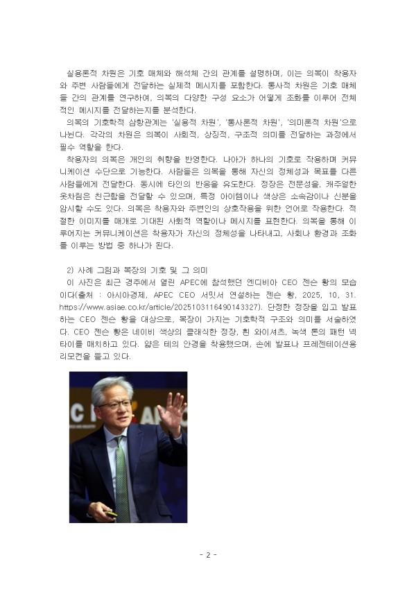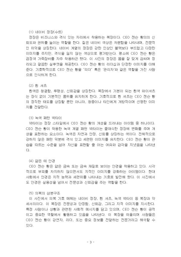 ±³ÀçÀÇ 1Àå 1.2 ±âȣü°è¸¦ Âü°íÇÏ¿© º¹ÀåÀÌ ±âÈ£·Î »ç¿ëµÈ »ç·Ê ÇÑ °³¸¦ ¼±Á¤ÇÑ´Ù. ¼±Á¤ ÈÄ »ç·Ê ±×¸²°ú ÇÔ²² º¹ÀåÀÇ ±âÈ£ ¹× ±× Àǹ̿¡ ´ëÇØ¼ ¼³¸íÇÑ´Ù. 1) ±âȣü°è °³ÀÎÀÇ º¹ÀåÀº ÀÔ´Â ¿ÊÀ» ³Ñ¾î, ´ëÀΰü°è¿Í »çȸ Ȱµ¿¿¡¼ ½Åȣü°è·Î ÀÛ¿ëÇÏ´Â Ä¿¹Â´ÏÄÉÀÌ¼Ç ¼ö´ÜÀÌ µÈ´Ù. ÀǺ¹Àº ±âÈ£¶ó´Â °³³ä ¾Æ·¡, ƯÁ¤ »çȸ¿Í ¹®È ¼Ó¿¡¼ ƯÁ¤ Àǹ̸¦ °®´Â´Ù. ÀÇ»ç¼ÒÅëÀ» À¯µµÇϰí ÇüÅÂÈÇÏ´Â ¸Å°³·Î »ç¿ëµÈ´Ù. º¹ÀåÀÌ ´Ü¼øÇÑ ÆÐ¼Ç ÀÌ»óÀÇ ¿ªÇÒÀ» Çϸç, »çȸÀûÀÎ »óÈ£ÀÛ¿ë¿¡¼ Áß¿ä ¿ªÇÒÀ» ´ã´çÇÑ´Ù. ±âÈ£Çп¡¼ ÄÚµå¶õ Ä¿¹Â´ÏÄÉÀ̼ÇÀ» À§ÇØ ¸Þ½ÃÁö¸¦ ±¸¼ºÇϰí ÇØ¼®ÇÏ´Â °úÁ¤°ú °¡´ÉÄÉ ÇÏ´Â ±ÔÄ¢µéÀ» ÀǹÌÇÑ´Ù. Äڵ尡 ¾ø´Ù¸é ¼·Î ¼ÒÅëÇϸç Á¤º¸¸¦ ±³È¯Çϰųª ÀÌÇØÇÏÁö ¸øÇÒ °ÍÀÌ´Ù. ÄÚµåÀÇ ÀÛ¿ë ¹æ½ÄÀº ¸Þ½ÃÁö°¡ »ý¼ºµÇ°í ÇØ¼®µÇ´Â °úÁ¤À» Æ÷ÇÔÇÑ´Ù. À̸¦ ÅëÇØ È¿°úÀûÀ¸·Î ÀÇ»ç¼ÒÅëÀ» ÀÌ·é´Ù. ¸ðµå´Â ÀÌ ÄÚµåÀÇ ±¸Ã¼ÀûÀÎ ½ÇÇö ÇüÅÂÀÌ´Ù. ¸ðµå´Â 'À¯Çà'À¸·Î ¼³¸íµÉ ¼ö ÀÖ´Ù. À¯ÇàÀº ƯÁ¤ ½Ã°£ ¶Ç´Â ½Ã±â¿¡ ƯÁ¤ »çȸ ³»¿¡¼ ¹Þ¾Æµé¿©Áø ½ºÅ¸ÀÏÀ̳ª Ç¥Çö ¹æ½ÄÀ» ÁöĪÇÑ´Ù. À¯ÇàÀº ƯÁ¤ ½Ã´ë¿Í »çȸÀû ȯ°æ ¼Ó¿¡¼ »ç¶÷µéÀÌ »ç¿ëÇÏ¸ç ¼ö¿ëÇÏ´Â ÀǺ¹ ÄÚµåÀÇ ÃÖÀû ½ÇÇö ÇüŶó°í º¼ ¼ö ÀÖ´Ù. °ÑÀ¸·Î º¸ÀÌ´Â ¿ÊÂ÷¸²ÀÇ º¯È¸¦ ³Ñ¾î, »çȸ ±¸¼º¿øµéÀÇ ¹®ÈÀû Æ®·»µå¿Í ½Ã´ëÀû °¨°¢À» ¹Ý¿µÇÏ´Â Áß¿äÇÑ ÁöÇ¥°¡ µÈ´Ù. À¯ÇàÀÇ º¯È´Â ÇÑ »çȸÀÇ Áý´ÜÀû »ç°í¿Í °¡Ä¡°üÀÌ ½Ã°£ È帧¿¡ µû¶ó ¾î¶»°Ô ¹Ù²î´ÂÁö¸¦ º¸¿©ÁÖ´Â »ó¡Àû ±â´Éµµ ¼öÇàÇÑ´Ù. ±âÈ£Çп¡¼´Â ±âÈ£¸¦ ºÐ¼®Çϱâ À§ÇØ »ïºÐ±¸Á¶¸¦ äÅÃÇÑ´Ù. ÀǺ¹À» ±âÈ£·Î¼ ¹Ù¶óº¸´Â µ¥¿¡µµ µ¿ÀÏÇÏ°Ô Àû¿ëµÉ ¼ö ÀÖ´Ù. ù°, ±âÈ£Àû ¸Å°³¹° ('±âÈ£ ¸Åü')-±âÈ£ ¸Åü´Â ÀǺ¹ ÀÚü¸¦ °¡¸®Å²´Ù. Áï, »ç¶÷ÀÌ Âø¿ëÇÏ´Â ¿ÊÀ̳ª ¾ÆÀÌÅÛ ±× ÀÚü°¡ ±âÈ£Àû ¿ªÇÒÀ» ÇÑ´Ù. µÑ°, Áö½Ã ´ë»ó ('Áö½Ã ´ë»ó')-ÀǺ¹ÀÌ »ó¡ÀûÀ¸·Î Àü´ÞÇÏ´Â Àǹ̳ª ¸Þ½ÃÁöÀÌ´Ù. ¿¹ÄÁ´ë, Á¤ÀåÀ» ÀԴ´ٴ °ÍÀº °Ý½ÄÀ» Áß½ÃÇϰųª Áß¿äÇÑ ÀÚ¸®ÀÓÀ» ¾Ë¸®´Â ¸Þ½ÃÁö¸¦ Áö½Ã ´ë»óÀ¸·Î Á¤ÇÑ´Ù. ¼Â°, ±âÈ£ÀÇ ÇØ¼®Ã¼ ('±âÈ£ÀÇ ÇØ¼®Ã¼')-±âÈ£¸¦ ¹Þ¾ÆµéÀÌ´Â ÇØ¼®ÀÚÀÇ ¹ÝÀÀ ¶Ç´Â À̸¦ ÅëÇØ ¹ß»ýÇÏ´Â ÀǹÌÀû ÇØ¼®À» ¶æÇÑ´Ù. »ç¶÷µéÀº ƯÁ¤ ÀǺ¹À» º¸°í ÇØ¼®À» Çϸç, ±× Àǵµ°¡ ±àÁ¤ÀûÀ̰ųª ºÎÁ¤ÀûÀ¸·Î ¹Þ¾Æµé¿©Áú ¼ö ÀÖ´Ù. ÀÌ »ïºÐ±¸Á¶¸¦ ÅëÇØ ÀǺ¹±âÈ£°¡ °¡Áö´Â ±¸Á¶Àû ¿ä¼Ò¸¦ º¸´Ù ¸íÈ®È÷ ±¸ºÐÇÒ ¼ö ÀÖÀ¸¸ç, »çȸÀûÀÎ ±âÈ£·Î ÀÛ¿ëÇÏ´Â ÀǺ¹À» ÇØ¼®ÇÏ´Â µ¥ ¸Å¿ì À¯¿ëÇÏ´Ù. ÀÌ¿¡ ´õÇØ ±âÈ£ÇÐÀº »ïÇ×°ü°è¸¦ ÅëÇØ ÀǺ¹À» ´õ¿í ½ÉÃþÀûÀ¸·Î ºÐ¼®ÇÑ´Ù. Àǹ̷ÐÀû Â÷¿øÀº ±âÈ£ ¸Åü¿Í Áö½Ã ´ë»ó °£ÀÇ °ü°è¸¦ ´Ù·ç¸ç, ÀÌ´Â ÀǺ¹ÀÌ ´ã°í ÀÖ´Â »ó¡Àû Àǹ̳ª ¸ñÀû°ú °ü·ÃµÈ´Ù. ½Ç¿ë·ÐÀû Â÷¿øÀº ±âÈ£ ¸Åü¿Í ÇØ¼®Ã¼ °£ÀÇ °ü°è¸¦ ¼³¸íÇϸç, ÀÌ´Â ÀǺ¹ÀÌ Âø¿ëÀÚ¿Í ÁÖº¯ »ç¶÷µé¿¡°Ô Àü´ÞÇÏ´Â ½ÇÁ¦Àû ¸Þ½ÃÁö¸¦ Æ÷ÇÔÇÑ´Ù. Åë»çÀû Â÷¿øÀº ±âÈ£ ¸Åüµé °£ÀÇ °ü°è¸¦ ¿¬±¸ÇÏ¿©, ÀǺ¹ÀÇ ´Ù¾çÇÑ ±¸¼º ¿ä¼Ò°¡ ¾î¶»°Ô Á¶È¸¦ ÀÌ·ç¾î ÀüüÀûÀÎ ¸Þ½ÃÁö¸¦ Àü´ÞÇÏ´ÂÁö¸¦ ºÐ¼®ÇÑ´Ù. ÀǺ¹ÀÇ ±âÈ£ÇÐÀû »ïÇ×°ü°è´Â '½Ç¿ëÀû Â÷¿ø', 'Åë»ç·ÐÀû Â÷¿ø', 'Àǹ̷ÐÀû Â÷¿ø'À¸·Î ³ª´¶´Ù. °¢°¢ÀÇ Â÷¿øÀº ÀǺ¹ÀÌ »çȸÀû, »ó¡Àû, ±¸Á¶Àû Àǹ̸¦ Àü´ÞÇÏ´Â °úÁ¤¿¡¼ Çʼö ¿ªÇÒÀ» ÇÑ´Ù. Âø¿ëÀÚÀÇ ÀǺ¹Àº °³ÀÎÀÇ ÃëÇâÀ» ¹Ý¿µÇÑ´Ù. ³ª¾Æ°¡ ÇϳªÀÇ ±âÈ£·Î ÀÛ¿ëÇϸç Ä¿¹Â´ÏÄÉÀÌ¼Ç ¼ö´ÜÀ¸·Î ±â´ÉÇÑ´Ù. »ç¶÷µéÀº ÀǺ¹À» ÅëÇØ ÀÚ½ÅÀÇ Á¤Ã¼¼º°ú ¸ñÇ¥¸¦ ´Ù¸¥ »ç¶÷µé¿¡°Ô Àü´ÞÇÑ´Ù. µ¿½Ã¿¡ ŸÀÎÀÇ ¹ÝÀÀÀ» À¯µµÇÑ´Ù. Á¤ÀåÀº Àü¹®¼ºÀ», ijÁÖ¾óÇÑ ¿ÊÂ÷¸²Àº Ä£±ÙÇÔÀ» Àü´ÞÇÒ ¼ö ÀÖÀ¸¸ç, ƯÁ¤ ¾ÆÀÌÅÛÀ̳ª »ö»óÀº ¼Ò¼Ó°¨À̳ª ½ÅºÐÀ» ¾Ï½ÃÇÒ ¼öµµ ÀÖ´Ù. ÀǺ¹Àº Âø¿ëÀÚ¿Í ÁÖº¯ÀÎÀÇ »óÈ£ÀÛ¿ëÀ» À§ÇÑ ¾ð¾î·Î ÀÛ¿ëÇÑ´Ù. ÀûÀýÇÑ À̹ÌÁö¸¦ ¸Å°³·Î ±â´ëµÈ »çȸÀû ¿ªÇÒÀ̳ª ¸Þ½ÃÁö¸¦ Ç¥ÇöÇÑ´Ù. ÀǺ¹À» ÅëÇØ ÀÌ·ç¾îÁö´Â Ä¿¹Â´ÏÄÉÀ̼ÇÀº Âø¿ëÀÚ°¡ ÀÚ½ÅÀÇ Á¤Ã¼¼ºÀ» ³ªÅ¸³»°í, »çȸ³ª ȯ°æ°ú Á¶È¸¦ ÀÌ·ç´Â ¹æ¹ý Áß Çϳª°¡ µÈ´Ù. 2) »ç·Ê ±×¸²°ú º¹ÀåÀÇ ±âÈ£ ¹× ±× ÀÇ¹Ì ÀÌ »çÁøÀº ÃÖ±Ù °æÁÖ¿¡¼ ¿¸° APEC¿¡ Âü¼®Çß´ø ¿£µðºñ¾Æ CEO Á¨½¼ ȲÀÇ ¸ð½ÀÀÌ´Ù(Ãâó : ¾Æ½Ã¾Æ°æÁ¦, APEC CEO ¼¹Ô¼ ¿¬¼³ÇÏ´Â Á¨½¼ Ȳ, 2025, 10, 31. https://www.asiae.co.kr/article/2025103116490143327). ´ÜÁ¤ÇÑ Á¤ÀåÀ» ÀÔ°í ¹ßÇ¥ÇÏ´Â CEO Á¨½¼ ȲÀ» ´