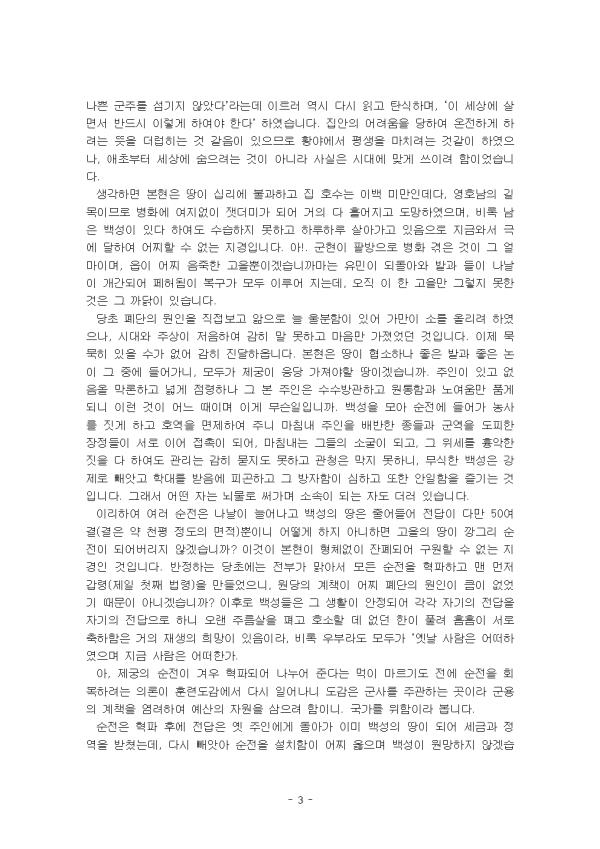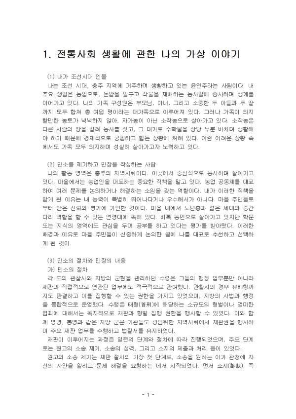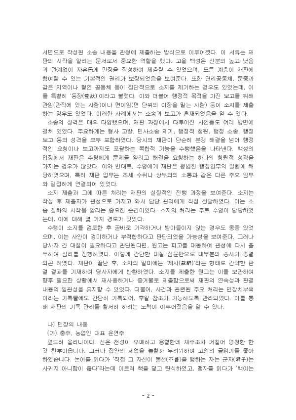 (1) ³»°¡ Á¶¼±½Ã´ë Àι° ³ª´Â Á¶¼± ½Ã´ë, ÃæÁÖ Áö¿ª¿¡ °ÅÁÖÇÏ¸ç »ýȰÇϰí ÀÖ´Â À±¿¬ÁÖ¶ó´Â »ç¶÷ÀÌ´Ù. ³» ÁÖ¿ä »ý¾÷Àº ³ó¾÷À¸·Î, ³í¹çÀ» Àϱ¸°í ÀÛ¹°À» Àç¹èÇÏ´Â ³ó»çÀÏ¿¡ Á¾»çÇÏ¸ç »ý°è¸¦ À̾°í ÀÖ´Ù. ³ªÀÇ °¡Á· ±¸¼º¿øÀº ºÎ¸ð´Ô, ¾Æ³», ±×¸®°í ¼ÒÁßÇÑ µÎ ¾Æµé°ú µÎ µþ±îÁö ¸ðµÎ ÇÕÃÄ ÃÑ ¿©´ü ¸íÀ̶ó´Â ´ë°¡Á·À¸·Î ÀÌ·ç¾îÁ® ÀÖ´Ù. ±×·¯³ª °¡Á·ÀÌ ÀÇÁöÇÒ¸¸ÇÑ ³óÅä°¡ ³Ë³ËÇÏÁö ¾Ê¾Æ, ÀÚ°¡³óÀÌ ¾Æ´Ñ ¼ÒÀÛ³óÀ¸·Î »ì¾Æ°¡°í ÀÖ´Ù. ¼ÒÀÛ³óÀº ´Ù¸¥ »ç¶÷ÀÇ ¶¥À» ºô·Á ³ó»ç¸¦ Áþ°í, ±× ´ë°¡·Î ¼öÈ®¹°À» »ó´ç ºÎºÐ ¹ÙÄ¡¸ç »ýÈ°ÇØ¾ß Çϱ⠶§¹®¿¡ °æÁ¦ÀûÀ¸·Î ±ÃÇÌÇϰí Èûµç »óȲ¿¡ Ã³ÇØ ÀÖ´Ù. ÀÌ·± ¾î·Á¿î »óȲ ¼Ó¿¡¼µµ °¡Á· ¸ðµÎ ÀÇÁöÇÏ¸ç ¼º½ÇÈ÷ »ì¾Æ°¡°íÀÚ ³ë·ÂÇϰí ÀÖ´Ù. (2) ¹Î¼Ò¸¦ Á¦±âÇÏ°í ¹ÎÀåÀ» ÀÛ¼ºÇÏ´Â »ç¶÷ ³ªÀÇ È°µ¿ ¿µ¿ªÀº ÃæÁÖÀÇ Áö¿ª»çȸÀÌ´Ù. À̰÷¿¡¼ Áß½ÉÀûÀ¸·Î ³ó»çÇÏ¸ç »ì¾Æ°¡°í ÀÖ´Ù. ¸¶À»¿¡¼´Â ³ó¾÷ÀÎÀ» ´ëÇ¥ÇÏ´Â Áß¿äÇÑ Á÷Ã¥À» ¸Ã°í ÀÖ´Ù. ³ó¾÷ °øµ¿Ã¼¸¦ ´ëÇ¥ÇÏ¿© ¿©·¯ ¹®Á¦¸¦ ³íÀÇÇϰųª ÇØ°áÇÏ´Â ¼ÒÀÓÀ» °®´Â ¿ªÇÒÀÌ´Ù. ³»°¡ ÀÌ·¯ÇÑ Á÷Ã¥À» ¸Ã°Ô µÈ ÀÌÀ¯´Â ³» ´É·ÂÀÌ Æ¯º°È÷ ¶Ù¾î³ª´Ù°Å³ª ¿ì¼öÇØ¼°¡ ¾Æ´Ï´Ù. ¸¶À» Áֹεé·ÎºÎÅÍ ¹ÞÀº ½Å·Ú¿Í Æò°¡¿¡ ±âÀÎÇÑ °ÍÀÌ´Ù. ¸¶À» ³»¿¡¼ ³ë³âÃþ°ú ÀþÀº ¼¼´ëÀÇ Áß°£´Ù¸® ¿ªÇÒÀ» ÇÒ ¼ö ÀÖ´Â ¿¬·É´ë¿¡ ¼ÓÇØ ÀÖ´Ù. ºñ·Ï ³ó¹ÎÀ¸·Î »ì¾Æ°¡°í ÀÖÁö¸¸ Çй® ¶Ç´Â Áö½ÄÀÇ ¿µ¿ª¿¡µµ °ü½ÉÀ» µÎ¸ç °øºÎ¸¦ Çϰí ÀÖ´Ù´Â Æò°¡¸¦ ¹Þ¾Æ¿Ô´Ù. ÀÌ·¯ÇÑ ¹è°æ°ú ÀÌÀ¯·Î ¸¶À» ÁֹεéÀÌ ½ÅÁßÇÏ°Ô ³íÀÇÇÑ ³¡¿¡ ³ª¸¦ ´ëÇ¥·Î ÃßõÇÏ°í ¼±ÅÃÇÏ°Ô µÈ °ÍÀÌ. (3) ¹Î¼ÒÀÇ ÀýÂ÷¿Í ¹ÎÀåÀÇ ³»¿ë °¡) ¹Î¼ÒÀÇ ÀýÂ÷ °¢ µµÀÇ °üÂû»ç¿Í Áö¹æÀÇ ±ºÇöÀ» °ü¸®ÇÏ´ø ¼ö·ÉÀº ±×µéÀÇ ÇàÁ¤ ¾÷¹«»Ó¸¸ ¾Æ´Ï¶ó ÀçÆÇ°ú Á÷Á¢ÀûÀ¸·Î ¿¬°üµÈ ¾÷¹«¿¡µµ Àû±ØÀûÀ¸·Î °ü¿©Çß´Ù. °üÂû»çÀÇ °æ¿ì À¯¹èÇü±îÁöµµ ÆÇ°áÇϰí À̸¦ ÁýÇàÇÒ ¼ö ÀÖ´Â ±ÇÇÑÀ» °¡Áö°í ÀÖ¾úÀ¸¸ç, Áö¹æÀÇ »ç¹ý°ú ÇàÁ¤À» ÅëÇÕÀûÀ¸·Î ¿î¿µÇß´Ù. ¼ö·ÉÀº ÅÂÇü(÷Âúý)¿¡ ÇØ´çÇÏ´Â ¼Ò±Ô¸ðÀÇ Çü¹úÀ̳ª °æ¹ÌÇÑ ¹üÁË¿¡ ´ëÇØ¼´Â µ¶ÀÚÀûÀ¸·Î ÀçÆÇ°ú Çü¹ú ÁýÇà ±ÇÇÑÀ» Çà»çÇÒ ¼ö ÀÖ¾ú´Ù. ÀÌ¿Í ÇÔ²² º´¿µ, Å뿵°ú °°Àº Áö¹æ ±º¹® ±â°üµéµµ ±¤¹üÀ§ÇÑ Áö¿ª»çȸ¿¡¼ ÀçÆÇ±ÇÀ» Çà»çÇϸç ÁÖ¿ä ÀçÆÇ ¾÷¹«¸¦ ¼öÇàÇÏ°í ¹ýÁú¼¸¦ À¯ÁöÇÏ¿´´Ù. ÀçÆÇÀÌ ÀÌ·ç¾îÁö´Â °úÁ¤Àº ÀÏ·ÃÀÇ ´Ü°è¿Í ÀýÂ÷¿¡ µû¶ó ÁøÇàµÇ¾úÀ¸¸ç, ÁÖ¿ä ´Ü°è·Î´Â ¿ø°íÀÇ ¼Ò¼Û Á¦±â, ¼Ò¼ÛÀÇ ¼º°Ý, ±×¸®°í ¼ÒÁöÀÇ Á¦Ãâ°ú ó¸® µîÀÌ ÀÖ¾ú´Ù. ¿ø°íÀÇ ¼Ò¼Û Á¦±â´Â ÀçÆÇ ÀýÂ÷ÀÇ °¡Àå ù ´Ü°è·Î, ¼Ò¼ÛÀ» ¿øÇÏ´Â À̰¡ °üû¿¡ ÀÚ½ÅÀÇ »ç¾ÈÀ» ¾Ë¸®°í ¹®Á¦ ÇØ°áÀ» ¿äûÇÏ´Â µ¥¼ ½ÃÀ۵Ǿú´Ù. ¸ÕÀú ¼ÒÁö(áÍíî), Áï ¼¸éÀ¸·Î ÀÛ¼ºµÈ ¼Ò¼Û ³»¿ëÀ» °üû¿¡ Á¦ÃâÇÏ´Â ¹æ½ÄÀ¸·Î ÀÌ·ç¾îÁ³´Ù. ÀÌ ¼·ù´Â ÀçÆÇÀÇ ½ÃÀÛÀ» ¾Ë¸®´Â ¹®¼·Î¼ Áß¿äÇÑ ¿ªÇÒÀ» Çß´Ù. °íÀ» ¹é¼ºÀº ½ÅºÐÀÇ ³ô°í ³·À½°ú °ü°è¾øÀÌ ÀÚÀ¯·Ó°Ô ¹ÎÀåÀ» ÀÛ¼ºÇÏ¿© Á¦ÃâÇÒ ¼ö ÀÖ¾úÀ¸¸ç, ¸ðµç °èÃþÀÌ ÀçÆÇ¿¡ Âü¿©ÇÒ ¼ö ÀÖ´Â ±âº»ÀûÀÎ ±Ç¸®°¡ º¸ÀåµÇ¾úÀ½À» º¸¿©ÁØ´Ù. ¶ÇÇÑ ¸é¸®°øµ¿Ã¼, ¹®Áß°ú °°Àº Áö¿ªÀ̳ª Ç÷¿¬ °øµ¿Ã¼ µîÀÌ Áý´ÜÀûÀ¸·Î ¼ÒÁö¸¦ Á¦±âÇÏ´Â °æ¿ìµµ ÀÖ¾ú´Âµ¥, À̸¦ Ưº°È÷ 'µîÀå(Ôôíî)'À̶ó°í ºÒ·¶´Ù. ÀÌ¿Í ´õºÒ¾î ÇàÁ¤Àû ¸ñÀûÀ» °¡Áø º¸°í¸¦ À§ÇØ °üÀÓ(°üÁ÷¿¡ ÀÖ´Â »ç¶÷)À̳ª ¸éÀÌÀÓ(¸é ´ÜÀ§ÀÇ ÀÌÀåÀ» ¸Ã´Â »ç¶÷) µîÀÌ ¼ÒÁö¸¦ Á¦ÃâÇÏ´Â °æ¿ìµµ ÀÖ¾ú´Ù. ÀÌ·¯ÇÑ »ç·Ê¿¡¼´Â ¼Ò¼Û°ú º¸°í°¡ È¥ÀçµÇ¾úÀ½À» ¾Ë ¼ö ÀÖ´Ù. ¼Ò¼ÛÀÇ ¼º°ÝÀº ¸Å¿ì ´Ù¾çÇßÀ¸¸ç, ÀçÆÇ °úÁ¤¿¡¼ ´Ù·ç¾îÁø »ç¾Èµéµµ ¿©·¯ ¹æ¸é¿¡ °ÉÃÄ ÀÖ¾ú´Ù. ÁÖ¿äÇϰԴ Çü»ç °í¹ß, ¹Î»ç¼Ò¼Û Á¦±â, ÇàÁ¤Àû û¿ø, ÇàÁ¤ ¼Ò¼Û, ÇàÁ¤ º¸°í µîÀÇ ¼º°ÝÀ» ¸ðµÎ Æ÷ÇÔÇÏ¿´´Ù. ´ç½ÃÀÇ ÀçÆÇÀÌ ´Ü¼øÈ÷ ºÐÀï ÇØ°áÀ» ³Ñ¾î ÇàÁ¤ÀûÀÎ ¿äûÀ̳ª º¸°í±îÁöµµ Æ÷°ýÇÏ´Â º¹ÇÕÀû ±â´ÉÀ» ¼öÇàÇßÀ½À» ³ªÅ¸³½´Ù. ¹é¼ºÀÇ ÀÔÀå¿¡¼ ÀçÆÇÀº ¼ö·É¿¡°Ô ¹®Á¦¸¦ ¾Ë¸®°í ÇØ°áÀ» ¿äûÇÏ´Â ÇϳªÀÇ Ã»¿øÀû ¼º°ÝÀ» °¡Áö´Â °æ¿ì°¡ ¸¹¾Ò´Ù. ÀÌ¿Í ¹Ý´ë·Î, ¼ö·É¿¡°Ô ÀçÆÇÀº Æò¹üÇÑ ÇàÁ¤¾÷¹«ÀÇ ÀÏȯ¿¡ ÇØ´çÇÏ¿´À¸¸ç, ƯÈ÷ ÀçÆÇ ¾÷¹«´Â Á¶¼¼ ¼öÃ볪 »óºÎ¿ÍÀÇ ¼ÒÅë°ú °°Àº ´Ù¸¥ ÁÖ¿ä ÀÓ¹«¿Í ¹ÐÁ¢ÇÏ°Ô ¿¬°áµÇ¾î ÀÖ¾ú´Ù. ¼ÒÁö Á¦Ãâ°ú ±×¿