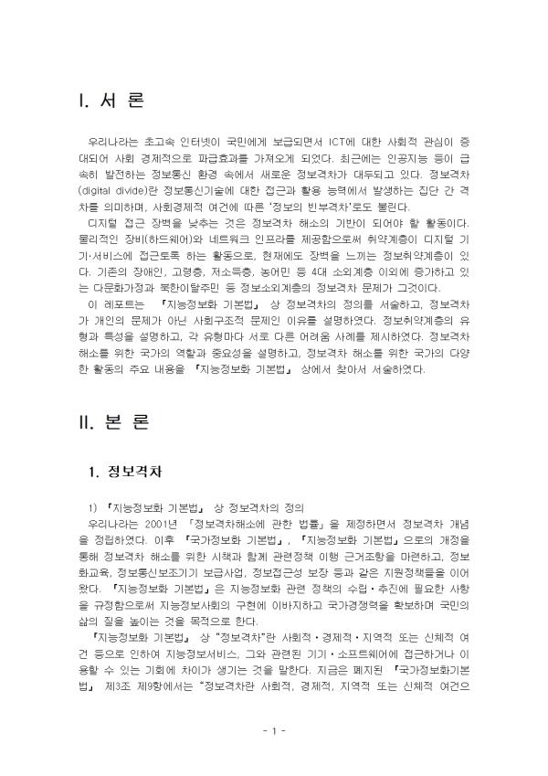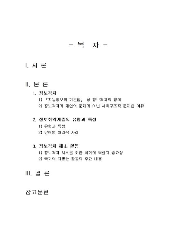 2. Á¤º¸Ãë¾à°èÃþÀÇ À¯Çü°ú ±× Ư¼ºÀ» °¢°¢ ¼³¸íÇϰí, °¢ À¯Çü¸¶´Ù ¼·Î ´Ù¸¥ ±¸Ã¼Àû ¾î·Á¿ò »ç·Ê¸¦ 1°³ ÀÌ»ó¾¿ Á¦½ÃÇϽÿÀ 3. Á¤º¸°ÝÂ÷ ÇØ¼Ò¸¦ À§ÇÑ ±¹°¡ÀÇ ¿ªÇÒ°ú Á߿伺À» ¼³¸íÇϰí, Á¤º¸°ÝÂ÷ ÇØ¼Ò¸¦ À§ÇÑ ±¹°¡ÀÇ ´Ù¾çÇÑ È°µ¿ÀÇ ÁÖ¿ä ³»¿ëÀ» ¡¸Áö´ÉÁ¤º¸È ±âº»¹ý¡¹»ó¿¡¼ ã¾Æ¼ ¼¼úÇϽÿÀ.(¡¸Áö´ÉÁ¤º¸È ±âº»¹ý¡¹»óÀÇ ³»¿ëÀ» ±¸Ã¼ÈÇϰųª °ü·Ã Á¦µµ¸¦ Á÷Á¢ ±ÔÀ²ÇÏ´Â ´Ù¸¥ ¹ý·É±îÁö ÇÔ²² Á¦½ÃÇÒ °Í.) - ¸ñ Â÷ - I. ¼ ·Ð II. º» ·Ð 1. Á¤º¸°ÝÂ÷ 1) ¡ºÁö´ÉÁ¤º¸È ±âº»¹ý¡» »ó Á¤º¸°ÝÂ÷ÀÇ Á¤ÀÇ 2) Á¤º¸°ÝÂ÷°¡ °³ÀÎÀÇ ¹®Á¦°¡ ¾Æ´Ñ »çȸ±¸Á¶Àû ¹®Á¦ÀÎ ÀÌÀ¯ 2. Á¤º¸Ãë¾à°èÃþÀÇ À¯Çü°ú Ư¼º 1) À¯Çü°ú Ư¼º 2) À¯Çüº° ¾î·Á¿ò »ç·Ê 3. Á¤º¸°ÝÂ÷ ÇØ¼Ò Ȱµ¿ 1) Á¤º¸°ÝÂ÷ ÇØ¼Ò¸¦ À§ÇÑ ±¹°¡ÀÇ ¿ªÇÒ°ú Á߿伺 2) ±¹°¡ÀÇ ´Ù¾çÇÑ È°µ¿ÀÇ ÁÖ¿ä ³»¿ë III. °á ·Ð Âü°í¹®Çå ** ÇÔ²² Á¦°øµÇ´Â Âü°íÀÚ·á ÇÑ±ÛÆÄÀÏ ** 1. ¡ºÁö´ÉÁ¤º¸È ±âº»¹ý¡»»ó Á¤º¸°ÝÂ÷ÀÇ Á¤ÀÇ.hwp 2. ¡ºÁö´ÉÁ¤º¸È ±âº»¹ý¡»»ó Á¤º¸°ÝÂ÷ÀÇ Á¤ÀÇ2.hwp 3. ±¹°¡ÀÇ ´Ù¾çÇÑ È°µ¿ÀÇ ÁÖ¿ä ³»¿ë.hwp 4. ±¹°¡ÀÇ ´Ù¾çÇÑ È°µ¿ÀÇ ÁÖ¿ä ³»¿ë2.hwp 5. À¯Çüº° ¾î·Á¿ò »ç·Ê.hwp 6. À¯Çüº° ¾î·Á¿ò »ç·Ê2.hwp 7. Á¤º¸°ÝÂ÷ ÇØ¼Ò¸¦ À§ÇÑ ±¹°¡ÀÇ ¿ªÇÒ°ú Á߿伺.hwp 8. Á¤º¸°ÝÂ÷ ÇØ¼Ò¸¦ À§ÇÑ ±¹°¡ÀÇ ¿ªÇÒ°ú Á߿伺2.hwp 9. Á¤º¸°ÝÂ÷°¡ °³ÀÎÀÇ ¹®Á¦°¡ ¾Æ´Ñ »çȸ±¸Á¶Àû ¹®Á¦ÀÎ ÀÌÀ¯.hwp 10. Á¤º¸°ÝÂ÷°¡ °³ÀÎÀÇ ¹®Á¦°¡ ¾Æ´Ñ »çȸ±¸Á¶Àû ¹®Á¦ÀÎ ÀÌÀ¯2.hwp 11. Á¤º¸Ãë¾à°èÃþÀÇ À¯Çü°ú Ư¼º.hwp 12. Á¤º¸Ãë¾à°èÃþÀÇ À¯Çü°ú Ư¼º2.hwp ¢ºÀÚ·á³»¿ë ¹Ì¸®º¸±â