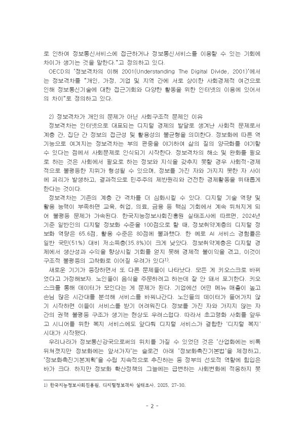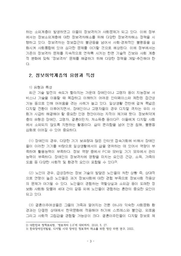 ¿ì¸®³ª¶ó´Â Ãʰí¼Ó ÀÎÅͳÝÀÌ ±¹¹Î¿¡°Ô º¸±ÞµÇ¸é¼ ICT¿¡ ´ëÇÑ »çȸÀû °ü½ÉÀÌ Áõ´ëµÇ¾î »çȸ °æÁ¦ÀûÀ¸·Î ÆÄ±ÞÈ¿°ú¸¦ °¡Á®¿À°Ô µÇ¾ú´Ù. ÃÖ±Ù¿¡´Â ÀΰøÁö´É µîÀÌ ±Þ¼ÓÈ÷ ¹ßÀüÇÏ´Â Á¤º¸Åë½Å ȯ°æ ¼Ó¿¡¼ »õ·Î¿î Á¤º¸°ÝÂ÷°¡ ´ëµÎµÇ°í ÀÖ´Ù. Á¤º¸°ÝÂ÷(digital divide)¶õ Á¤º¸Åë½Å±â¼ú¿¡ ´ëÇÑ Á¢±Ù°ú Ȱ¿ë ´É·Â¿¡¼ ¹ß»ýÇÏ´Â Áý´Ü °£ °ÝÂ÷¸¦ ÀǹÌÇϸç, »çȸ°æÁ¦Àû ¿©°Ç¿¡ µû¸¥ ¡®Á¤º¸ÀÇ ºóºÎ°ÝÂ÷¡¯·Îµµ ºÒ¸°´Ù. µðÁöÅÐ Á¢±Ù À庮À» ³·Ãß´Â °ÍÀº Á¤º¸°ÝÂ÷ ÇØ¼ÒÀÇ ±â¹ÝÀÌ µÇ¾î¾ß ÇÒ È°µ¿ÀÌ´Ù. ¹°¸®ÀûÀÎ Àåºñ(Çϵå¿þ¾î)¿Í ³×Æ®¿öÅ© ÀÎÇÁ¶ó¸¦ Á¦°øÇÔÀ¸·Î½á Ãë¾à°èÃþÀÌ µðÁöÅÐ ±â±â¡¤¼ºñ½º¿¡ Á¢±ÙÅä·Ï Çϴ Ȱµ¿À¸·Î, ÇöÀç¿¡µµ À庮À» ´À³¢´Â Á¤º¸Ãë¾à°èÃþÀÌ ÀÖ´Ù. ±âÁ¸ÀÇ Àå¾ÖÀÎ, °í·ÉÃþ, Àú¼ÒµæÃþ, ³ó¾î¹Î µî 4´ë ¼Ò¿Ü°èÃþ À̿ܿ¡ Áõ°¡Çϰí ÀÖ´Â ´Ù¹®È°¡Á¤°ú ºÏÇÑÀÌÅ»ÁֹΠµî Á¤º¸¼Ò¿Ü°èÃþÀÇ Á¤º¸°ÝÂ÷ ¹®Á¦°¡ ±×°ÍÀÌ´Ù. ÀÌ ·¹Æ÷Æ®´Â ¡ºÁö´ÉÁ¤º¸È ±âº»¹ý¡» »ó Á¤º¸°ÝÂ÷ÀÇ Á¤ÀǸ¦ ¼¼úÇϰí, Á¤º¸°ÝÂ÷°¡ °³ÀÎÀÇ ¹®Á¦°¡ ¾Æ´Ñ »çȸ±¸Á¶Àû ¹®Á¦ÀÎ ÀÌÀ¯¸¦ ¼³¸íÇÏ¿´´Ù. Á¤º¸Ãë¾à°èÃþÀÇ À¯Çü°ú Ư¼ºÀ» ¼³¸íÇϰí, °¢ À¯Çü¸¶´Ù ¼·Î ´Ù¸¥ ¾î·Á¿ò »ç·Ê¸¦ Á¦½ÃÇÏ¿´´Ù. Á¤º¸°ÝÂ÷ ÇØ¼Ò¸¦ À§ÇÑ ±¹°¡ÀÇ ¿ªÇÒ°ú Á߿伺À» ¼³¸íÇϰí, Á¤º¸°ÝÂ÷ ÇØ¼Ò¸¦ À§ÇÑ ±¹°¡ÀÇ ´Ù¾çÇÑ È°µ¿ÀÇ ÁÖ¿ä ³»¿ëÀ» ¡ºÁö´ÉÁ¤º¸È ±âº»¹ý¡» »ó¿¡¼ ã¾Æ¼ ¼¼úÇÏ¿´´Ù. II. º» ·Ð 1. Á¤º¸°ÝÂ÷ 1) ¡ºÁö´ÉÁ¤º¸È ±âº»¹ý¡» »ó Á¤º¸°ÝÂ÷ÀÇ Á¤ÀÇ ¿ì¸®³ª¶ó´Â 2001³â ¡¸Á¤º¸°ÝÂ÷ÇØ¼Ò¿¡ °üÇÑ ¹ý·ü¡¹À» Á¦Á¤ÇÏ¸é¼ Á¤º¸°ÝÂ÷ °³³äÀ» Á¤¸³ÇÏ¿´´Ù. ÀÌÈÄ ¡º±¹°¡Á¤º¸È ±âº»¹ý¡», ¡ºÁö´ÉÁ¤º¸È ±âº»¹ý¡»À¸·ÎÀÇ °³Á¤À» ÅëÇØ Á¤º¸°ÝÂ÷ ÇØ¼Ò¸¦ À§ÇÑ ½ÃÃ¥°ú ÇÔ²² °ü·ÃÁ¤Ã¥ ÀÌÇà ±Ù°ÅÁ¶Ç×À» ¸¶·ÃÇϰí, Á¤º¸È±³À°, Á¤º¸Åë½Åº¸Á¶±â±â º¸±Þ»ç¾÷, Á¤º¸Á¢±Ù¼º º¸Àå µî°ú °°Àº Áö¿øÁ¤Ã¥µéÀ» À̾î¿Ô´Ù. ¡ºÁö´ÉÁ¤º¸È ±âº»¹ý¡»Àº Áö´ÉÁ¤º¸È °ü·Ã Á¤Ã¥ÀÇ ¼ö¸³¤ýÃßÁø¿¡ ÇÊ¿äÇÑ »çÇ×À» ±ÔÁ¤ÇÔÀ¸·Î½á Áö´ÉÁ¤º¸»çȸÀÇ ±¸Çö¿¡ À̹ÙÁöÇÏ°í ±¹°¡°æÀï·ÂÀ» È®º¸ÇÏ¸ç ±¹¹ÎÀÇ »îÀÇ ÁúÀ» ³ôÀÌ´Â °ÍÀ» ¸ñÀûÀ¸·Î ÇÑ´Ù. ¡ºÁö´ÉÁ¤º¸È ±âº»¹ý¡» »ó ¡°Á¤º¸°ÝÂ÷¡±¶õ »çȸÀû¤ý°æÁ¦Àû¤ýÁö¿ªÀû ¶Ç´Â ½ÅüÀû ¿©°Ç µîÀ¸·Î ÀÎÇÏ¿© Áö´ÉÁ¤º¸¼ºñ½º, ±×¿Í °ü·ÃµÈ ±â±â¤ý¼ÒÇÁÆ®¿þ¾î¿¡ Á¢±ÙÇϰųª ÀÌ¿ëÇÒ ¼ö ÀÖ´Â ±âȸ¿¡ Â÷À̰¡ »ý±â´Â °ÍÀ» ¸»ÇÑ´Ù. Áö±ÝÀº ÆóÁöµÈ ¡º±¹°¡Á¤º¸È±âº»¹ý¡» Á¦3Á¶ Á¦9Ç׿¡¼´Â ¡°Á¤º¸°ÝÂ÷¶õ »çȸÀû, °æÁ¦Àû, Áö¿ªÀû ¶Ç´Â ½ÅüÀû ¿©°ÇÀ¸·Î ÀÎÇÏ¿© Á¤º¸Åë½Å¼ºñ½º¿¡ Á¢±ÙÇϰųª Á¤º¸Åë½Å¼ºñ½º¸¦ ÀÌ¿ëÇÒ ¼ö ÀÖ´Â ±âȸ¿¡ Â÷À̰¡ »ý±â´Â °ÍÀ» ¸»ÇÑ´Ù.¡±°í Á¤ÀÇÇϰí ÀÖ´Ù. OECDÀÇ ¡®Á¤º¸°ÝÂ÷ÀÇ ÀÌÇØ 2001(Understanding The Digital Divide, 2001)¡®¿¡¼´Â Á¤º¸°ÝÂ÷¸¦ ¡°°³ÀÎ, °¡Á¤, ±â¾÷ ¹× Áö¿ª °£¿¡ ¼·Î »óÀÌÇÑ »çȸ°æÁ¦Àû ¿©°ÇÀ¸·Î ÀÎÇØ Á¤º¸Åë½Å±â¼ú¿¡ ´ëÇÑ Á¢±Ù±âȸ¿Í ´Ù¾çÇÑ È°µ¿À» À§ÇÑ ÀÎÅͳÝÀÇ À̿뿡 ÀÖ¾î¼ÀÇ Â÷ÀÌ¡±·Î Á¤ÀÇÇϰí ÀÖ´Ù. 2) Á¤º¸°ÝÂ÷°¡ °³ÀÎÀÇ ¹®Á¦°¡ ¾Æ´Ñ »çȸ±¸Á¶Àû ¹®Á¦ÀÎ ÀÌÀ¯ Á¤º¸°ÝÂ÷´Â ÀÎÅͳÝÀ¸·Î ´ëÇ¥µÇ´Â µðÁöÅÐ °æÁ¦ÀÇ ¹ß´Þ·Î »ý°Ü³ »çȸÀû ¹®Á¦·Î¼ °èÃþ °£, Áý´Ü °£ Á¤º¸ÀÇ Á¢±Ù¼º ¹× Ȱ¿ë¼ºÀÇ ºÒ±ÕÇüÀ» ÀǹÌÇÑ´Ù. Á¤º¸È¿¡ µû¸¥ ¿ª±â´ÉÀ¸·Î ¿©°ÜÁö´Â Á¤º¸°ÝÂ÷´Â ºÎÀÇ ÆíÁßÀ» ¾ß±âÇÏ¿© »îÀÇ ÁúÀÇ ¾ç±ØÈ¸¦ ¾ß±âÇÒ ¼ö ÀÖ´Ù´Â Á¡¿¡¼ »çȸ¹®Á¦·Î ÀνĵDZ⠽ÃÀÛÇÑ´Ù. Á¤º¸°ÝÂ÷ÀÇ ÇØ¼Ò ¹× ¿Ïȸ¦ ÇÊ¿ä·Î ÇÏ´Â °ÍÀº »çȸ¿¡¼ ÇÊ¿ä·Î ÇÏ´Â Á¤º¸¿Í Áö½ÄÀ» °®ÃßÁö ¸øÇÒ °æ¿ì »çȸÀû・°æÁ¦ÀûÀ¸·Î ºÒÆòµîÇÑ ÁöÀ§°¡ Çü¼ºµÉ ¼ö ÀÖÀ¸¸ç, Á¤º¸¸¦ °¡Áø ÀÚ¿Í °¡ÁöÁö ¸øÇÑ ÀÚ »çÀÌ¿¡ ±«¸®°¡ ¹ß»ýÇϰí, °á°úÀûÀ¸·Î ¹ÎÁÖÁÖÀÇ Á¦¹Ý¿ø¸®¿Í °ÇÀüÇÑ °æÁ¦È°µ¿À» À§ÅÂ·Ó°Ô ÇÑ´Ù´Â °ÍÀÌ´Ù. Á¤º¸°ÝÂ÷´Â ±âÁ¸ÀÇ °èÃþ °£ °ÝÂ÷¸¦ ´õ ½ÉȽÃų ¼ö ÀÖ´Ù. µðÁöÅÐ ±â¼ú ¿ª·® ¹× Ȱ¿ë ´É·ÂÀÌ ºÎÁ·ÇÏ¸é ±³À°, Ãë¾÷, ÀÇ·á, ±ÝÀ¶ µî ÇÙ½É ±âȸ¿¡¼ °è¼Ó µÚóÁö°Ô µÇ¾î ºÒÆòµî ¹®Á¦°¡ °¡¼ÓµÈ´Ù. Çѱ¹Áö´ÉÁ¤º¸»çȸÁøÈï¿ø ½ÇÅÂÁ¶»ç¿¡ µû¸£¸é, 2024³â ±âÁØ ÀϹÝÀÎÀÇ µðÁöÅÐ Á¤º¸È ¼öÁØÀ» 100Á¡À¸·Î ÇÒ ¶§, Á¤º¸Ãë¾à°èÃþÀÇ µðÁöÅÐ Á¤º¸È ¿ª·®Àº 65.6Á¡, Ȱ¿ë ¼öÁØÀº 80Á¡¿¡ ºÒ°úÇß´Ù. ÇÑ ¿¹·Î AI ¼ºñ½º °æÇè·üÀº ÀÏ¹Ý ±¹¹Î(51%) ´ëºñ Àú¼ÒµæÃþ(35.8%)ÀÌ Å©