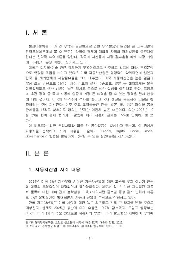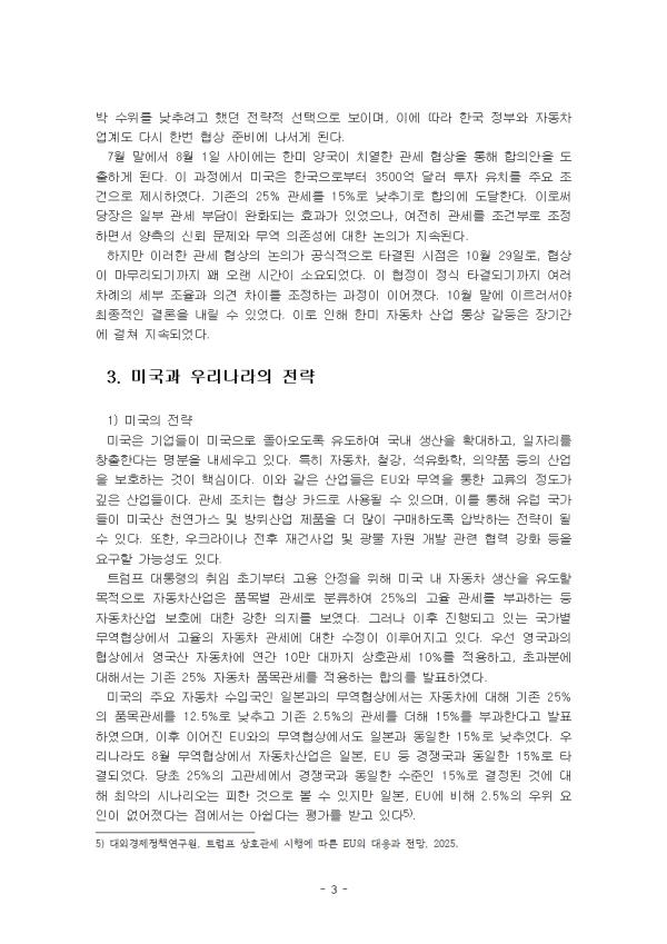 Åë»ó¸¶ÂûÀ̶õ ±¹°¡ °£ ¹«¿ªÀÇ ºÒ±ÕÇüÀ¸·Î ÀÎÇÑ ¹«¿ªºÐÀïÀÇ ¿øÀÎÀ» Æú Å©·ç±×¸ÕÀÇ Àü·«¹«¿ªÀ̷п¡¼ º¼ ¼ö ÀÖµíÀÌ °¢±¹ÀÌ °æÁ¦¿¡ °³ÀÔÇØ ÀÚ±¹ÀÇ °æÁ¦¹ßÀüÀ» ÃËÁøÇØ¾ß ÇÑ´Ù´Â Àü·«Àû ¹«¿ªÀÌ·ÐÀ» ¸»ÇÑ´Ù. °¢±¹ÀÌ ÀڽŵéÀÇ ½ÃÀå Á¡À¯À²À» À§ÇØ ½ÃÀå °³ÀÔ¿¡ ³ª¼¸é¼ Åë»ó ¸¶ÂûÀÌ ºú¾îÁö°í ÀÖ´Ù. ¹Ì±¹Àº µðÁöÅС¤±â¼ú °ü·Ã ±ÔÁ¦±îÁö ¹«¿ªÀ庮À¸·Î °£ÁÖÇϰí ÀÖÀ½¿¡ µû¶ó, ¹«¿ªºÐÀïÀ¸·Î È®ÀåµÉ Á¶ÁüÀ» º¸À̰í ÀÖ´Ù. ¹Ì±¹ ÀÚµ¿Â÷»ê¾÷Àº °æÀï·ÂÀÌ ¾àÈµÇ¸é¼ ÀϺ»°ú Çѱ¹ µî ÇØ¿Ü¾÷ü¿¡ ½ÃÀåÁ¡À¯À²À» Å©°Ô ³»ÁÖ¾ú´Ù. ¹Ì±¹ ÀÚµ¿Â÷»ê¾÷Àº ³ôÀº Àӱݰú ºÎǰ Á¶´Þ ºñ¿ëÀ¸·Î »ý»êÀÌ ³»¼ö ¼ö¿äÀÇ Àý¹Ý ¼öÁØÀ¸·Î, ÀϺ» µî ÇØ¿Ü¾÷ü´Â ¹°·Ð ¹Ì±¹¾÷üµéµµ »ý»ê ºñ¿ëÀÌ ³·Àº ¸ß½ÃÄÚ µîÀ¸·Î »ý»ê ¼³ºñ¸¦ ÀÌÀüÇϰí ÀÖ´Ù. Æ®·³ÇÁÀÇ ÃßÁø Á¤Ã¥ Áß ±¹³» ÀÚµ¿Â÷ ¾÷Á¾¿¡ °¡Àå Å« Ÿ°ÝÀ» ÁÙ ¼ö ÀÖ´Â Á¤Ã¥Àº °ü¼¼ ÀÎ»ó¿¡ ´ëÇÑ °ÍÀÌ´Ù. ¹Ì±¹ÀÇ ¹«¿ª¼öÁö ÀûÀÚ¸¦ ÁÙÀÌ°í ±¹³» »ý»êÀ» À¯µµÇÏ¿© °í¿ëÀ» âÃâÇÏ·Á´Â °Í¿¡ ±âÀÎÇÑ´Ù. ÀÌÈÄ ÁÖ¿ä ±³¿ª±¹µéÀÎ Çѱ¹, ÀϺ», EU µîÀº Çù»óÀ» ÅëÇØ °ü¼¼À²À» 15%·Î ³·Ãß±â·Î ÇÕÀÇ´Â ÇßÁö¸¸ ¿©ÀüÈ÷ ³ôÀº ¼öÁØÀÌ´Ù. ´Ù¸¸ 2025³â 10¿ù 29ÀÏ ÇÑ¹Ì °ü¼¼ ÇùÀǰ¡ Ÿ°áµÊ¿¡ µû¶ó ÀÚµ¿Â÷ °ü¼¼´Â 15%·Î ÀÎÇÏÇϱâ·Î Çß´Ù Á¶¼±ÀϺ¸, °ü¼¼Çù»ó Ÿ°á¡¦ Ò´ 200¾ïºÒ¾¿ 2000¾ïºÒ Çö±ÝÅõÀÚ, 2025, 10, 30. . ÀÌ ·¹Æ÷Æ®´Â ÃÖ±Ù ¿ì¸®³ª¶ó¿Í ¹Ì±¹ °£ Åë»ó°¥µîÀÌ ¹ß»ýÇϰí Àִµ¥, ÀÌ Áß¿¡¼ ÀÚµ¿Â÷¸¦ ¼±ÅÃÇÏ¿© »ç·Ê ³»¿ëÀ» ±â¼úÇϰí, Global, Digital, Local, Glocal GovernanceÀÇ ¹æ¹ýÀ» Ȱ¿ëÇÏ¿© ±Øº¹ÇÒ ¼ö ÀÖ´Â ¹æ¾È(µé)À» Á¦½ÃÇÏ¿´´Ù. II. º» ·Ð 1. ÀÚµ¿Â÷»ê¾÷ »ç·Ê ³»¿ë 2024³â ¹Ì±¹ ´ë¼± ±â°£ºÎÅÍ ½ÃÀÛµÈ ÀÚµ¿Â÷»ê¾÷¿¡ ´ëÇÑ °í°ü¼¼ ºÎ°ú À̽´°¡ Çѱ¹°ú ¹Ì±¹ÀÇ ¹«¿ªÇùÁ¤ÀÌ Å¸°áµÇ¸é¼ ÀϴܶôµÇ¾ú´Ù. À̷νá ÀÏ ³â ÀÌ»ó Áö¼ÓµÇ´ø ÀÚµ¿Â÷ ǰ¸ñ¿¡ ´ëÇÑ ´ë¹Ì °ü¼¼ ºÒÈ®½Ç¼ºÀÌ Ãà¼ÒµÇ¾úÁö¸¸ ±Û·Î¹ú Åë»ó Áú¼ º¯È¿¡ µû¸¥ ¶Ç ´Ù¸¥ ºÒÈ®½Ç¼ºÀÌ È®´ëµÇ¸é¼ ÀÚµ¿Â÷ »ê¾÷¿¡ ºÎ´ãÀ¸·Î ÀÛ¿ëÇϰí ÀÖ´Ù. Çѱ¹ ÀÚµ¿Â÷»ê¾÷Àº ¹Ì±¹ ½ÃÀå¿¡ ´ëÇÑ ³ôÀº ÀÇÁ¸µµ·Î ÀÎÇØ Å« Ÿ°ÝÀ» ¹ÞÀ» °ÍÀ¸·Î ¿¹»óµÈ´Ù. ½ÇÁ¦·Î 2025³â »ó¹Ý±â ´ë¹Ì ¼öÃâÀº 10.7% °¨¼ÒÇß´Ù. Æ®·³ÇÁ ÇàÁ¤ºÎ´Â ¹Ì±¹ÀÇ ¹«¿ªÀûÀÚÀÇ ÁÖ¿ä ¿øÀÎÀ¸·Î ÀÚµ¿Â÷¿Í ºÎǰÀÇ ¹«¿ª ºÒ±ÕÇüÀ» Áö¸ñÇÏ¸ç ¹«¿ªÈ®Àå¹ý 232Á¶¸¦ ±Ù°Å·Î ¼öÀÔ ÀÚµ¿Â÷¿Í ºÎǰ¿¡ ÀÏ·üÀûÀ¸·Î 25%ÀÇ °ü¼¼¸¦ ºÎ°úÇß´Ù. 2025³â 4¿ù 3ÀϺÎÅÍ ¸ðµç ÇØ¿Ü¿¡¼ »ý»êµÈ ½Â¿ëÂ÷¿¡ 25%ÀÇ °ü¼¼°¡ Àû¿ëµÇ¾ú°í, 5¿ù 3ÀϺÎÅÍ´Â ÀÚµ¿Â÷ºÎǰµµ µ¿ÀÏÇÑ °ü¼¼°¡ ºÎ°úµÇ¾ú´Ù. ¸¹Àº Á¦Á¶»ç°¡ »ó¹Ý±â¿¡´Â °ü¼¼ÀλóÀ¸·Î ÀÎÇÑ ¿ø°¡ºÎ´ãÀ» Èí¼öÇÏ¸ç ÆÇ¸Å°¡°Ý ÀλóÀ» À¯º¸ÇßÀ¸³ª, ÇϹݱâ ÀÌÈÄ¿¡´Â ÆÇ¸Å°¡°Ý Á¶Á¤ µîÀ» ÅëÇØ °ü¼¼È¿°ú°¡ º»°Ý鵃 °ÍÀ¸·Î º¸ÀδÙ. ´Ù¸¸ 2025³â 10¿ù 29ÀÏ ÇÑ¹Ì °ü¼¼ ÇùÀǰ¡ Ÿ°áµÊ¿¡ µû¶ó ÀÚµ¿Â÷ °ü¼¼´Â 15%¸¦ ÀÎÇÏÇϱâ·Î Çß´Ù. 2. Åë»ó°¥µî ÁøÇà°úÁ¤ 2025³â ±âÁØÀ¸·Î ÇÑ¹Ì ÀÚµ¿Â÷ »ê¾÷ Åë»ó°¥µîÀ» ´º½º¸¦ Áß½ÉÀ¸·Î Á¤¸®ÇÏ¿´´Ù. 2025³â 2¿ù 20ÀÏ, ¹Ì±¹ÀÌ ¼öÀÔ ÀÚµ¿Â÷¿¡ ´ëÇØ ÃÖ´ë 25%¿¡ ´ÞÇÏ´Â ³ôÀº °ü¼¼¸¦ ºÎ°úÇÏ´Â Á¤Ã¥À» ±¸»ó ÁßÀ̶ó°í °ø½ÄÀûÀ¸·Î ¹ßÇ¥ÇÏ¸é¼ ¾ç±¹ °£ Åë»ó ¹®Á¦´Â º»°ÝÀûÀÎ °¥µî ±¹¸éÀ¸·Î Á¢¾îµç´Ù. ÀÌ ¹ßÇ¥´Â ±Û·Î¹ú ÀÚµ¿Â÷ ½ÃÀå¿¡µµ Å« ÆÄÀåÀ» ¿¹°íÇÑ Á¶Ä¡·Î Æò°¡µÇ¾ú´Ù. ¼öÃâ Á᫐ ±¹°¡·Î¼ÀÇ ÀÔÁö¸¦ Áö´Ñ Çѱ¹¿¡ Á÷Á¢ÀûÀÎ ¿µÇâÀ» ¹ÌÄ¥ °¡´É¼ºÀÌ Á¦±âµÇ¾ú´Ù. ÀÌ ¹ßÇ¥´Â ¹Ì±¹ ³» ÀÚµ¿Â÷ »ê¾÷ º¸È£ ¹× ÀÏÀÚ¸® âÃâÀ» ¸ñÇ¥·Î ³»¼¼¿üÀ¸³ª, ±¹Á¦ÀûÀ¸·Î´Â º¸È£¹«¿ªÁÖÀǰ¡ ½ÉȵǴ ½ÅÈ£·Î ¹Þ¾Æµé¿©Á³´Ù. 4¿ù 2ÀÏ¿¡´Â Æ®·³ÇÁ ´ëÅë·ÉÀÌ Çѱ¹À» ºñ·ÔÇÑ Àü ¼¼°èÀÇ ÁÖ¿ä ¹«¿ª »ó´ë±¹À» ´ë»óÀ¸·Î »óÈ£°ü¼¼¸¦ Àû¿ëÇϰڴٴ Á¤Ã¥À» °ø½ÄÀûÀ¸·Î ¼±¾ðÇÏ¿´´Ù. ¹«¿ª Àü¼±À» È®´ëÇϱâ À§ÇÑ ÀÇÁö¸¦ ¸íÈ®È÷ µå·¯³½´Ù. ÀÌ Á¤Ã¥Àº ¹Ì±¹À¸·Î ¼öÀԵǴ ¿Ü±¹»ê Á¦Ç°¿¡ ´ëÇØ ÀÚ±¹ Á¦Ç°°ú µ¿µîÇÑ °ü¼¼¸¦ ¸Å±â°Ú´Ù´Â ÃëÁöÀÇ ³»¿ëÀ¸·Î, Çѱ¹À» Æ÷ÇÔÇÑ ÁÖ¿ä ÀÚµ¿Â÷ ¼öÃâ ±¹°¡µé¿¡°Ô Å« ¿ì·Á¸¦ ºÒ·¯ÀÏÀ¸Ä×´Ù. 4¿ù 3ÀÏ, ¿Ü±¹»ê ÀÚµ¿Â÷¿¡ ´ëÇØ 25%ÀÇ ¼¼À²À» Àû¿ëÇϴ ǰ¸ñº° °ü¼¼ ºÎ°ú°¡ ½ÇÁ¦·Î ½ÃÇàµÈ´Ù. ¹ßÇ¥ ´Ü°è¿¡¼ ±×Ä¡Áö ¾Ê°í, °ð¹Ù·Î ½ÇÇà¿¡ ¿Å°ÜÁø Á¤Ã¥À̶ó´Â Á¡¿¡¼ ½ÃÀå¿¡ Ãæ°ÝÀ» ÁÖ¾úÀ¸¸ç, ÀÚµ¿Â÷ 
