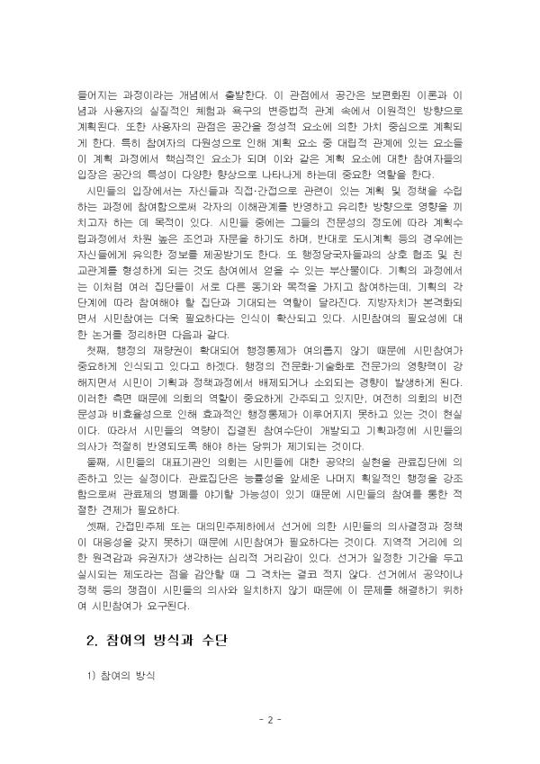 ±âȹÀº º¸´Ù ³ªÀº ¼ö´ÜÀ¸·Î ¸ñÇ¥¸¦ ´Þ¼ºÇϱâ À§ÇØ Àå·¡ÀÇ Çൿ¿¡ °üÇÑ °áÁ¤À» ÁغñÇÏ´Â °ÍÀ¸·Î¼ °èȹÀ» ¼ö¸³¡¤ÁýÇàÇÏ´Â °úÁ¤ÀÌ´Ù. ±âȹ°ú À¯»çÇÑ ÀǹÌÀÇ ¿ë¾î·Î¼ Á¤Ã¥, ÇÁ·Î±×·¥, ÇÁ·ÎÁ§Æ®, ¸ðÇü µîÀÌ Àִµ¥, ÀÇ»ç°áÁ¤À̶ó´Â Á¡¿¡¼ º»ÁúÀº ºñ½ÁÇÏÁö¸¸ ±× °Á¶Á¡À̳ª ¹üÀ§¿¡¼ »ó´ëÀûÀÎ Â÷À̸¦ º¸ÀδÙ. ¿ì¸®°¡ ¾ÕÀ¸·Î º¸°Ô µÉ ±âȹÀº ÁÖ·Î ±¹°¡¼öÁØÀÇ Á¤ºÎ±âȹÀ¸·Î¼ ±¹°¡ ¹× »çȸÀÇ ¹Ù¶÷Á÷ÇÑ ¹Ì·¡¿¡ ´ëÇÑ ¹ßÀü°èȹÀ» ´ë»óÀ¸·Î ÇÏ´Â °ÍµéÀÌ´Ù. ¹ÎÁÖ»çȸ¿¡¼ÀÇ ±âȹÀº °¢°èÀÇ ÀǰßÀ» ¼ö·ÅÇÏ¿© ÁßÁö¸¦ ¸ðÀ¸°í ÀÌÇØ°ü°è¸¦ ±ÕÇü ÀÖ°Ô ¹Ý¿µÇØ¾ß ÇÑ´Ù. µû¶ó¼ ±âȹ°úÁ¤¿¡ Âü¿©ÀÇ ±âȸ¸¦ È®´ëÇÒ Çʿ䰡 ÀÖ´Ù. ½Ã¹ÎÂü¿©´Â ÇàÁ¤±â°ü¿¡¼ Á¤Ã¥À» ¼ö¸³Çϰí ÁýÇàÇÏ´Â °úÁ¤¿¡ ÀϹݽùÎÀÌ °ü¿©ÇÏ´Â °ÍÀ» °¡¸®Å°¸ç, À̰ÍÀÌ ±âȹ°úÁ¤¿¡ Àû¿ëµÉ °æ¿ì Âü¿©±âȹÀ̶ó°í ÇÑ´Ù. Âü¿©´Â ÀÇ»ç°áÁ¤¿¡ ¹ÌÄ¡´Â ¿µÇâÀÇ Á¤µµ¸¦ ³ªÅ¸³»´Â °³³äÀ̶ó°í ÇÒ ¼ö ÀÖ´Ù. Á¤Ä¡¡¤ÇàÁ¤Àû Â÷¿ø¿¡¼´Â À̸¥¹Ù ½Ã¹ÎÂü¿©(citizen participation)°¡ ÇÙ½ÉÀÌ µÈ´Ù. ƯÈ÷ ±Ç·ÂÀ¸·ÎºÎÅÍ ¼Ò¿ÜµÇ°Å³ª °æÁ¦Àû ÁöÀ§°¡ ¾àÇÏ°í °ü·ÃµÇ´Â Á¤º¸¸¦ °®Áö ¸øÇÑ ½Ã¹Îµé¿¡°Ô, ±×µéÀÇ »î¿¡ ¿µÇâÀ» ¹ÌÄ¡´Â Á¤ºÎÀÇ Á¤Ã¥°áÁ¤ ¹× ÁýÇࡤÆò°¡°úÁ¤¿¡ °ü¿©Çϰųª ÀǰßÀ» ¹Ý¿µÇÒ ±âȸ°¡ Á¦°øµÇµµ·Ï ÇÏ´Â °ÍÀÌ Áß¿äÇÏ´Ù. ÀÌ ·¹Æ÷Æ®´Â ±âȹ °úÁ¤¿¡ ½Ã¹ÎÀÌ Âü¿©ÇÏ´Â ¹®Á¦¿Í °ü·ÃÇÏ¿© ½Ã¹ÎÂü¿©°¡ ÇÊ¿äÇÑ ÀÌÀ¯, Âü¿©ÀÇ ¹æ½Ä°ú ¼ö´Ü, Âü¿©ÀÇ ¼ø±â´É°ú ¿ª±â´É¿¡ ´ëÇÏ¿© ¼¼úÇÏ¿´´Ù. II. º» ·Ð 1. ½Ã¹ÎÂü¿©°¡ ÇÊ¿äÇÑ ÀÌÀ¯ Âü¿©´Â ´Ù¾çÇÑ °øµ¿Ã¼¿Í »çȸÀû °ü°è¿¡ ÀÖ´Â ´Ù¿øÀûÀÎ ÁÖüµéÀÌ »óÈ£ÁÖ°üÀûÀÎ ÀÌÇØ¸¦ ¹ÙÅÁÀ¸·Î °øµ¿ÀÇ °¡Ä¡¸¦ ½ÇÇöÇÏ´Â °úÁ¤ÀÌ´Ù. µû¶ó¼ Âü¿©´Â Çù·ÂÀû °èȹÀ» À§ÇÑ °ø·ÐÀÇ ÀåÀº ¸î°¡Áö ±âº»ÀûÀÎ Á¶°ÇÀ» Åä´ë·Î ÀÌ·ç¾îÁø´Ù. °ø·ÐÀÇ ÀåÀº ÈçÈ÷ ÀÌÇØ´ç»çÀÚ·Î ÁöĪµÇ´Â ½Ã¼³ ÁÖ¿ä ±â´É°ú °ü·ÃÇÑ ¿ëµµ·Î ÀÌ¿ëÇÏ´Â »ç¶÷µé ¿Ü¿¡µµ ÀÏ»ó »ýȰÀÇ ¿ëµµ·Î »ç¿ëÇϰųª »ç¿ëÇÏÁö ¾Ê´Â »ç¶÷±îÁö Æ÷ÇÔÇÏ´Â ÁÖüÀûÀÌ°í Æ÷°ýÀûÀÎ Âü¿©°¡ °¡´ÉÇÑ ¹æ¹ýÀÌ ÇÊ¿äÇÏ´Ù. µû¶ó¼ »çȸ ±¸¼º¿øÀÇ ´Ù¾çÇÑ »çȸ¡¤¹®ÈÀû Â÷À̸¦ ÀνÄÇϰí Â÷À̸¦ °¥µîÀÇ ¿ä¼Ò¿¡¼ »õ·Î¿î »çȸÀû °ø°£À» ¸¸µå´Â ÀÚ¿øÀ¸·Î Ȱ¿ëÇÒ ¼ö ÀÖ´Â ÀÇ»ç¼ÒÅë°ú ÇÕÀÇÇü¼ºÀÇ ¹æ¹ý°ú À̸¦ À§ÇÑ ´Ù¿øÀûÀÎ »ç¿ëÀÚ °üÁ¡¿¡ ´ëÇÑ ÀÌÇØÀÇ Á߿伺ÀÌ ºÎ°¢µÈ´Ù. »ç¿ëÀÚÀÇ °üÁ¡Àº °ø°£ÀÌ »ç¿ëÀÚ¿¡ ÀÇÇØ ±× ÀÇ¹Ì¿Í ¿ëµµ°¡ ÀçÇØ¼® µÇ¾î »õ·Ó°Ô ¸¸µé¾îÁö´Â °úÁ¤À̶ó´Â °³³ä¿¡¼ Ãâ¹ßÇÑ´Ù. ÀÌ °üÁ¡¿¡¼ °ø°£Àº º¸ÆíÈµÈ À̷аú À̳ä°ú »ç¿ëÀÚÀÇ ½ÇÁúÀûÀΠüÇè°ú ¿å±¸ÀÇ º¯Áõ¹ýÀû °ü°è ¼Ó¿¡¼ ÀÌ¿øÀûÀÎ ¹æÇâÀ¸·Î °èȹµÈ´Ù. ¶ÇÇÑ »ç¿ëÀÚÀÇ °üÁ¡Àº °ø°£À» Á¤¼ºÀû ¿ä¼Ò¿¡ ÀÇÇÑ °¡Ä¡ Áß½ÉÀ¸·Î °èȹµÇ°Ô ÇÑ´Ù. ƯÈ÷ Âü¿©ÀÚÀÇ ´Ù¿ø¼ºÀ¸·Î ÀÎÇØ °èȹ ¿ä¼Ò Áß ´ë¸³Àû °ü°è¿¡ ÀÖ´Â ¿ä¼ÒµéÀÌ °èȹ °úÁ¤¿¡¼ ÇÙ½ÉÀûÀÎ ¿ä¼Ò°¡ µÇ¸ç ÀÌ¿Í °°Àº °èȹ ¿ä¼Ò¿¡ ´ëÇÑ Âü¿©ÀÚµéÀÇ ÀÔÀåÀº °ø°£ÀÇ Æ¯¼ºÀÌ ´Ù¾çÇÑ Çâ»óÀ¸·Î ³ªÅ¸³ª°Ô Çϴµ¥ Áß¿äÇÑ ¿ªÇÒÀ» ÇÑ´Ù. ½Ã¹ÎµéÀÇ ÀÔÀå¿¡¼´Â Àڽŵé°ú Á÷Á¢¡¤°£Á¢À¸·Î °ü·ÃÀÌ ÀÖ´Â °èȹ ¹× Á¤Ã¥À» ¼ö¸³ÇÏ´Â °úÁ¤¿¡ Âü¿©ÇÔÀ¸·Î½á °¢ÀÚÀÇ ÀÌÇØ°ü°è¸¦ ¹Ý¿µÇϰí À¯¸®ÇÑ ¹æÇâÀ¸·Î ¿µÇâÀ» ³¢Ä¡°íÀÚ ÇÏ´Â µ¥ ¸ñÀûÀÌ ÀÖ´Ù. ½Ã¹Îµé Áß¿¡´Â ±×µéÀÇ Àü¹®¼ºÀÇ Á¤µµ¿¡ µû¶ó °èȹ¼ö¸³°úÁ¤¿¡¼ Â÷¿ø ³ôÀº Á¶¾ð°ú ÀÚ¹®À» Çϱ⵵ Çϸç, ¹Ý´ë·Î µµ½Ã°èȹ µîÀÇ °æ¿ì¿¡´Â Àڽŵ鿡°Ô À¯ÀÍÇÑ Á¤º¸¸¦ Á¦°ø¹Þ±âµµ ÇÑ´Ù. ¶Ç ÇàÁ¤´ç±¹ÀÚµé°úÀÇ »óÈ£ ÇùÁ¶ ¹× Ä£±³°ü°è¸¦ Çü¼ºÇÏ°Ô µÇ´Â °Íµµ Âü¿©¿¡¼ ¾òÀ» ¼ö ÀÖ´Â ºÎ»ê¹°ÀÌ´Ù. ±âȹÀÇ °úÁ¤¿¡¼´Â ÀÌó·³ ¿©·¯ Áý´ÜµéÀÌ ¼·Î ´Ù¸¥ µ¿±â¿Í ¸ñÀûÀ» °¡Áö°í Âü¿©Çϴµ¥, ±âȹÀÇ °¢ ´Ü°è¿¡ µû¶ó Âü¿©ÇØ¾ß ÇÒ Áý´Ü°ú ±â´ëµÇ´Â ¿ªÇÒÀÌ ´Þ¶óÁø´Ù. Áö¹æÀÚÄ¡°¡ º»°ÝÈµÇ¸é¼ ½Ã¹ÎÂü¿©´Â ´õ¿í ÇÊ¿äÇÏ´Ù´Â ÀνÄÀÌ È®»êµÇ°í ÀÖ´Ù. ½Ã¹ÎÂü¿©ÀÇ Çʿ伺¿¡ ´ëÇÑ ³í°Å¸¦ Á¤¸®ÇÏ¸é ´ÙÀ½°ú °°´Ù. ù°, ÇàÁ¤ÀÇ Àç·®±ÇÀÌ È®´ëµÇ¾î ÇàÁ¤ÅëÁ¦°¡ ¿©ÀÇ·ÓÁö ¾Ê±â ¶§¹®¿¡ ½Ã¹ÎÂü¿©°¡ Áß¿äÇÏ°Ô Àνĵǰí ÀÖ´Ù°í ÇϰڴÙ. ÇàÁ¤ÀÇ Àü¹®È¡¤±â¼úÈ·Î Àü¹®°¡ÀÇ ¿µÇâ·ÂÀÌ °ÇØÁö¸é¼ ½Ã¹ÎÀÌ ±âȹ°ú Á¤Ã¥°úÁ¤¿¡¼ ¹èÁ¦µÇ°Å³ª ¼Ò¿ÜµÇ´Â °æÇâÀÌ ¹ß»ýÇÏ°Ô µÈ´Ù. ÀÌ·¯ÇÑ Ãø¸é ¶§¹®¿¡ ÀÇȸÀ