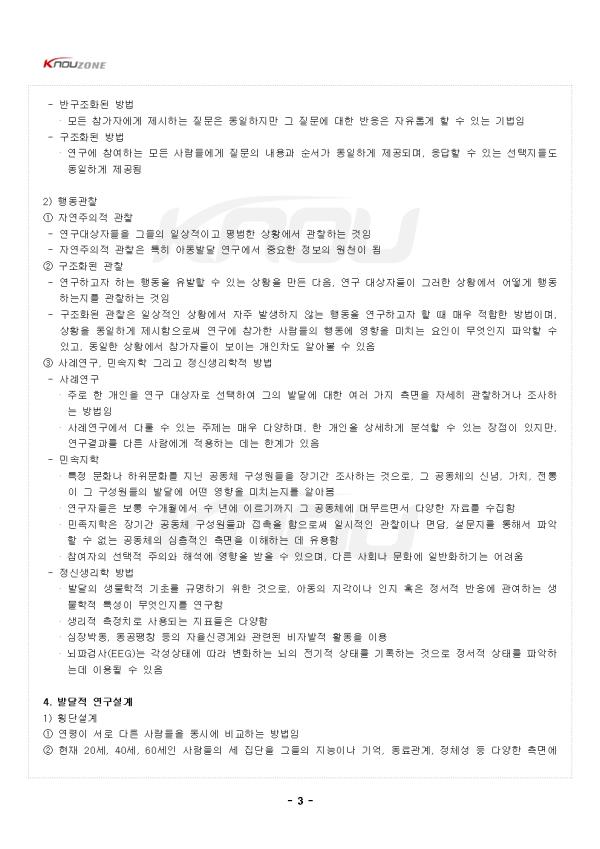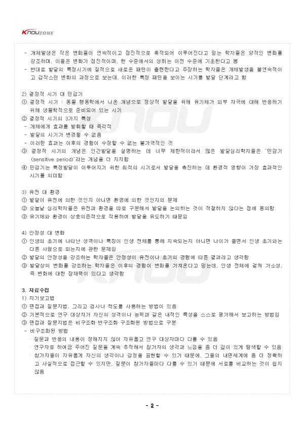 1. ¹ß´Þ½É¸®ÇÐÀÇ ±âº» °³³äµé 1) Àü »ý¾Ö ¹ß´ÞÀû °üÁ¡ ¨ç Àΰ£Àº ¼öÁ¤¿¡¼ºÎÅÍ Á×À» ¶§±îÁö ²÷ÀÓ¾øÀÌ º¯È ¨è ¹ß´Þ½É¸®ÇÐ - ½Ã°£Àû Â÷¿ø¿¡ µû¸¥, Áï ¿¬·É¿¡ µû¸¥ ü°èÀûÀÎ º¯È¸¦ ¿¬±¸ÇÏ´Â Çй® - ¹ß´Þ½É¸®ÇÐÀÇ ÇٽɰúÁ¦´Â Àü »ý¾Ö¿¡ °ÉÃÄ Ã¼°èÀûÀ¸·Î ÀϾ´Â º¯È¸¦ ¿¬±¸ÇÏ´Â Çй®À̸ç, ¹ß´ÞÀº Á¤ÀûÀ¸·Î Á¸ÀçÇÏ´Â °ÍÀÌ ¾Æ´Ï¶ó ÇϳªÀÇ °úÁ¤ÀÓ - Baltes(1987)°¡ Á¦½ÃÇÑ Àü »ý¾Ö ¹ß´ÞÀÇ ´Ù¾çÇÑ Æ¯Â¡ ¡¤ ¹ß´ÞÀº Æò»ý¿¡ °ÉÃÄ ÀϾ´Â ÇϳªÀÇ °úÁ¤À¸·Î ´ÙÂ÷¿øÀÌ°í ´Ù¹æÇâÀûÀÓ ¡¤ º¯È´Â ¾ö°ÝÇÏ°Ô °íÁ¤µÈ ¹æ½ÄÀÌ ¾Æ´Ñ, ¿ª»ç¿Í ¸Æ¶ôÀÇ ¿µÇâÀ» ¹Þ´Â ´ÙÇÐÁ¦Àû Ãø¸éÀ» ¹Ý¿µÇÔ - Elder(1998)ÀÇ »ý¾Ö°úÁ¤ ÀÌ·Ð ¡¤ Àΰ£¹ß´Þ°ú ³ëÈ´Â »ý¾Ö Àüü¿¡ °ÉÃÄ Áö¼ÓµÇ´Â °úÁ¤ÀÌ´Ù. ¡¤ ½Ã±âÀÇ ¿øÄ¢ : »ý¾Ö Àüȯ, »ç°Ç, Çൿ ÆÐÅÏ¿¡¼ ³ªÅ¸³ª´Â ¹ß´ÞÀû ¼±Çà»ç°Ç°ú ±× °á°ú´Â °³ÀÎ »ý¾Ö¿¡¼ ¾î´À ½Ã±âÀÎÁö¿¡ µû¶ó ´Ù¾çÇÏ°Ô ³ªÅ¸³´Ù. ¡¤ ¿¬°áµÈ »ýÀÇ ¿øÄ¢ : »ý¾Ö´Â »óÈ£ÀÇÁ¸ÀûÀ̸ç, »çȸ¿ª»çÀû ¿µÇâµéÀº °øÀ¯µÈ °ü°èÀÇ ±×¹°¸ÁÀ» ÅëÇØ ³ªÅ¸³´Ù. ¡¤ ¿ª»çÀû ½Ã°ø°£ÀÇ ¿øÄ¢ : °³ÀÎÀÇ »ý¾Ö°úÁ¤Àº ±×°¡ Àλý¿¡¼ °æÇèÇÏ´Â ¿ª»çÀû ½Ã°ø°£ ¼Ó¿¡¼ ±¸ÇöµÇ°í ¹Ù²ï´Ù. ¡¤ Àΰ£ÁÖüÀÇ ¿øÄ¢ : ¼±Åðú ÇൿÀ» ÅëÇØ °³ÀÎÀº ÀÚ½ÅÀÇ »ý¾Ö°úÁ¤À» ±¸¼ºÇϸç, ±×·¯ÇÑ ¼±Åðú ÇൿÀº ¿ª»ç¿Í »çȸ ȯ°æÀÌ Á¦°øÇÏ´Â ±âȸ¿Í Á¦¾àÀ» ¹Þ°Ô µÈ´Ù. 2) ¿¬·É°ú ½Ã±â ¨ç Àΰ£ÀÇ Àü »ý¾Ö¸¦ ¿©·¯ ½Ã±â·Î ±¸ºÐÇÏ´Â µ¥´Â ´Ù¾çÇÑ ¹æ¹ýÀÌ ÀÖÀ½ ¨è ¿¬·É¿¡ µû¸¥ Àΰ£¹ß´ÞÀÇ ´Ü°è - ų»±â(¼öÁ¤~Ãâ»ý) : ´Ù¸¥ ±â°£¿¡ ºñÇØ »ó´ëÀûÀ¸·Î ªÁö¸¸ ÇϳªÀÇ ¼¼Æ÷°¡ À¯±âü·Î ¹ß´ÞÇÏ´Â Å« ¼ºÀåÀÌ ÀϾ´Â ½Ã±âÀÓ - ¿µ¾Æ±â(Ãâ»ý~2¼¼) : ¾çÀ°ÀÚ¿¡°Ô Å©°Ô ÀÇÁ¸ÇÏ¸é¼ ´Ù¾çÇÑ ¿µ¿ª¿¡¼ÀÇ ¹ß´ÞÀ» ½ÃÀÛÇÏ´Â ½Ã±âÀÓ - À¯¾Æ±â(2~6¼¼) : Ãʱ⠾Ƶ¿±â ȤÀº ÇÐ·É Àü±â¶ó°íµµ Çϴµ¥, ÀÌ ½Ã±â¿¡ ½ÇÁúÀûÀ¸·Î ¶Ç·¡°ü°è°¡ Áß¿äÇØÁö°í Çб³¿¡ ´ëÇÑ Áغñ¸¦ ÇÏ°Ô µÊ - ¾Æµ¿±â(6~11¼¼) : ÃʵîÇб³¿¡ ´Ù´Ï¸é¼ Çб³°¡ ºÎ¿©ÇÏ´Â »õ·Î¿î °ú¾÷À» Àß ¼öÇàÇÏ´Â °ÍÀÌ Áß¿äÇÑ °ú¾÷ÀÓ - û¼Ò³â±â(10-12¼¼ ~ 18-21¼¼) : ½ÅüÀû¡¤ÀÎÁöÀû¡¤»çȸÀû Â÷¿ø¿¡¼ÀÇ ´Ù¾çÇÑ º¯È¿¡ Á÷¸éÇÔ - ¼ºÀÎÃʱâ(20´ë¿Í 30´ë) : ¼º³â±â¶ó°íµµ Çϸç, °áÈ¥À» Çϰí Á÷¾÷À» °®´Â ½Ã±âÀÓ - ¼ºÀÎÁ߱⠶Ǵ Áß³â±â(40~60¼¼) : °¡Á·À̳ª Á÷¾÷ÀÇ Ãø¸é¿¡¼ ¸¹Àº º¯È¸¦ °æÇèÇϰí, À̰ÍÀÌ Á¤Ã¼¼º¿¡ ´ëÇÑ Á¦2ÀÇ À§±â¸¦ À¯¹ßÇϱ⵵ ÇÔ - ¼ºÀÎÈı⠶Ǵ ³ë³â±â(61¼¼~Á×À½) : Æò±Õ¼ö¸íÀÇ Áõ°¡·Î »ó´ëÀûÀ¸·Î ±æ¾îÁü 2. ¹ß´Þ½É¸®ÇÐÀÇ ÇÙ½É Áú¹®µé 1) ¾çÀû ´ë ÁúÀûº¯È - °³Ã¼¹ß»ýÀº ÀÛÀº º¯ÈµéÀÌ ¿¬¼ÓÀûÀ̰í Á¡ÁøÀûÀ¸·Î ÃàÀûµÇ¾î ÀÌ·ç¾îÁø´Ù°í ¹Ï´Â ÇÐÀÚµéÀº ¾çÀûÀÎ º¯È¸¦ °Á¶Çϸç, À̵éÀº º¯È°¡ Á¡ÁøÀûÀ̸ç, ÇÑ ¼öÁØ¿¡¼ÀÇ ¼ºÃë´Â ÀÌÀü ¼öÁØ¿¡ ±âÃÊÇÑ´Ù°í º½ - ¹Ý´ë·Î ¹ß´ÞÀÇ Æ¯Á¤½Ã±â¿¡ ÁúÀûÀ¸·Î »õ·Î¿î ÆÐÅÏÀÌ ÃâÇöÇÑ´Ù°í ÁÖÀåÇÏ´Â ÇÐÀÚµéÀº °³Ã¼¹ß»ýÀ» ºÒ¿¬¼ÓÀûÀÌ°í °©ÀÛ½º·± º¯ÈÀÇ °úÁ¤À¸·Î º¸´Âµ¥, ÀÌ·¯ÇÑ Æ¯Á¤ ÆÐÅÏÀ» º¸ÀÌ´Â ½Ã±â¸¦ ¹ß´Þ ´Ü°è¶ó°í ÇÔ 2) °áÁ¤Àû ½Ã±â ´ë ¹Î°¨±â ¨ç °áÁ¤Àû ½Ã±â : µ¿¹° ÇൿÇп¡¼ ³ª¿Â °³³äÀ¸·Î Á¤»óÀû ¹ß´ÞÀ» À§ÇØ À¯±âü°¡ ¿ÜºÎ Àڱؿ¡ ´ëÇØ ¹ÝÀÀÇϱâ À§ÇØ »ý¹°ÇÐÀûÀ¸·Î ÁغñµÇ¾î ÀÖ´Â ½Ã±â ¨è °áÁ¤Àû ½Ã±âÀÇ 3°¡Áö Ư¼º - °³Ã¼¿¡°Ô È¿°ú¸¦ ¹ßÈÖÇÒ ¶§ Áï°¢Àû - ¹ß´ÞÀÇ ½Ã±â°¡ º¯°æµÉ ¼ö ¾øÀ½ - ÀÌ·¯ÇÑ È¿°ú´Â ÀÌÈÄÀÇ °æÇèÀÌ ¼öÁ¤ÇÒ ¼ö ¾ø´Â ºÒ°¡¿ªÀûÀÎ °Í ¨é °áÁ¤Àû ½Ã±âÀÇ °³³äÀº Àΰ£¹ß´ÞÀ» ¼³¸íÇÏ´Â µ¥ ³Ê¹« Á¦ÇÑÀûÀÌ¶ó¼ ¸¹Àº ¹ß´Þ½É¸®ÇÐÀÚµéÀº ¡®¹Î°¨±â(sensitive period)¡¯¶ó´Â °³³äÀ» ´õ ÁöÁöÇÔ ¨ê ¹Î°¨±â´Â ƯÁ¤¹ß´ÞÀÌ ÀÌ·ç¾îÁö±â À§ÇÑ ÃÖÀûÀÇ ½Ã±â·Î¼ ¹ß´ÞÀ» ÃËÁøÇÏ´Â µ¥ ȯ°æÀû ¿µÇâÀÌ °¡Àå È¿°úÀûÀÎ ½Ã±â¸¦ ÀǹÌÇÔ 3) À¯Àü ´ë ȯ°æ ¨ç ¹ß´ÞÀÌ À¯Àü¿¡ ÀÇÇÑ °ÍÀÎÁö ¾Æ´Ï¸é ȯ°æ¿¡ ÀÇÇÑ °ÍÀÎÁöÀÇ ¹®Á¦ ¨è ¿À´Ã³¯ ½É¸®ÇÐÀÚµéÀº À¯Àü°ú ȯ°æÀ» µû·Î ±¸ºÐÇØ¼ ¹ß´ÞÀ» ³íÀÇÇÏ´Â °ÍÀÌ ÀûÀýÇÏÁö ¾Ê´Ù´Â Á¡¿¡ µ¿ÀÇÇÔ ¨é À¯±âü¿Í ȯ°æÀÌ »óÈ£ÀÇÁ¸ÀûÀ¸·Î ÀÛ¿ëÇÏ¿© ¹ß´ÞÀ» À¯µµÇϱ⠶§¹®ÀÓ 4) ¾ÈÁ¤¼º ´ë º¯È ¨ç ÀλýÀÇ Ãʱ⿡ ³ªÅ¸³ ¼º°ÝÀ̳ª Ư¡ÀÌ Àλý Àüü¸¦ ÅëÇØ Áö¼ÓµÇ´ÂÁö ¾Æ´Ï¸é ³ªÀ̰¡ µé¸é¼ Àλý Ãʱâ¿Í´Â ´Ù¸¥ »ç¶÷À¸·Î µÇ´ÂÁö¿¡ °üÇÑ ¹®Á¦ÀÓ ¨è ¹ß´ÞÀÇ ¾ÈÁ¤¼ºÀ» °Á¶ÇÏ´Â ÇÐÀÚµéÀº ¾ÈÁ¤¼ºÀÌ À¯ÀüÀ̳ª ÃʱâÀÇ °æÇ