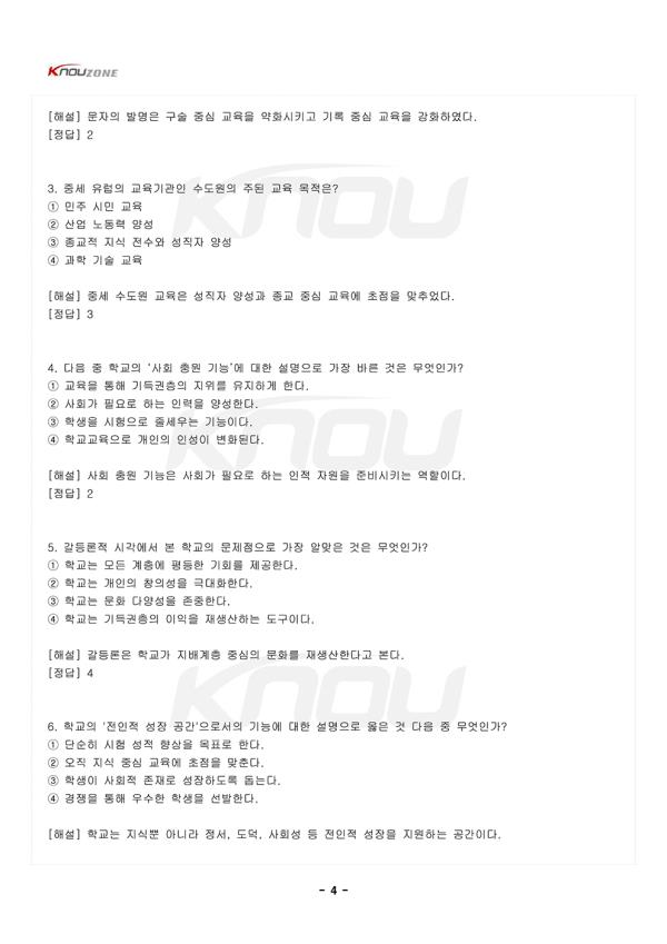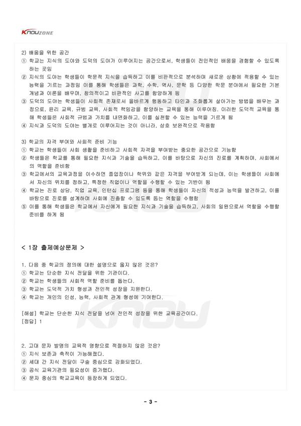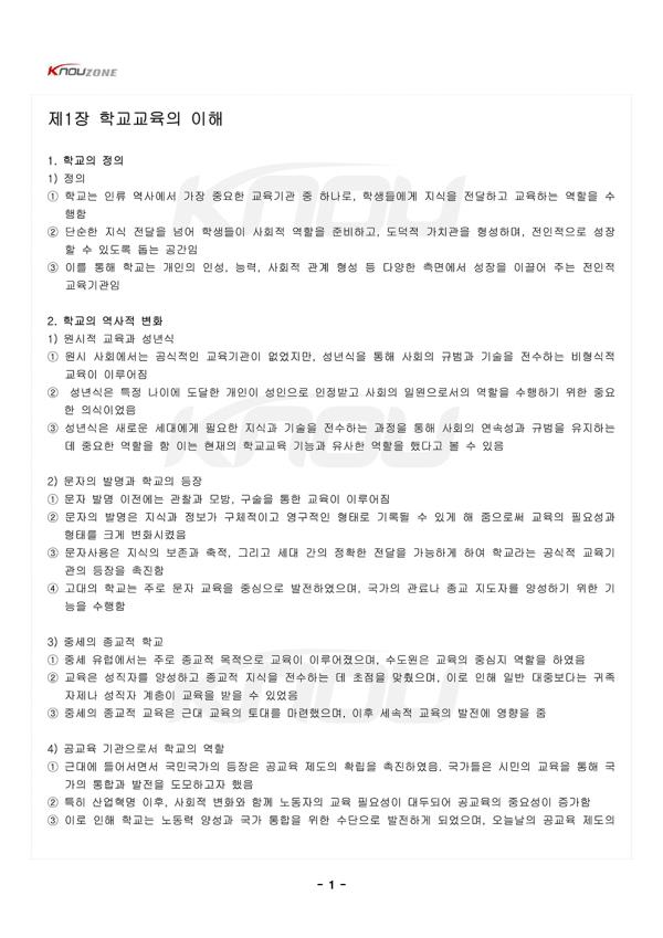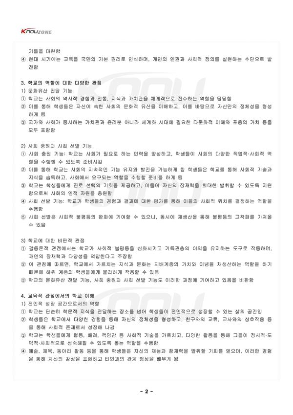 1. Çб³ÀÇ Á¤ÀÇ 1) Á¤ÀÇ ¨ç Çб³´Â Àηù ¿ª»ç¿¡¼ °¡Àå Áß¿äÇÑ ±³À°±â°ü Áß Çϳª·Î, Çлýµé¿¡°Ô Áö½ÄÀ» Àü´ÞÇÏ°í ±³À°ÇÏ´Â ¿ªÇÒÀ» ¼öÇàÇÔ ¨è ´Ü¼øÇÑ Áö½Ä Àü´ÞÀ» ³Ñ¾î ÇлýµéÀÌ »çȸÀû ¿ªÇÒÀ» ÁغñÇϰí, µµ´öÀû °¡Ä¡°üÀ» Çü¼ºÇϸç, ÀüÀÎÀûÀ¸·Î ¼ºÀåÇÒ ¼ö ÀÖµµ·Ï µ½´Â °ø°£ÀÓ ¨é À̸¦ ÅëÇØ Çб³´Â °³ÀÎÀÇ Àμº, ´É·Â, »çȸÀû °ü°è Çü¼º µî ´Ù¾çÇÑ Ãø¸é¿¡¼ ¼ºÀåÀ» À̲ø¾î ÁÖ´Â ÀüÀÎÀû ±³À°±â°üÀÓ 2. Çб³ÀÇ ¿ª»çÀû º¯È 1) ¿ø½ÃÀû ±³À°°ú ¼º³â½Ä ¨ç ¿ø½Ã »çȸ¿¡¼´Â °ø½ÄÀûÀÎ ±³À°±â°üÀÌ ¾ø¾úÁö¸¸, ¼º³â½ÄÀ» ÅëÇØ »çȸÀÇ ±Ô¹ü°ú ±â¼úÀ» Àü¼öÇÏ´Â ºñÇü½ÄÀû ±³À°ÀÌ ÀÌ·ç¾îÁü ¨è ¼º³â½ÄÀº ƯÁ¤ ³ªÀÌ¿¡ µµ´ÞÇÑ °³ÀÎÀÌ ¼ºÀÎÀ¸·Î ÀÎÁ¤¹Þ°í »çȸÀÇ ÀÏ¿øÀ¸·Î¼ÀÇ ¿ªÇÒÀ» ¼öÇàÇϱâ À§ÇÑ Áß¿äÇÑ ÀǽÄÀ̾úÀ½ ¨é ¼º³â½ÄÀº »õ·Î¿î ¼¼´ë¿¡°Ô ÇÊ¿äÇÑ Áö½Ä°ú ±â¼úÀ» Àü¼öÇÏ´Â °úÁ¤À» ÅëÇØ »çȸÀÇ ¿¬¼Ó¼º°ú ±Ô¹üÀ» À¯ÁöÇÏ´Â µ¥ Áß¿äÇÑ ¿ªÇÒÀ» ÇÔ ÀÌ´Â ÇöÀçÀÇ Çб³±³À° ±â´É°ú À¯»çÇÑ ¿ªÇÒÀ» Çß´Ù°í º¼ ¼ö ÀÖÀ½ 2) ¹®ÀÚÀÇ ¹ß¸í°ú Çб³ÀÇ µîÀå ¨ç ¹®ÀÚ ¹ß¸í ÀÌÀü¿¡´Â °üÂû°ú ¸ð¹æ, ±¸¼úÀ» ÅëÇÑ ±³À°ÀÌ ÀÌ·ç¾îÁü ¨è ¹®ÀÚÀÇ ¹ß¸íÀº Áö½Ä°ú Á¤º¸°¡ ±¸Ã¼ÀûÀÌ°í ¿µ±¸ÀûÀÎ ÇüÅ·Π±â·ÏµÉ ¼ö ÀÖ°Ô ÇØ ÁÜÀ¸·Î½á ±³À°ÀÇ Çʿ伺°ú ÇüŸ¦ Å©°Ô º¯È½ÃÄ×À½ ¨é ¹®ÀÚ»ç¿ëÀº Áö½ÄÀÇ º¸Á¸°ú ÃàÀû, ±×¸®°í ¼¼´ë °£ÀÇ Á¤È®ÇÑ Àü´ÞÀ» °¡´ÉÇÏ°Ô ÇÏ¿© Çб³¶ó´Â °ø½ÄÀû ±³À°±â°üÀÇ µîÀåÀ» ÃËÁøÇÔ ¨ê °í´ëÀÇ Çб³´Â ÁÖ·Î ¹®ÀÚ ±³À°À» Áß½ÉÀ¸·Î ¹ßÀüÇÏ¿´À¸¸ç, ±¹°¡ÀÇ °ü·á³ª Á¾±³ ÁöµµÀÚ¸¦ ¾ç¼ºÇϱâ À§ÇÑ ±â´ÉÀ» ¼öÇàÇÔ 3) Áß¼¼ÀÇ Á¾±³Àû Çб³ ¨ç Áß¼¼ À¯·´¿¡¼´Â ÁÖ·Î Á¾±³Àû ¸ñÀûÀ¸·Î ±³À°ÀÌ ÀÌ·ç¾îÁ³À¸¸ç, ¼öµµ¿øÀº ±³À°ÀÇ Áß½ÉÁö ¿ªÇÒÀ» ÇÏ¿´À½ ¨è ±³À°Àº ¼ºÁ÷ÀÚ¸¦ ¾ç¼ºÇϰí Á¾±³Àû Áö½ÄÀ» Àü¼öÇÏ´Â µ¥ ÃÊÁ¡À» ¸ÂÃèÀ¸¸ç, ÀÌ·Î ÀÎÇØ ÀÏ¹Ý ´ëÁߺ¸´Ù´Â ±ÍÁ· ÀÚÁ¦³ª ¼ºÁ÷ÀÚ °èÃþÀÌ ±³À°À» ¹ÞÀ» ¼ö ÀÖ¾úÀ½ ¨é Áß¼¼ÀÇ Á¾±³Àû ±³À°Àº ±Ù´ë ±³À°ÀÇ Åä´ë¸¦ ¸¶·ÃÇßÀ¸¸ç, ÀÌÈÄ ¼¼¼ÓÀû ±³À°ÀÇ ¹ßÀü¿¡ ¿µÇâÀ» ÁÜ 4) °ø±³À° ±â°üÀ¸·Î¼ Çб³ÀÇ ¿ªÇÒ ¨ç ±Ù´ë¿¡ µé¾î¼¸é¼ ±¹¹Î±¹°¡ÀÇ µîÀåÀº °ø±³À° Á¦µµÀÇ È®¸³À» ÃËÁøÇÏ¿´À½. ±¹°¡µéÀº ½Ã¹ÎÀÇ ±³À°À» ÅëÇØ ±¹°¡ÀÇ ÅëÇÕ°ú ¹ßÀüÀ» µµ¸ðÇϰíÀÚ ÇßÀ½ ¨è ƯÈ÷ »ê¾÷Çõ¸í ÀÌÈÄ, »çȸÀû º¯È¿Í ÇÔ²² ³ëµ¿ÀÚÀÇ ±³À° Çʿ伺ÀÌ ´ëµÎµÇ¾î °ø±³À°ÀÇ Á߿伺ÀÌ Áõ°¡ÇÔ ¨é ÀÌ·Î ÀÎÇØ Çб³´Â ³ëµ¿·Â ¾ç¼º°ú ±¹°¡ ÅëÇÕÀ» À§ÇÑ ¼ö´ÜÀ¸·Î ¹ßÀüÇÏ°Ô µÇ¾úÀ¸¸ç, ¿À´Ã³¯ÀÇ °ø±³À° Á¦µµÀÇ ±âƲÀ» ¸¶·ÃÇÔ ¨ê Çö´ë ½Ã±â¿¡´Â ±³À°À» ±¹¹ÎÀÇ ±âº» ±Ç¸®·Î ÀνÄÇϸç, °³ÀÎÀÇ Àαǰú »çȸÀû Á¤ÀǸ¦ ½ÇÇöÇÏ´Â ¼ö´ÜÀ¸·Î ¹ßÀüÇÔ 3. Çб³ÀÇ ¿ªÇÒ¿¡ ´ëÇÑ ´Ù¾çÇÑ °üÁ¡ 1) ¹®ÈÀ¯»ê Àü´Þ ±â´É ¨ç Çб³´Â »çȸÀÇ ¿ª»çÀû °æÇè°ú ÀüÅë, Áö½Ä°ú °¡Ä¡°üÀ» ü°èÀûÀ¸·Î Àü¼öÇÏ´Â ¿ªÇÒÀ» ´ã´çÇÔ ¨è À̸¦ ÅëÇØ ÇлýµéÀº ÀÚ½ÅÀÌ ¼ÓÇÑ »çȸÀÇ ¹®ÈÀû À¯»êÀ» ÀÌÇØÇϰí, À̸¦ ¹ÙÅÁÀ¸·Î ÀڽŸ¸ÀÇ Á¤Ã¼¼ºÀ» Çü¼ºÇÏ°Ô µÊ ¨é ±¹°¡¿Í »çȸ°¡ Áß½ÃÇÏ´Â °¡Ä¡°ü°ú À±¸®»Ó ¾Æ´Ï¶ó ¼¼°èÈ ½Ã´ë¿¡ ÇÊ¿äÇÑ ´Ù¹®ÈÀû ÀÌÇØ¿Í Æ÷¿ëÀÇ °¡Ä¡ µîÀ» ¸ðµÎ Æ÷ÇÔÇÔ 2) »çȸ Ãæ¿ø°ú »çȸ ¼±¹ß ±â´É ¨ç »çȸ Ãæ¿ø ±â´É: Çб³´Â »çȸ°¡ ÇÊ¿ä·Î ÇÏ´Â ÀηÂÀ» ¾ç¼ºÇϰí, ÇлýµéÀÌ »çȸÀÇ ´Ù¾çÇÑ Á÷¾÷Àû¡¤»çȸÀû ¿ªÇÒÀ» ¼öÇàÇÒ ¼ö ÀÖµµ·Ï Áغñ½ÃÅ´ ¨è À̸¦ ÅëÇØ Çб³´Â »çȸÀÇ Áö¼ÓÀûÀÎ ±â´É À¯Áö¿Í ¹ßÀüÀ» °¡´ÉÇÏ°Ô ÇÔ ÇлýµéÀº Çб³¸¦ ÅëÇØ »çȸÀû ±â¼ú°ú Áö½ÄÀ» ½ÀµæÇϰí, »çȸ¿¡¼ ¿ä±¸µÇ´Â ¿ªÇÒÀ» ¼öÇàÇÒ Áغñ¸¦ ÇÏ°Ô µÊ ¨é Çб³´Â Çлýµé¿¡°Ô Áø·Î ¼±ÅÃÀÇ ±âȸ¸¦ Á¦°øÇϰí, À̵éÀÌ ÀÚ½ÅÀÇ ÀáÀç·ÂÀ» ÃÖ´ëÇÑ ¹ßÈÖÇÒ ¼ö ÀÖµµ·Ï Áö¿øÇÔÀ¸·Î½á »çȸÀÇ ÀÎÀû ÀÚ¿øÀ» Ãæ¿øÇÔ ¨ê »çȸ ¼±¹ß ±â´É: Çб³°¡ ÇлýµéÀÇ °æÇè°ú °á°ú¿¡ ´ëÇÑ Æò°¡¸¦ ÅëÇØ À̵éÀÇ »çȸÀû À§Ä¡¸¦ °áÁ¤ÇÏ´Â ¿ªÇÒÀ» ¼öÇàÇÔ ¨ë »çȸ ¼±¹ßÀº »çȸÀû ºÒÆòµîÀÇ ¿ÏÈ¿¡ ±â¿©ÇÒ ¼ö ÀÖÀ¸³ª, µ¿½Ã¿¡ Àç»ý»êÀ» ÅëÇØ ºÒÆòµîÀÇ °íÂøÈ¸¦ °¡Á®¿Ã ¼ö ÀÖÀ½ 3) Çб³¿¡ ´ëÇÑ ºñÆÇÀû °üÁ¡ ¨ç °¥µî·ÐÀû °üÁ¡¿¡¼´Â Çб³°¡ »çȸÀû ºÒÆòµîÀ» ½ÉȽÃŰ°í ±âµæ±ÇÃþÀÇ ÀÌÀÍÀ» À¯ÁöÇÏ´Â µµ±¸·Î ÀÛµ¿Çϸç, °³ÀÎÀÇ ÀáÀç·Â°ú ´Ù¾ç¼ºÀ» ¾ï¾ÐÇÑ´Ù°í ÁÖÀåÇÔ ¨è ÀÌ °üÁ¡¿¡ µû¸£¸é, Çб³¿¡¼ °¡¸£Ä¡´Â Áö½Ä°ú ¹®È´Â Áö