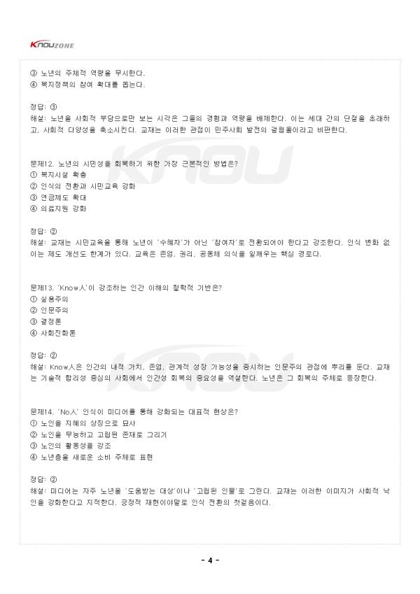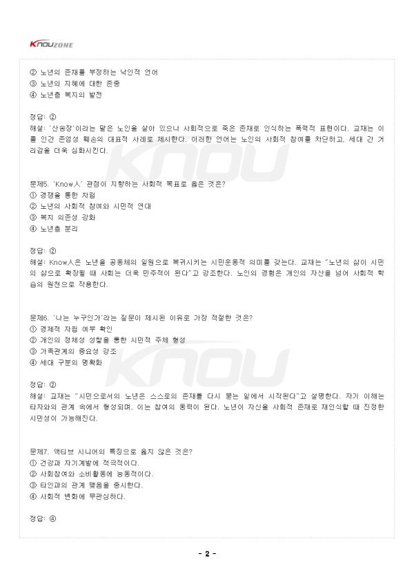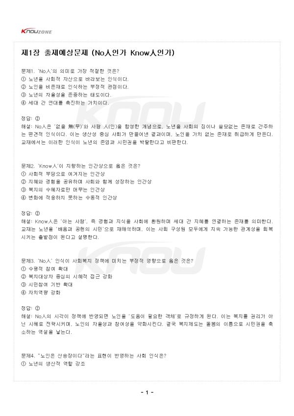 ¹®Á¦1. ¡®NoìÑ¡¯ÀÇ Àǹ̷Π°¡Àå ÀûÀýÇÑ °ÍÀº? ¨ç ³ë³âÀ» »çȸÀû ÀÚ»êÀ¸·Î ¹Ù¶óº¸´Â ÀνÄÀÌ´Ù. ¨è ³ëÀÎÀ» ºñÁ¸Àç·Î ÀνÄÇÏ´Â ºÎÁ¤Àû °üÁ¡ÀÌ´Ù. ¨é ³ë³âÀÇ ÀÚÀ²¼ºÀ» Á¸ÁßÇϴ ŵµÀÌ´Ù. ¨ê ¼¼´ë °£ ¿¬´ë¸¦ ÃËÁøÇÏ´Â °¡Ä¡ÀÌ´Ù. Á¤´ä: ¨è ÇØ¼³: NoìÑÀº ¡®¾øÀ» Ùí(¹«)¡¯¿Í »ç¶÷ ìÑ(ÀÎ)À» ÇÕ¼ºÇÑ °³³äÀ¸·Î, ³ë³âÀ» »çȸÀÇ ÁüÀ̳ª ¾µ¸ð¾ø´Â Á¸Àç·Î °£ÁÖÇÏ´Â Æí°ßÀû ÀνÄÀÌ´Ù. ÀÌ´Â »ý»ê¼º Á᫐ »çȸ°¡ ¸¸µé¾î³½ °á°úÀ̸ç, ³ëÀÎÀ» °¡Ä¡ ¾ø´Â Á¸Àç·Î Ãë±ÞÇÏ°Ô ¸¸µç´Ù. ±³Àç¿¡¼´Â ÀÌ·¯ÇÑ ÀνÄÀÌ ³ë³âÀÇ Á¸¾ö°ú ½Ã¹Î±ÇÀ» ¹ÚÅ»ÇÑ´Ù°í ºñÆÇÇÑ´Ù. ¹®Á¦2. ¡®KnowìÑ¡¯ÀÌ ÁöÇâÇÏ´Â Àΰ£»óÀ¸·Î ¿ÇÀº °ÍÀº? ¨ç »çȸÀû ºÎ´ãÀ¸·Î ¿©°ÜÁö´Â Àΰ£»ó ¨è ÁöÇý¿Í °æÇèÀ» °øÀ¯ÇÏ¸ç »çȸ¿Í ÇÔ²² ¼ºÀåÇÏ´Â Àΰ£»ó ¨é º¹ÁöÀÇ ¼öÇýÀڷθ¸ ¸Ó¹«´Â Àΰ£»ó ¨ê º¯È¿¡ ÀûÀÀÇÏÁö ¸øÇÏ´Â ¼öµ¿Àû Àΰ£»ó Á¤´ä: ¨è ÇØ¼³: KnowìÑÀº ¡®¾Æ´Â »ç¶÷¡¯, Áï °æÇè°ú Áö½ÄÀ» »çȸ¿¡ ȯ¿øÇÏ¸ç ¼¼´ë °£ ÁöÇý¸¦ ¿¬°áÇÏ´Â Á¸À縦 ÀǹÌÇÑ´Ù. ±³Àç´Â ³ë³âÀ» ¡®¹è¿ò°ú °øÇåÀÇ ½Ã¹Î¡¯À¸·Î ÀçÇØ¼®Çϸç, ÀÌ´Â »çȸ ±¸¼º¿ø ¸ðµÎ¿¡°Ô Áö¼Ó °¡´ÉÇÑ °ü°è¼ºÀ» ȸº¹½ÃŰ´Â Ãâ¹ßÁ¡ÀÌ µÈ´Ù°í ¼³¸íÇÑ´Ù. ¹®Á¦3. ¡®NoìÑ¡¯ ÀνÄÀÌ »çȸº¹Áö Á¤Ã¥¿¡ ¹ÌÄ¡´Â ºÎÁ¤Àû ¿µÇâÀ¸·Î ¿ÇÀº °ÍÀº? ¨ç ¼öÆòÀû Âü¿© È®´ë ¨è º¹Áö´ë»óÀÚ Áß½ÉÀÇ ½ÃÇýÀû Á¢±Ù °È ¨é ½Ã¹ÎÂü¿© ±â¹Ý È®´ë ¨ê ÀÚÄ¡¿ª·® °È Á¤´ä: ¨è ÇØ¼³: NoìÑÀÇ ½Ã°¢ÀÌ Á¤Ã¥¿¡ ¹Ý¿µµÇ¸é ³ëÀÎÀ» ¡®µµ¿òÀÌ ÇÊ¿äÇÑ °´Ã¼¡¯·Î ±ÔÁ¤ÇÏ°Ô µÈ´Ù. ÀÌ´Â º¹Áö¸¦ ±Ç¸®°¡ ¾Æ´Ñ ½ÃÇý·Î Àü¶ô½Ã۸ç, ³ëÀÎÀÇ ÀÚÀ²¼º°ú Âü¿©¼ºÀ» ¾àȽÃŲ´Ù. °á±¹ º¹ÁöÁ¦µµ´Â µ¹º½ÀÇ À̸§À¸·Î ½Ã¹Î±ÇÀ» Ãà¼ÒÇÏ´Â ¿ª¼³À» ³º´Â´Ù. ¹®Á¦4. ¡°³ëÀÎÀº »ê¼ÛÀåÀÌ´Ù¡±¶ó´Â Ç¥ÇöÀÌ ¹Ý¿µÇÏ´Â »çȸ ÀνÄÀº? ¨ç ³ë³âÀÇ »ý»êÀû ¿ªÇÒ °Á¶ ¨è ³ë³âÀÇ Á¸À縦 ºÎÁ¤ÇÏ´Â ³«ÀÎÀû ¾ð¾î ¨é ³ë³âÀÇ ÁöÇý¿¡ ´ëÇÑ Á¸Áß ¨ê ³ë³âÃþ º¹ÁöÀÇ ¹ßÀü Á¤´ä: ¨è ÇØ¼³: ¡®»ê¼ÛÀ塯À̶ó´Â ¸»Àº ³ëÀÎÀ» »ì¾Æ ÀÖÀ¸³ª »çȸÀûÀ¸·Î Á×Àº Á¸Àç·Î ÀνÄÇÏ´Â Æø·ÂÀû Ç¥ÇöÀÌ´Ù. ±³Àç´Â À̸¦ Àΰ£ Á¸¾ö¼º ÈѼÕÀÇ ´ëÇ¥Àû »ç·Ê·Î Á¦½ÃÇÑ´Ù. ÀÌ·¯ÇÑ ¾ð¾î´Â ³ëÀÎÀÇ »çȸÀû Âü¿©¸¦ Â÷´ÜÇϰí, ¼¼´ë °£ °Å¸®°¨À» ´õ¿í ½ÉȽÃŲ´Ù. ¹®Á¦5. ¡®KnowìÑ¡¯ °üÁ¡ÀÌ ÁöÇâÇÏ´Â »çȸÀû ¸ñÇ¥·Î ¿ÇÀº °ÍÀº? ¨ç °æÀïÀ» ÅëÇÑ ÀÚ¸³ ¨è ³ë³âÀÇ »çȸÀû Âü¿©¿Í ½Ã¹ÎÀû ¿¬´ë ¨é º¹Áö ÀÇÁ¸¼º °È ¨ê ³ë³âÃþ ºÐ¸® Á¤´ä: ¨è ÇØ¼³: KnowìÑÀº ³ë³âÀ» °øµ¿Ã¼ÀÇ ÀÏ¿øÀ¸·Î º¹±Í½ÃŰ´Â ½Ã¹Î¿îµ¿Àû Àǹ̸¦ °®´Â´Ù. ±³Àç´Â ¡°³ë³âÀÇ »îÀÌ ½Ã¹ÎÀÇ »îÀ¸·Î È®ÀåµÉ ¶§ »çȸ´Â ´õ¿í ¹ÎÁÖÀûÀÌ µÈ´Ù¡±°í °Á¶ÇÑ´Ù. ³ëÀÎÀÇ °æÇèÀº °³ÀÎÀÇ ÀÚ»êÀ» ³Ñ¾î »çȸÀû ÇнÀÀÇ ¿øÃµÀ¸·Î ÀÛ¿ëÇÑ´Ù. ¹®Á¦6. ¡®³ª´Â ´©±¸Àΰ¡¡¯¶ó´Â Áú¹®ÀÌ Á¦½ÃµÈ ÀÌÀ¯·Î °¡Àå ÀûÀýÇÑ °ÍÀº? ¨ç °æÁ¦Àû ÀÚ¸³ ¿©ºÎ È®ÀÎ ¨è °³ÀÎÀÇ Á¤Ã¼¼º ¼ºÂûÀ» ÅëÇÑ ½Ã¹ÎÀû ÁÖü Çü¼º ¨é °¡Á·°ü°èÀÇ Á߿伺 °Á¶ ¨ê ¼¼´ë ±¸ºÐÀÇ ¸íÈ®È Á¤´ä: ¨è ÇØ¼³: ±³Àç´Â ¡°½Ã¹ÎÀ¸·Î¼ÀÇ ³ë³âÀº ½º½º·ÎÀÇ Á¸À縦 ´Ù½Ã ¹¯´Â ÀÏ¿¡¼ ½ÃÀ۵ȴ١±°í ¼³¸íÇÑ´Ù. ÀÚ±â ÀÌÇØ´Â ŸÀÚ¿ÍÀÇ °ü°è ¼Ó¿¡¼ Çü¼ºµÇ¸ç, ÀÌ´Â Âü¿©ÀÇ µ¿·ÂÀÌ µÈ´Ù. ³ë³âÀÌ ÀÚ½ÅÀ» »çȸÀû Á¸Àç·Î ÀçÀνÄÇÒ ¶§ ÁøÁ¤ÇÑ ½Ã¹Î¼ºÀÌ °¡´ÉÇØÁø´Ù. - Áß·« - |