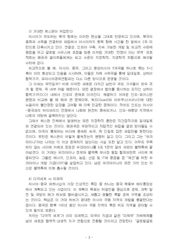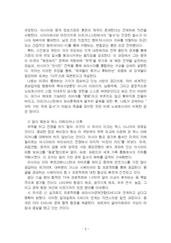 ±¹Á¦ Á¤Ä¡ÀÇ ÁÖ ÇàÀ§ÀÚ´Â ±¹°¡ÀÌ´Ù. üÁ¦¼öÁØ¿¡¼ ±¹Á¦Çù·ÂÀÇ ¼ºÃë°¡ °¡´ÉÇÒ ¶§´Â ¾ç±ØÃ¼Á¦ ÇÏ¿¡¼ Àû´ëÁø¿µ °£¿¡ ÈûÀÇ ±ÕÇüÀÌ ÀÌ·ç¾îÁ® Àְųª ¼¼°èÁ¤ºÎÀÇ ¿ªÇÒÀ» ¼öÇàÇÏ´Â °·ÂÇÑ ±¹°¡°¡ Á¸ÀçÇÒ ¶§ »ÓÀÌ´Ù. ÆäÆä ¿¡½ºÄÚ¹Ù¾ßÀÇ Àú¼´Â 21¼¼±â ±¹Á¦ Á¤¼¼ÀÇ °Ýº¯°ú ¼¼°èÁú¼ÀÇ ÀçÆíÀ» ޱ¸ÇÏ´Â ÀÛǰÀÌ´Ù. ÀúÀÚ°¡ ¿©·¯ ¸Åü¿¡ °ÔÀçµÈ Ä®·³°ú ¿¡¼¼À̵éÀ» ¸ðÀº °ÍÀ¸·Î, ´Ù¾çÇÑ Áö¸®Àû, ÁöÁ¤ÇÐÀû, °æÁ¦Àû ¿äÀÎÀ» º¹ÇÕÀûÀ¸·Î ºÐ¼®ÇÑ´Ù. ÀúÀÚ´Â ±Ù·¡ ¿©·¯ »ç°ÇµéÀ» ÃÎÃÎÈ÷ ¿¬°áÇϸç, ±âÁ¸ÀÇ ÆÐ±Ç Áú¼°¡ ¹«³ÊÁö°í »õ·Î¿î ´Ù±ØÃ¼Á¦¿Í Àü·«Àû º¯È°¡ ÀϾ°í ÀÖÀ½À» ¿ª¼³ÇÑ´Ù. ±×·¯³ª ±× °úÁ¤¿¡¼ Á¦½ÃÇÏ´Â ÁÖÀåÀº ¶§·Î Áö³ªÄ¡°Ô °úµµÇÑ ±â´ë¸¦ ºÒ·¯ÀÏÀ¸Å³ ¼ö ÀÖÀ¸¸ç, Çö½ÇÀÇ º¹À⼺°ú ´Ù¸é¼ºÀ» °£°úÇÏ´Â ±¸¼®µµ Á¸ÀçÇÑ´Ù. ÀÌ Ã¥ÀÌ º¸¿©ÁÖ´Â ¿©·¯ ÁÖÀåµéÀ» ºñÆÇÀû ½Ã°¢À¸·Î ¼¼úÇϰí, µ¿½Ã¿¡ ³»Æ÷µÈ À̳äÀû ¹æÇ⼺°ú Çö½ÇÀû ÇÔÀǸ¦ Æò°¡ÇÏ´Â µ¥ ÁßÁ¡À» µÐ´Ù. º£ÀÌ¡°ú ¸ð½ºÅ©¹Ù ÁöµµºÎÀÇ ÃÖ¿ì¼± °úÁ¦´Â ¿µ¿øÇÑ ÀüÀïÀÌ ¾Æ´Ï¶ó Áß±¹°ú ·¯½Ã¾Æ¸¦ ¹®¸í±¹°¡·Î¼ ÅëÇÕÀûÀ¸·Î À¯ÁöÇÏ´Â °ÍÀÌ´Ù. ¼±¸¿Í´Â Á¤¹Ý´ëµÇ´Â ¹®ÈÀû ÀÌÇØ¸¦ ÀǹÌÇÑ´Ù. Áß±¹ÀεéÀº ¿ª»çÀûÀ¸·Î ±¹°¡¿Í »çȸ¸¦ Çϳª·Î ÀνÄÇØ ¿ÔÀ¸¸ç, ±¹°¡´Â °¡Á·ÀÇ °¡ÀåÀÌÀÚ Áß±¹ ¹®¸íÀÇ ±¸Çöü·Î ¿©°ÜÁ³´Ù. Ǫƾ Ä¡ÇÏÀÇ ·¯½Ã¾ÆÀεéÀº ÃÖ±Ù ´ë¼±¿¡¼ ±Ø¸íÇÏ°Ô µå·¯³µµíÀÌ, ÀÌ·¯ÇÑ °üÁ¡À» °í¼öÇϰí ÀÖ´Ù. ÀúÀÚ¿¡ µû¸£¸é ÇöÀç ¹ú¾îÁö°í ÀÖ´Â ¼¼°èÀû Ãæµ¹Àº 'ÇÏÆ®·£µå ´ë Å»¶ó¼ÒÅ©¶óÄ¡¾Æ, ȤÀº À¯¶ó½Ã¾Æ ´ë ³ªÅ佺ź'À¸·Î ±ÔÁ¤ÇÒ ¼ö ÀÖ´Ù. ÀÌ·¯ÇÑ ÀüüÀû °üÁ¡À» ÆÄ¾ÇÇÏÁö ¸øÇÏ¸é ¼¼°è °÷°÷¿¡¼ ¹ú¾îÁö´Â ÀüÀïµéÀ» ¼·Î ºÐ¸®µÇ°í µ¶¸³ÀûÀÎ »ç°ÇÀ¸·Î¸¸ °£ÁÖÇÏ´Â À§ÇèÀÌ ÀÖ´Ù. ƯÈ÷ ÁÂÆÄ´Â 'µÑ ´Ù ¾Æ´Ï´Ù'¶ó´Â ŵµ¿¡ ºüÁö±â ½¬¿îµ¥, »ç½Ç»ó ¹Ì±¹ Á¦±¹ÁÖÀǸ¦ Àº¹ÐÈ÷ ÁöÁöÇÏ´Â °Í°ú ´Ù¸§¾ø´Ù. ÀÌ ·¹Æ÷Æ®´Â ¼¼°èÀÇÁ¤Ä¡¿Í°æÁ¦ ±³À縦 Àаí, ÀÌ¿¡ ±Ù°ÅÇØ Âü°íµµ¼ Áß '´Ù±Ø¼¼°è°¡ ¿Â´Ù'¸¦ Àаí ÀÌ¿¡ ´ëÇÑ ¼ÆòÀ» ºñÆÇÀûÀ¸·Î ÀÛ¼ºÇÏ¿´´Ù. II. º» ·Ð 1. Ã¥ÀÇ ÁÖ¿ä ³»¿ë 1) 3Â÷ ¼¼°è´ëÀü°ú ¹ÝÀüÅë»óÀÇ ÁöÁ¤ÇÐ ¹Ì±¹ ÁÖ·ù »çȸ°¡ "À§Çù"À¸·Î ±ÔÁ¤ÇÑ ¹®¸í ±¹°¡ ·¯½Ã¾Æ¿Í Áß±¹ÀÇ ´ë°á. ÀÌ Ãæµ¹Àº ¹Ì±¹ ÁߺΠ´ë ÇØ¾ç Áö¹è üÁ¦, ¶Ç´Â À¯¶ó½Ã¾Æ ´ë ³ªÅä ¿¬¸ÍÀ¸·Îµµ º¼ ¼ö ÀÖ´Ù. ÀúÀڴ å Àü¹Ý¿¡ °ÉÃÄ Áß±¹°ú ·¯½Ã¾Æ°¡ ±Û·Î¹ú ÆÐ±ÇÀÇ ÇÙ½É ÃàÀ¸·Î ºÎ»óÇϰí ÀÖÀ½À» ÁÖÀåÇÑ´Ù. ·¯½Ã¾Æ¿Í Áß±¹ Á¤º¸±â°üÀº È¥µ·ÀÇ Á¦±¹ÀÌ Á¸ÀçÇÑ´Ù´Â ÀüÁ¦ÇÏ¿¡ ÀÛÀüÀ» ¼öÇàÇÑ´Ù. ½Ã¸®¾Æ¿¡¼¿Í ¸¶Âù°¡Áö·Î ¾ÆÇÁ°¡´Ï½ºÅº¿¡¼ÀÇ "ö¼ö"´Â ÁøÁ¤ÇÑ Ã¶¼ö°¡ ¾Æ´Ï¶ó Àç¹èÄ¡¿¡ ºÒ°úÇß´Ù. ³²Àº °ÍÀº Á÷Á¢ÀûÀÎ ÇàÀ§ÀÚ(½Ã¸®¾Æ ¼®À¯¸¦ ¾àÅ»ÇÏ´Â ¹Ì±º) ¶Ç´Â °£Á¢ÀûÀÎ ÇàÀ§ÀÚ(ISIS-K)¸¦ ÅëÇØ ÀÚÇàµÇ´Â, º¯ÇÔ¾ø´Â È¥¶õ Á¶Àå Àü·«»ÓÀÌ´Ù. ƯÈ÷, ½ÃÁøÇΰú ǪƾÀÌ °¢°¢ ÁÖµµÇÏ´Â Áö¿ª ³×Æ®¿öÅ©¿Í Àü·« µ¿¹ÝÀÚ °ü°è¸¦ ÅëÇØ ±âÁ¸ÀÇ ¹Ì±¹ ÁÖµµ Áú¼¸¦ ºØ±«½ÃŰ·Á´Â ¿òÁ÷ÀÓÀ» °Á¶ÇÑ´Ù. ÀÌ °úÁ¤¿¡¼ ±×´Â Áß±¹ÀÌ ¹Ì±¹ÀÇ ¡°ÆÐ±ÇÀ¯Áö¡± Á¤Ã¥¿¡ ÀúÇ×ÇÏ¸ç ¡®¹«¿ª¡¯À» ¹«±â·Î »õ ÆÐ±Ç Àü·«À» ½ÇõÇÏ´Â ¸ð½À°ú, ·¯½Ã¾Æ°¡ ¡®¹Ý½Ä¹Î¡¯ Àü·«À» ÅëÇØ À¯¶ó½Ã¾Æ¸¦ ÅëÇÕÇÏ´Â ±¸»óÀ» »ó¼¼È÷ ¼³¸íÇÑ´Ù. ÀúÀÚ´Â ÀÌ·¯ÇÑ ÁÖÀåÀ» ÅëÇØ, ¡®Á¦±¹µéÀÌ Áװųª ÈÄÅðÇϴ¡¯ ¿ÍÁß¿¡ »õ °±¹µéÀÌ µîÀåÇÏ¸ç ¼¼°è´Â ¡®´Ù±Ø¡¯À¸·Î ÀçÆíµÈ´Ù°í ¿ª¼³ÇÑ´Ù. ³ªÅä´Â ¹Ì±¹ÀÌ ÅëÁ¦ÇÏ´Â ±â±¸°¡ Á¡À¯Çϰí ÀÖ´Â ¼¹æÀÇ °ø°£À¸·Î, ¸¶Ä¡ ¼¼°èÀûÀÎ ·Îº¸Ä°Ã³·³ ÇൿÇÏ¸ç ºÏ´ë¼¾ç»Ó¸¸ ¾Æ´Ï¶ó ¾ÆÇÁ¸®Ä«, ³²Áß±¹ÇØ, ±×¸®°í °áÁ¤ÀûÀ¸·Î ³ëº¸·Î½Ã¾ßÀÇ ½ºÅÜ Áö´ë±îÁö °¨½ÃÇÒ ±ÇÇÑÀ» ½º½º·Î ºÎ¿©¹Þ¾Ò´Ù°í º¸´Â °ÍÀÌ Å¸´çÇÏ´Ù. ¿©±â¼ Á¦´ë·Î ±â´ÉÇÏ´ø ¸®ºñ¾Æ¸¦ "ÆòÈ"¶ó°í ºÎ¸£Áöµµ ¾Ê°í Ȳ¹«Áö·Î ¸¸µé¾î ¹ö¸®°í, ¾ÆÇÁ°¡´Ï½ºÅº¿¡¼ ÆÄ½´Å÷Á·¿¡°Ô öÀúÈ÷ ±¼¿åÀ» ´çÇÑ ÈÄ, ³ªÅä°¡ °Á¦ÇÏ´Â "±ÔÄ¢ ±â¹Ý ±¹Á¦ Áú¼"°¡ ¸¶Ä§³» Á×À½À» ¸ÂÀÌÇÑ °÷Àº ¹Ù·Î ³ëº¸·Î½Ã¾ßÀÇ ºñ¿ÁÇÑ °ËÀº ¶¥ÀÌ´Ù. 2) ´Þ·¯ ÆÐ±Ç°ú ÆÅ½º ¾Æ¸Þ¸®Ä«³ª ÀÌÈÄ ¹«¿ªÀ» Çϰí ÀüÀïÀ» ÇÏÁö ¸»¶ó. À̰ÍÀÌ ½Ã ÁÖ¼®ÀÌ À̲ô´Â ÆÅ½º ½Ã´ÏÄ«ÀÇ ¸ðÅäÀÏ °ÍÀÌ´Ù. Áß¿äÇÑ Á¡Àº º£ÀÌ¡ÀÌ Ç×»ó ¹Ì ±¹¹æºÎÀÇ ¹«·Â ¿Ü±³¿¡ ÀÇÁ¸ÇØ ¿Â ÆÅ½º ¾Æ¸Þ¸®Ä«³ª¸¦ ´ëüÇÏ
