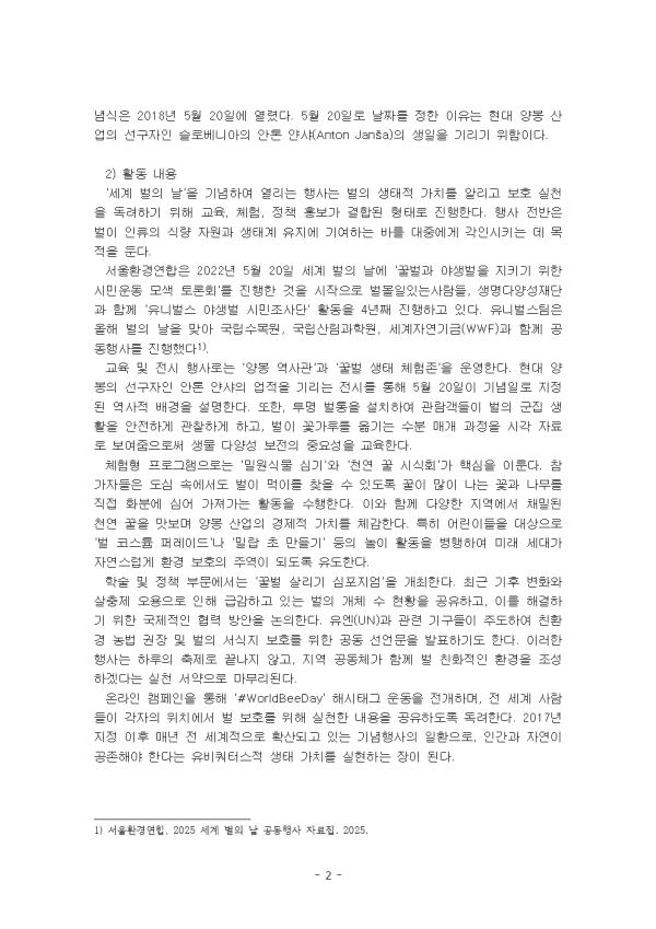 ¼­¿ïȯ°æ¿¬ÇÕÀº 2022³â 5¿ù 20ÀÏ ¼¼°è ¹úÀÇ ³¯¿¡ '²Ü¹ú°ú ¾ß»ý¹úÀ» Áö۱â À§ÇÑ ½Ã¹Î¿îµ¿ ¸ð»ö Åä·Ðȸ'¸¦ ÁøÇàÇÑ °ÍÀ» ½ÃÀÛÀ¸·Î ¹úº¼ÀÏÀִ»ç¶÷µé, »ý¸í´Ù¾ç¼ºÀç´Ü°ú ÇÔ²² 'À¯´Ï¹ú½º ¾ß»ý¹ú ½Ã¹ÎÁ¶»ç´Ü' Ȱµ¿À» 4³â° ÁøÇàÇϰí ÀÖ´Ù. À¯´Ï¹ú½ºÆÀÀº ¿ÃÇØ ¹úÀÇ ³¯À» ¸Â¾Æ ±¹¸³¼ö¸ñ¿ø, ±¹¸³»ê¸²°úÇпø, ¼¼°èÀÚ¿¬±â±Ý(WWF)°ú ÇÔ²² °øµ¿Çà»ç¸¦ ÁøÇàÇß´Ù.