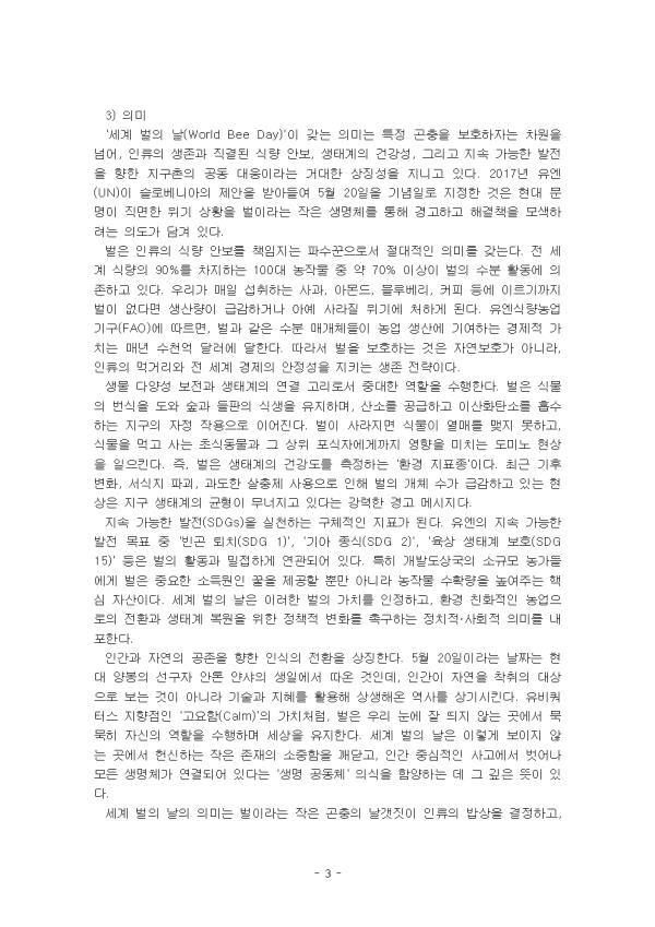 ²Ü¹úÀº Àü ¼¼°è ½Ä·® »ý»ê°ú »ýÅÂ°è º¸È£¿¡ Áß¿äÇÑ ¿ªÇÒÀ» ´ã´çÇϸç, À¯¿£ ½Ä·®³ó¾÷±â±¸(FAO)¿¡ µû¸£¸é ¼¼°è 100´ë ÀÛ¹° Áß 71%°¡ ²Ü¹úÀ» ¸Å°³·Î ¼öºÐÇϰí ÀÖ´Ù. ÇÏÁö¸¸, ³ó¾à »ç¿ë Áõ°¡, ±âÈÄ º¯È­, ¼­½ÄÁö ÆÄ±«, Áúº´ µî º¹ÇÕÀûÀÎ ¿äÀÎÀ¸·Î ²Ü¹ú °³Ã¼¼ö °¨¼Ò Çö»óÀÌ Áö¼ÓµÇ°í ÀÖ´Ù°í ÇÑ´Ù. ²Ü¹úÀÌ »ç¶óÁø´Ù¸é, ¿ì¸®´Â ´õ ÀÌ»ó ¸ÀÀÖ´Â ²ÜÀ» ¸Àº¼ ¼ö ¾øÀ» »Ó¸¸ ¾Æ´Ï¶ó, »ç°ú, µþ±â, ¾Æ¸óµå µî ¼ö¸¹Àº ÀÛ¹°ÀÇ ¼öºÐÀÌ ÀÌ·ç¾îÁöÁö ¾Ê¾Æ ½Ä·® »ý»ê¿¡ Â÷ÁúÀÌ ºÒ°¡ÇÇÇÏ´Ù.