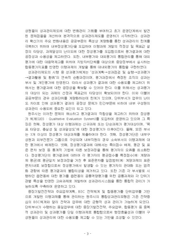 . À̸¦ À§ÇÏ¿© BSC ¼º°ú°ü¸®Ã¼°è µµÀÔÀ» À§ÇÑ ÄÁ¼³ÆÃÀ» ÅëÇØ BSC Àü·«Ã¼°è¸¦ ±¸ÃàÇÏ¿´À¸³ª, Áö¹æÀÚÄ¡´ÜüÀÇ Æ¯¼º»ó ¼º°ú°ü¸®¿Í ¼º°úÆò°¡ÀÇ ±ÕÇüÀÌ ÀÌ·ç¾îÁ®¾ß Çϸç, ±âÁ¸¿¡ ³»ºÎÀûÀ¸·Î ¿î¿µÁßÀÎ ¡®ÀÚüÆò°¡¡¯ÀÇ BSC·ÎÀÇ ÅëÇÕÀÌ ÇÊ¿äÇÏ´Ù´Â Á¡À» ÀÎÁöÇÏ¿´´Ù. ¶ÇÇÑ, ½ÃÀÇ Çٽɾ÷¹«¿Í ½ÃÃ¥µé¿¡ ´ëÇÑ ¼º°ú°ü¸®ÀÇ ¿¬°è¸¦ ÅëÇØ Àü·«°ú ¾÷¹«ÀÇ ±ÕÇüÀû ¼º°ú°ü¸®ÀÇ Çʿ伺ÀÌ ´ëµÎµÇ¾ú´Ù. ±×·¯³ª Ãʱ⠵µÀÔµÈ BSC ¼º°ú°ü¸®Ã¼°è´Â Çٽɼº°úÁöÇ¥Áß½ÉÀ¸·Î ±¸¼ºµÇ¾î ÀÖ¾î Àü·«°ú ¾÷¹«ÀÇ ¿¬°è ¹× ³»ºÎÆò°¡Ã¼°èÀÇ ÅëÇÕÀ» À§ÇÑ °úÁ¦Áß½ÉÀÇ °ü¸®¿¡ ÇѰ谡 ÀÖÀ½À» ¹ß°ßÇÏ¿´´Ù. ÀÌ¿¡ Áö¹æÀÚÄ¡´ÜüÀÇ Æ¯¼ºÀ» °í·ÁÇÑ ÀÌÇà°úÁ¦ Áß½ÉÀÇ ¼º°ú°ü¸®ÀÇ Çʿ伺ÀÌ Á¦±âµÇ¾î ¿øÁֽà ¹× Áö¹æÀÚÄ¡´ÜüÀÇ Æ¯¼ºÀÌ °í·ÁµÈ ƯȭµÈ BSC±â¹ÝÀÇ ÅëÇÕ¼º°ú°ü¸®¸ðÇüÀÇ °³¹ßÀ» ÃßÁøÇÏ°Ô µÇ¾ú´Ù.