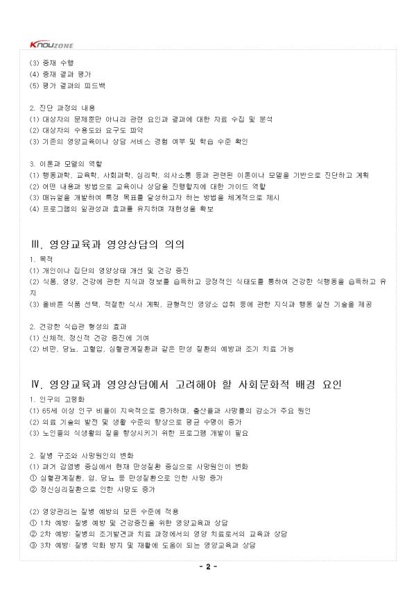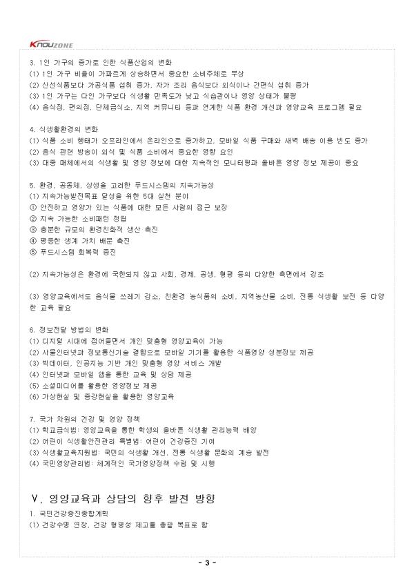 ¥°. ¿µ¾ç±³À°°ú ¿µ¾ç»ó´ãÀÇ °³³ä 1. ¿µ¾ç±³À°ÀÇ Á¤ÀÇ (1) °³ÀÎÀ̳ª Áý´ÜÀÌ °Ç°°ú ¿µ¾ç »óŸ¦ °³¼±Çϵµ·Ï ½Äǰ ¼±Åðú ½Ä»ç °ü·Ã ÇൿÀ» ÀÚ¹ßÀûÀ¸·Î ½ÀµæÇϰí À¯ÁöÇÏ´Â °úÁ¤ (2) ȯ°æÀû Áö¿øÀ» Æ÷ÇÔÇÏ¸ç °³ÀÎ ¶Ç´Â Áý´ÜÀÌ ´õ °Ç°ÇÑ ½ÄÇൿÀ» äÅÃÇϰí À¯ÁöÇÒ ¼ö ÀÖµµ·Ï ÇÔ (3) °ú°Å¿¡´Â »ý¹°ÇÐÀû, ÀÇÇÐÀû °üÁ¡¿¡¼ °³ÀÎ Â÷¿øÀÇ ±³À°¿¡ ÁßÁ¡À» µÒ (4) ÇöÀç´Â »çȸ°úÇÐ, ³ó¾÷, °æÁ¦ÇÐ µîÀÇ ¿µ¿ªÀ» Æ÷ÇÔÇϰí Ǫµå½Ã½ºÅÛÀ» °í·ÁÇÑ °Ç°Çϰí Áö¼Ó°¡´ÉÇÑ ½Ä»ýȰ ±³À°À¸·Î È®Àå 2. ¿µ¾ç»ó´ãÀÇ Á¤ÀÇ (1) ¿µ¾ç±³À°°ú À¯»çÇÑ ¸ñÇ¥¸¦ °¡Áö°í ÀÖÁö¸¸ °³º° ´ë»óÀÚ¿¡ Æ¯ÈµÈ °úÁ¤ (2) ´ë»óÀÚÀÇ °Ç°ÇÑ ½Ä»ýȰÀ» À§ÇÑ ¿µ¾ç ¿ä±¸¸¦ ÃæÁ·½ÃŰ°í º¯ÈÀÇ Àå¾Ö¹°À» ÇØ°á (3) ´ë»óÀÚÀÇ °æÇè, °¨Á¤, »ý°¢ ¹× Çൿ¿¡ ÁßÁ¡À» µÎ¸ç À߸øµÈ ½Ä½À°üÀ» °³¼±ÇÏ´Â »óÈ£ÀÛ¿ëÀÇ °úÁ¤ 3. ¿µ¾ç±³À° ¹× »ó´ãÀÇ ÇÙ½É (1) ´ë»óÀÚ°¡ ÀÚ½ÅÀÇ Çʿ信 ¸Â°Ô ÀûÀýÇÑ ½Äǰ ¹× À½½ÄÀ» ¼±ÅÃÇÏ°í °Ç°ÇÑ ½ÄÇൿÀ» À¯ÁöÇÒ ¼ö ÀÖµµ·Ï Áö¿ø°ú ¾È³»¸¦ Á¦°øÇÏ´Â °Í (2) ´Ü¼øÇÑ Á¤º¸ Àü´Þ¸¸À¸·Î´Â ÃæºÐÇÏÁö ¾ÊÀ¸¸ç, ½Äǰ ¼±Åà ¹× ½ÄÇൿ¿¡ ¿µÇâÀ» ¹ÌÄ¡´Â ´Ù¾çÇÑ ¿äÀÎÀ» ÀÌÇØÇÏ´Â °ÍÀÌ Áß¿ä (3) Áö½Ä°ú ±â¼úÀ» ÇнÀÇϰí ÇнÀÇÑ Áö½ÄÀ» ½Ä»ýȰ¿¡¼ ½ÇõÇÏ·Á´Â ŵµ¸¦ °¡Á® Áö¼ÓÀûÀÌ°í ½À°üÈµÈ ÇൿÀ¸·Î ¿¬°áÇÏ´Â °ÍÀÌ Áß¿ä - Áß·« - |