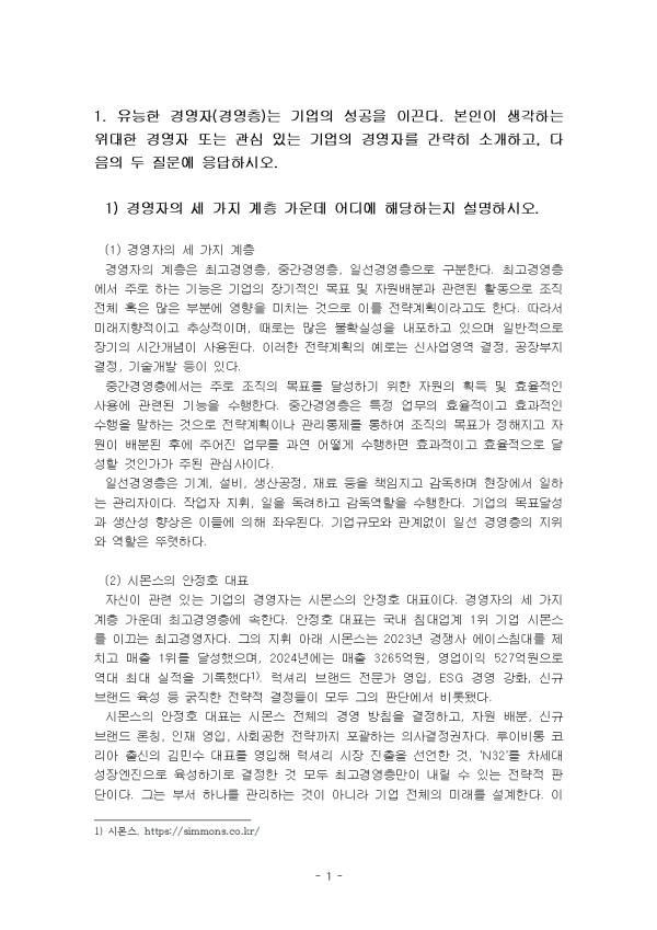 1. À¯´ÉÇÑ °æ¿µÀÚ(°æ¿µÃþ)´Â ±â¾÷ÀÇ ¼º°øÀ» À̲ö´Ù. º»ÀÎÀÌ »ý°¢ÇÏ´Â À§´ëÇÑ °æ¿µÀÚ ¶Ç´Â °ü½É ÀÖ´Â ±â¾÷ÀÇ °æ¿µÀÚ¸¦ °£·«È÷ ¼Ò°³Çϰí, ´ÙÀ½ÀÇ µÎ Áú¹®¿¡ ÀÀ´äÇϽÿÀ.