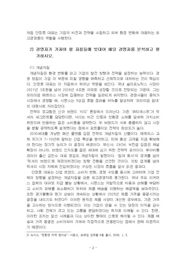 2) °æ¿µÀÚ°¡ °¡Á®¾ß ÇÒ ÀÚÁúµé¿¡ ºø´ë¾î ÇØ´ç °æ¿µÀÚ¸¦ ºÐ¼®ÇÏ°í Æò°¡ÇϽÿÀ.