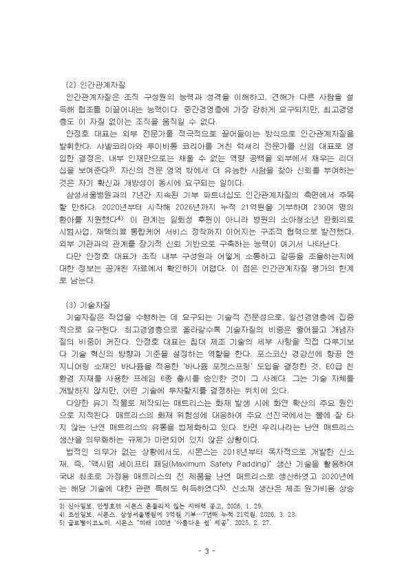 ÀÚ½ÅÀÌ °ü·Ã ÀÖ´Â ±â¾÷ÀÇ °æ¿µÀÚ´Â ½Ã¸ó½ºÀÇ ¾ÈÁ¤È£ ´ëÇ¥ÀÌ´Ù. °æ¿µÀÚÀÇ ¼¼ °¡Áö °èÃþ °¡¿îµ¥ ÃÖ°í°æ¿µÃþ¿¡ ¼ÓÇÑ´Ù. ¾ÈÁ¤È£ ´ëÇ¥´Â ±¹³» ħ´ë¾÷°è 1À§ ±â¾÷ ½Ã¸ó½º¸¦ À̲ô´Â ÃÖ°í°æ¿µÀÚ´Ù. ±×ÀÇ ÁöÈÖ ¾Æ·¡ ½Ã¸ó½º´Â 2023³â °æÀï»ç ¿¡À̽ºÄ§´ë¸¦ Á¦Ä¡°í ¸ÅÃâ 1À§¸¦ ´Þ¼ºÇßÀ¸¸ç, 2024³â¿¡´Â ¸ÅÃâ 3265¾ï¿ø, ¿µ¾÷ÀÌÀÍ 527¾ï¿øÀ¸·Î ¿ª´ë ÃÖ´ë ½ÇÀûÀ» ±â·ÏÇß´Ù ½Ã¸ó½º, https://simmons.co.kr/