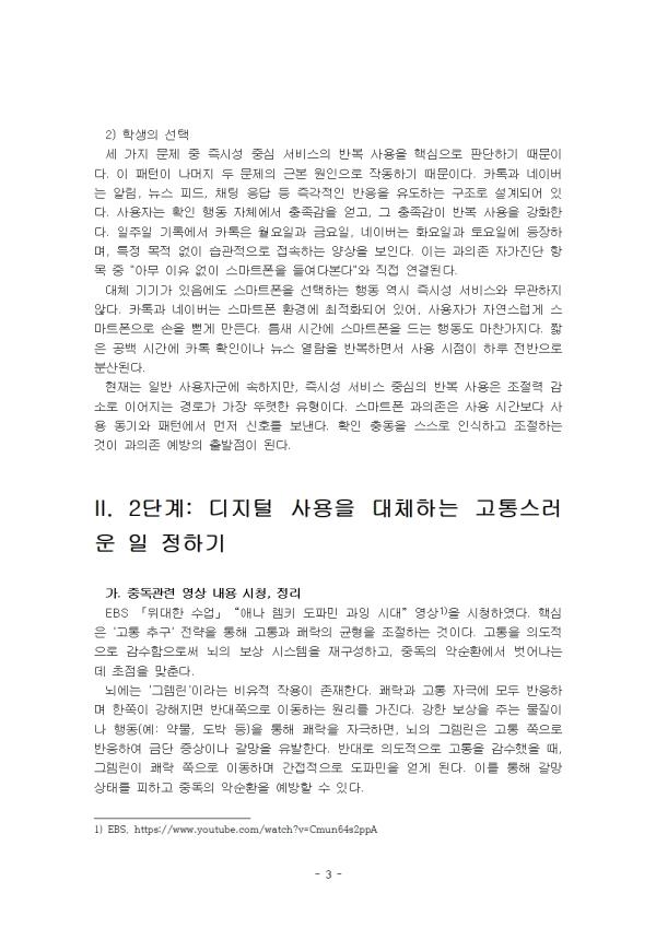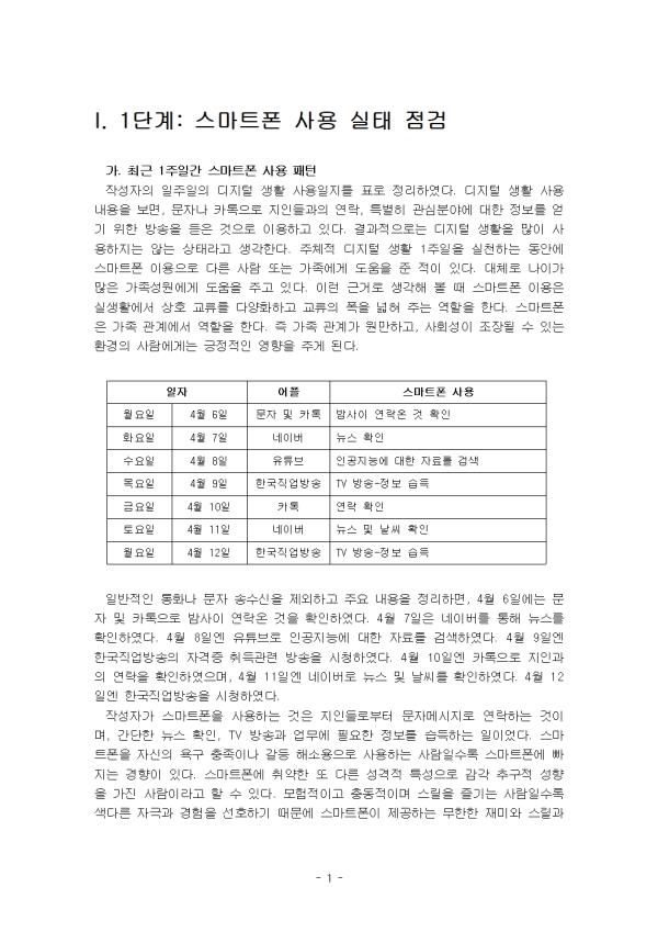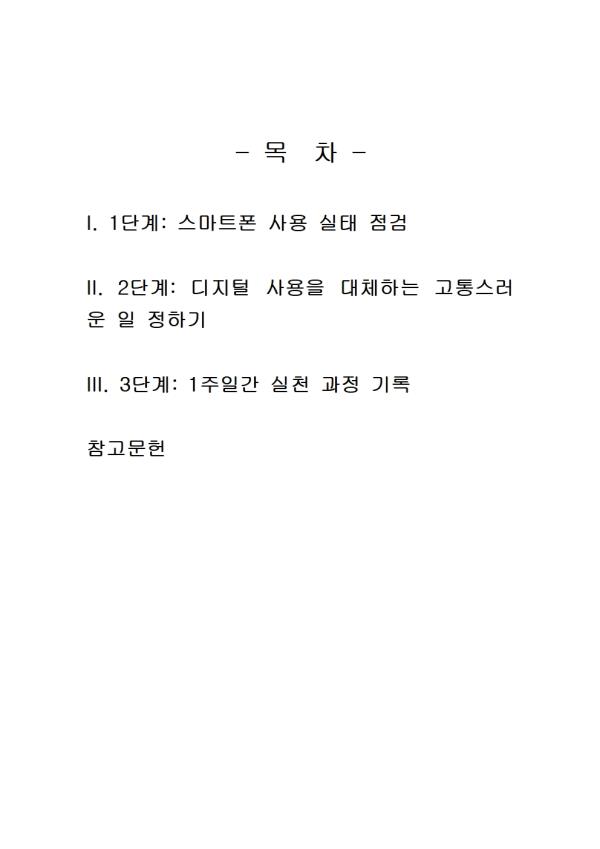 - ¸ñ Â÷ - I. 1´Ü°è: ½º¸¶Æ®Æù »ç¿ë ½ÇÅ Á¡°Ë II. 2´Ü°è: µðÁöÅÐ »ç¿ëÀ» ´ëüÇÏ´Â °íÅ뽺·¯¿î ÀÏ Á¤Çϱâ III. 3´Ü°è: 1ÁÖÀϰ£ ½Çõ °úÁ¤ ±â·Ï Âü°í¹®Çå ** ÇÔ²² Á¦°øµÇ´Â Âü°íÀÚ·á ÇÑ±ÛÆÄÀÏ ** 1. 1´Ü°è. ½º¸¶Æ®Æù »ç¿ë ½ÇÅ Á¡°Ë.hwp 2. 1´Ü°è. ½º¸¶Æ®Æù »ç¿ë ½ÇÅ Á¡°Ë2.hwp 3. 2´Ü°è. µðÁöÅÐ »ç¿ëÀ» ´ëüÇÏ´Â °íÅ뽺·¯¿î ÀÏ Á¤Çϱâ.hwp 4. 2´Ü°è. µðÁöÅÐ »ç¿ëÀ» ´ëüÇÏ´Â °íÅ뽺·¯¿î ÀÏ Á¤Çϱâ2.hwp 5. 3´Ü°è. 1ÁÖÀϰ£ ½Çõ °úÁ¤ ±â·Ï.hwp 6. 3´Ü°è. 1ÁÖÀϰ£ ½Çõ °úÁ¤ ±â·Ï2.hwp ¢ºÀÚ·á³»¿ë ¹Ì¸®º¸±â