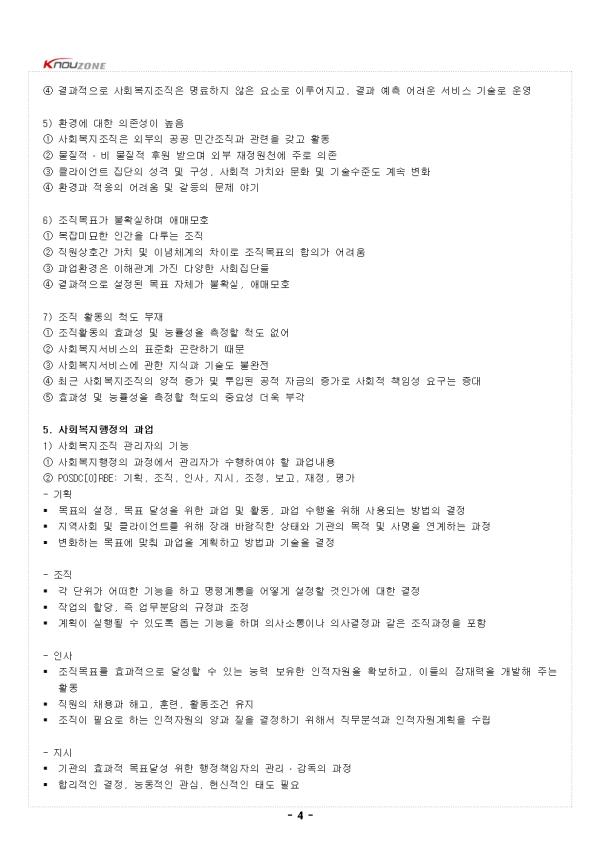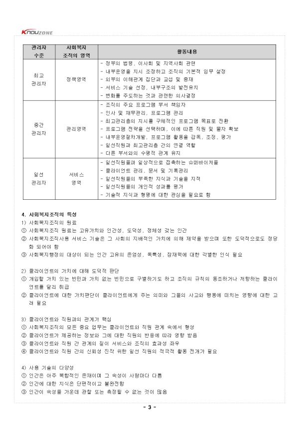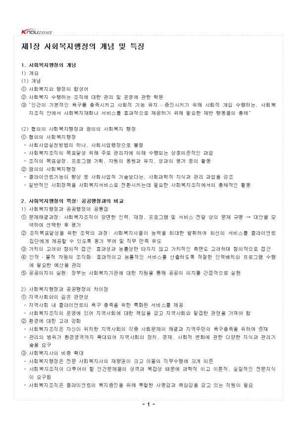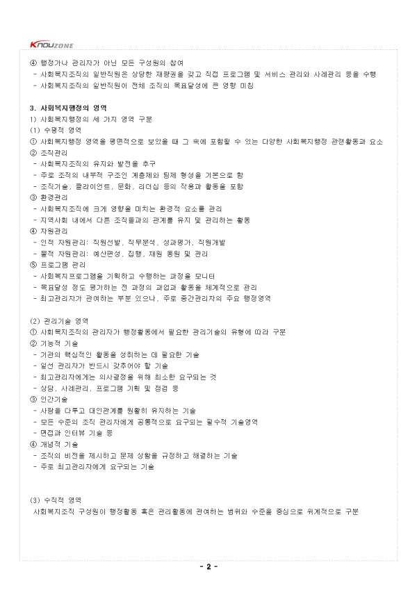 1. »çȸº¹ÁöÇàÁ¤ÀÇ °³³ä 1) °³¿ä (1) °³³ä ¨ç »çȸº¹Áö¿Í ÇàÁ¤ÀÇ ÇÕ¼º¾î ¨è »çȸº¹Áö ¼öÇàÇÏ´Â Á¶Á÷¿¡ ´ëÇÑ °ü¸® ¹× ¿î¿µ¿¡ °üÇÑ Çй® ¨é¡°Àΰ£ÀÇ ±âº»ÀûÀÎ ¿å±¸¸¦ ÃæÁ·½ÃŰ°í »çȸÀû ±â´É À¯Áö ․ ÁõÁø½Ã۱â À§ÇØ »çȸÀû °³ÀÔ ¼öÇàÇÏ´Â, »çȸº¹ÁöÁ¶Á÷ ¾È¿¡¼ »çȸº¹ÁöÀçȳª ¼ºñ½º¸¦ È¿°úÀûÀ¸·Î Á¦°øÇϱâ À§ÇØ ÇÊ¿äÇÑ Á¦¹Ý ÇൿµéÀÇ ÃÑü¡± (2) ÇùÀÇÀÇ »çȸº¹ÁöÇàÁ¤°ú ±¤ÀÇÀÇ »çȸº¹Áö ÇàÁ¤ ¨ç ÇùÀÇÀÇ »çȸº¹ÁöÇàÁ¤ - »çȸ»ç¾÷½Çõ¹æ¹ýÀÇ Çϳª, »çȸ»ç¾÷ÇàÁ¤À¸·Î ºÒ¸² - »çȸº¹ÁöÁ¶Á÷ÀÇ ¸ñÇ¥´Þ¼º À§ÇØ ÁÖ·Î °ü¸®ÀÚ¿¡ ÀÇÇØ ¼öÇàµÇ´Â »óÈ£ÀÇÁ¸ÀûÀÎ °ú¾÷ - Á¶Á÷ÀÇ ¸ñÇ¥¼³Á¤, ÇÁ·Î±×·¥ ±âȹ, ÀÚ¿øÀÇ µ¿¿ø°ú À¯Áö, ¼º°úÀÇ Æò°¡ µîÀÇ È°µ¿ ¨è ±¤ÀÇÀÇ »çȸº¹ÁöÇàÁ¤ - Ŭ¶óÀÌ¾ðÆ®±â´ÉÀÇ Çâ»ó µî »çȸ»ç¾÷Àû ±â¼úº¸´Ù´Â, »çȸ°úÇÐÀû Áö½Ä°ú °ü¸® °ú¾÷À» °Á¶ - ÀϹÝÀûÀÎ »çȸÁ¤Ã¥À» »çȸº¹Áö¼ºñ½º·Î Àüȯ½Ã۴µ¥ ÇÊ¿äÇÑ »çȸº¹ÁöÁ¶Á÷¿¡¼ÀÇ ÃÑüÀûÀΠȰµ¿ 2. »çȸº¹ÁöÇàÁ¤ÀÇ Æ¯¼º: °ø°øÇàÁ¤°úÀÇ ºñ±³ 1) »çȸº¹ÁöÇàÁ¤°ú °ø°øÇàÁ¤ÀÇ °øÅëÁ¡ ¨ç ¹®Á¦Çذá°úÁ¤: »çȸº¹ÁöÁ¶Á÷ÀÌ ´ç¸éÇÑ ÀηÂ, ÀçÁ¤, ÇÁ·Î±×·¥ ¹× ¼ºñ½º Àü´Þ »óÀÇ ¹®Á¦ ±Ô¸í ¡æ ´ë¾ÈÀ» ¸ð»öÇÏ¿© ¼±ÅÃÇÑ ÈÄ Æò°¡ ¨è Á¶Á÷¸ñÇ¥´Þ¼ºÀ» À§ÇÑ Á¶·ÂÀÇ °úÁ¤: »çȸº¹Áö»çµéÀÌ ´É·ÂÀ» ÃÖ´ëÇÑ ¹ßÈÖÇÏ¿© ÃÖ¼±ÀÇ ¼ºñ½º¸¦ Ŭ¶óÀÌ¾ðÆ® Áý´Ü¿¡°Ô Á¦°øÇÒ ¼ö ÀÖµµ·Ï µ¿±â ºÎ¿© ¹× Á÷¹« ¸¸Á· À¯µµ ¨é °¡Ä¡ÀÇ °í·Á¿Í âÀÇÀû Á¢±Ù: È¿°ú¼º°ú ´É·ü¼º¸¸ µûÁöÁö ¾Ê°í °¡Ä¡ÀûÀÎ Ãø¸éµµ °í·ÁÇϸç âÀÇÀûÀ¸·Î Á¢±Ù ¨ê ÀÎÀû ․ ¹°Àû ÀÚ¿øÀÇ Á¶Á÷È: È¿°úÀûÀÌ°í ´É·üÀûÀÎ ¼ºñ½º¸¦ »êÃâÇϵµ·Ï ÀûÀýÇÑ Àη¹èÄ¡¿Í ÇÁ·Î±×·¥ ¼öÇà¿¡ ÇÊ¿äÇÑ ¿¹»êÀ» °ü¸® ¨ë °ø°øÀÇÁöÀÇ ½ÇÇö: Á¤ºÎ´Â »çȸº¹Áö±â°ü¿¡ ´ëÇÑ Áö¿øÀ» ÅëÇØ °ø°øÀÇ ÀÇÁö¸¦ °£Á¢ÀûÀ¸·Î ½ÇÇö 2) »çȸº¹ÁöÇàÁ¤°ú °ø°øÇàÁ¤ÀÇ Â÷ÀÌÁ¡ ¨ç Áö¿ª»çȸ¿ÍÀÇ ±íÀº °ü·Ã¼º - Áö¿ª»çȸ ³» Ŭ¶óÀ̾ðÆ®ÀÇ ¿å±¸ ÃæÁ·À» À§ÇÑ Æ¯ÈµÈ ¼ºñ½º¸¦ Á¦°ø - »çȸº¹ÁöÁ¶Á÷ÀÇ ¿î¿µ¿¡ ÀÖ¾î Áö¿ª»çȸ¿¡ ´ëÇÑ Ã¥ÀÓÀ» °®°í Áö¿ª»çȸ¿Í ¹ÐÁ¢ÇÑ °ü·ÃÀ» °¡Á®¾ß ÇÔ ¨è ȯ°æ¿¡ ´ëÇÑ °í·Á °È - »çȸº¹ÁöÁ¶Á÷Àº ÀÚ½ÅÀÌ À§Ä¡ÇÑ Áö¿ª»çȸÀÇ °¢Á¾ »çȸ¹®Á¦ÀÇ ÇØ°á°ú Áö¿ªÁÖ¹ÎÀÇ ¿å±¸ÃæÁ·À» À§ÇÏ¿© Á¸Àç - °ü¸®ÀÇ ¹üÀ§°¡ ȯ°æ¿µ¿ª±îÁö È®´ëµÇ¾î Áö¿ª»çȸÀÇ Á¤Ä¡, °æÁ¦, »çȸÀû º¯È¿¡ °üÇÑ ´Ù¾çÇÑ Áö½Ä°ú °ü¸®±â¼úÀ» ¿ä±¸ ¨é »çȸº¹Áö»çÀÇ ºñÁß È®´ë - »çȸº¹ÁöÇàÁ¤Àº Àü¹® »çȸº¹Áö»çÀÇ Àç·®±ÇÀÌ Å©°í À̵éÀÇ Á÷¹«¼öÇà¿¡ Å©°Ô ÀÇÁ¸ - »çȸº¹ÁöÁ¶Á÷ÀÌ ´Ù·ç¾î¾ß ÇÒ Àΰ£¹®Á¦µéÀÇ ¼º°Ý°ú º¹À⼺ ¶§¹®¿¡ °úÇÐÀû À̰í ÀÌ·ÐÀû, ½ÇÁúÀûÀÎ Àü¹®Áö½ÄÀÌ ¿ä±¸µÊ - »çȸº¹ÁöÁ¶Á÷Àº Ŭ¶óÀ̾ðÆ®ÀÇ º¹ÁöÁõÁøÀ» À§ÇØ ÅõöÇÑ »ç¸í°¨°ú Ã¥ÀÓ°¨À» °®°í ÀÖ´Â Á÷¿øÀÌ ÇÊ¿ä ¨ê ÇàÁ¤°¡³ª °ü¸®ÀÚ°¡ ¾Æ´Ñ ¸ðµç ±¸¼º¿øÀÇ Âü¿© - »çȸº¹ÁöÁ¶Á÷ÀÇ ÀϹÝÁ÷¿øÀº »ó´çÇÑ Àç·®±ÇÀ» °®°í Á÷Á¢ ÇÁ·Î±×·¥ ¹× ¼ºñ½º °ü¸®¿Í »ç·Ê°ü¸® µîÀ» ¼öÇà - »çȸº¹ÁöÁ¶Á÷ÀÇ ÀϹÝÁ÷¿øÀÌ Àüü Á¶Á÷ÀÇ ¸ñÇ¥´Þ¼º¿¡ Å« ¿µÇâ ¹Ìħ 3. »çȸº¹ÁöÇàÁ¤ÀÇ ¿µ¿ª 1) »çȸº¹ÁöÇàÁ¤ÀÇ ¼¼ °¡Áö ¿µ¿ª ±¸ºÐ (1) ¼öÆòÀû ¿µ¿ª ¨ç »çȸº¹ÁöÇàÁ¤ ¿µ¿ªÀ» Æò¸éÀûÀ¸·Î º¸¾ÒÀ» ¶§ ±× ¼Ó¿¡ Æ÷Ç﵃ ¼ö ÀÖ´Â ´Ù¾çÇÑ »çȸº¹ÁöÇàÁ¤ °ü·ÃȰµ¿°ú ¿ä¼Ò ¨è Á¶Á÷°ü¸® - »çȸº¹ÁöÁ¶Á÷ÀÇ À¯Áö¿Í ¹ßÀüÀ» Ãß±¸ - ÁÖ·Î Á¶Á÷ÀÇ ³»ºÎÀû ±¸Á¶ÀÎ °èÃþÁ¦¿Í ÆÀÁ¦ Çü¼ºÀ» ±âº»À¸·Î ÇÔ - Á¶Á÷±â¼ú, Ŭ¶óÀ̾ðÆ®, ¹®È, ¸®´õ½Ê µîÀÇ ÀÛ¿ë°ú Ȱµ¿À» Æ÷ÇÔ ¨é ȯ°æ°ü¸® - »çȸº¹ÁöÁ¶Á÷¿¡ Å©°Ô ¿µÇâÀ» ¹ÌÄ¡´Â ȯ°æÀû ¿ä¼Ò¸¦ °ü¸® - Áö¿ª»çȸ ³»¿¡¼ ´Ù¸¥ Á¶Á÷µé°úÀÇ °ü°è¸¦ À¯Áö ¹× °ü¸®Çϴ Ȱµ¿ ¨ê ÀÚ¿ø°ü¸® - ÀÎÀû ÀÚ¿ø°ü¸®: Á÷¿ø¼±¹ß, Á÷¹«ºÐ¼®, ¼º°úÆò°¡, Á÷¿ø°³¹ß - ¹°Àû ÀÚ¿ø°ü¸®: ¿¹»êÆí¼º, ÁýÇà, Àç¿ø µ¿¿ø ¹× °ü¸® ¨ë ÇÁ·Î±×·¥ °ü¸® - »çȸº¹ÁöÇÁ·Î±×·¥À» ±âȹÇÏ°í ¼öÇàÇÏ´Â °úÁ¤À» ¸ð´ÏÅÍ - ¸ñÇ¥´Þ¼º Á¤µµ Æò°¡ÇÏ´Â Àü °úÁ¤ÀÇ °ú¾÷°ú Ȱµ¿À» ü°èÀûÀ¸·Î °ü¸® - ÃÖ°í°ü¸®ÀÚ°¡ °ü¿©ÇÏ´Â ºÎºÐ ÀÖÀ¸³ª, ÁÖ·Î Áß°£°ü¸®ÀÚÀÇ ÁÖ¿ä ÇàÁ¤¿µ¿ª (2) °ü¸®±â¼ú ¿µ¿ª ¨ç »çȸº¹ÁöÁ¶Á÷ÀÇ °ü¸®ÀÚ°¡ ÇàÁ¤È°µ¿¿¡¼ ÇÊ¿äÇÑ °ü¸®±â¼úÀÇ À¯Çü¿¡ µû¶ó ±¸ºÐ ¨è ±â´ÉÀû ±â¼ú - ±â°üÀÇ ÇÙ½ÉÀûÀΠȰµ¿À» ¼ºÃëÇÏ´Â µ¥ ÇÊ¿äÇÑ ±â¼ú - Àϼ± °ü¸®ÀÚ°¡ ¹Ýµå